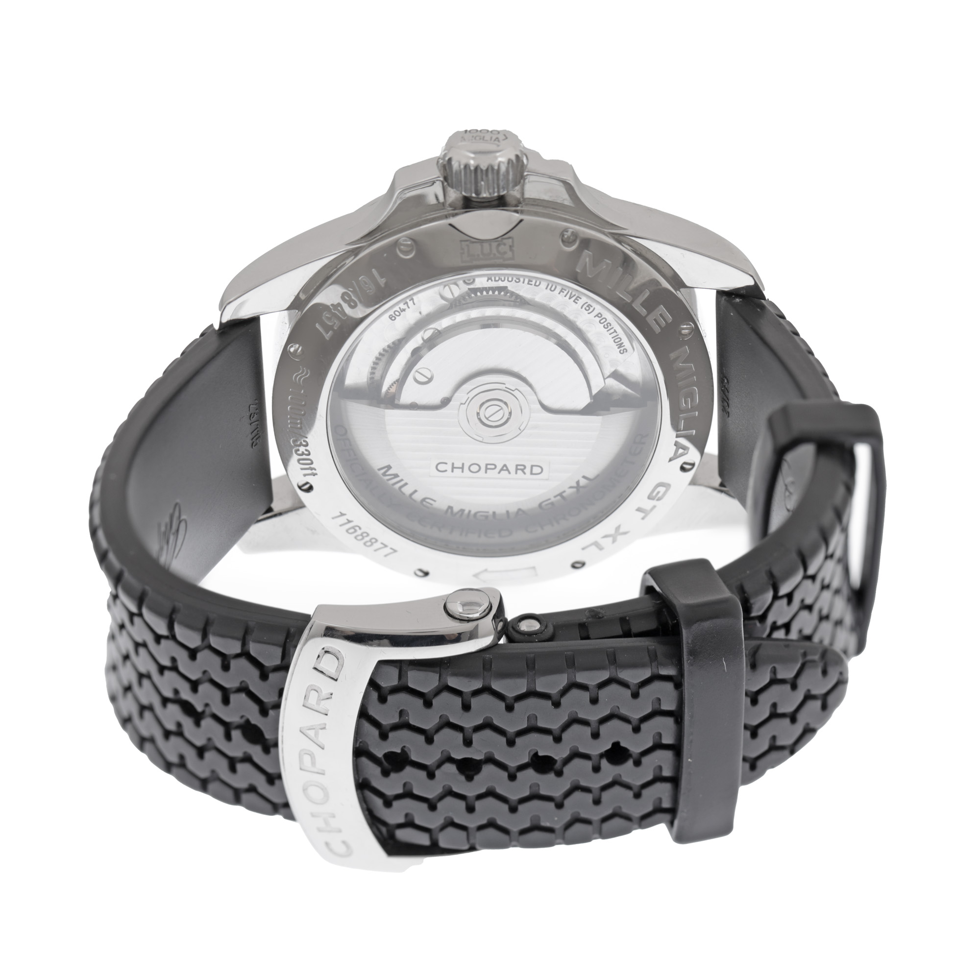Ceas Chopard Mille Miglia Power reserve, de mână, bărbătesc, referință 168457-3001. Mecanism automatic, calibrul CB-85, anterior vitrat. Cadran de culoare negru, indici baghetă, cu un registru dată în dreptul orei 3 și un registru pentru autonomia rezervei de mers în dreptul orei 6. Curea originală, din cauciuc, de culoare neagră, cu sistem de închidere de tip clasic.