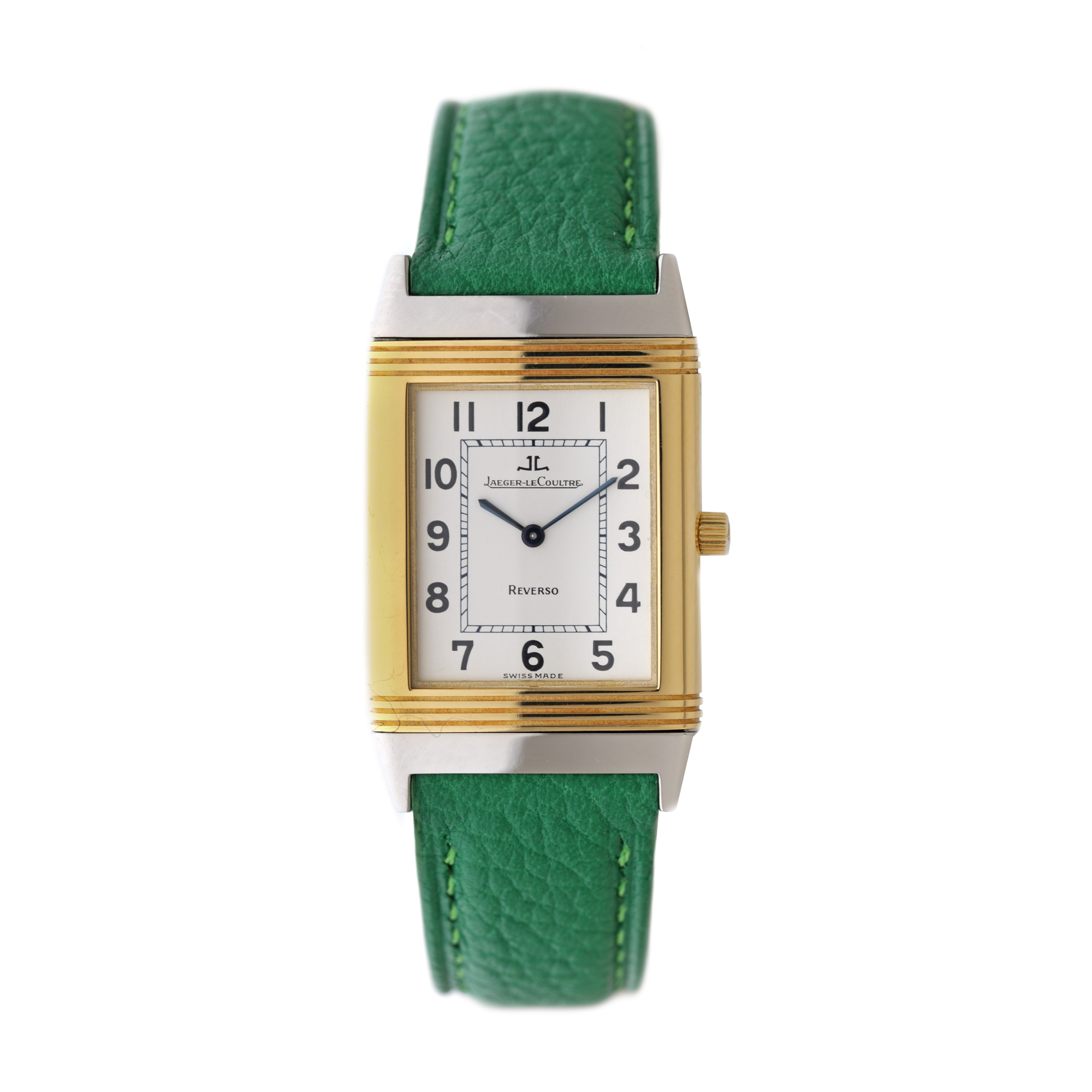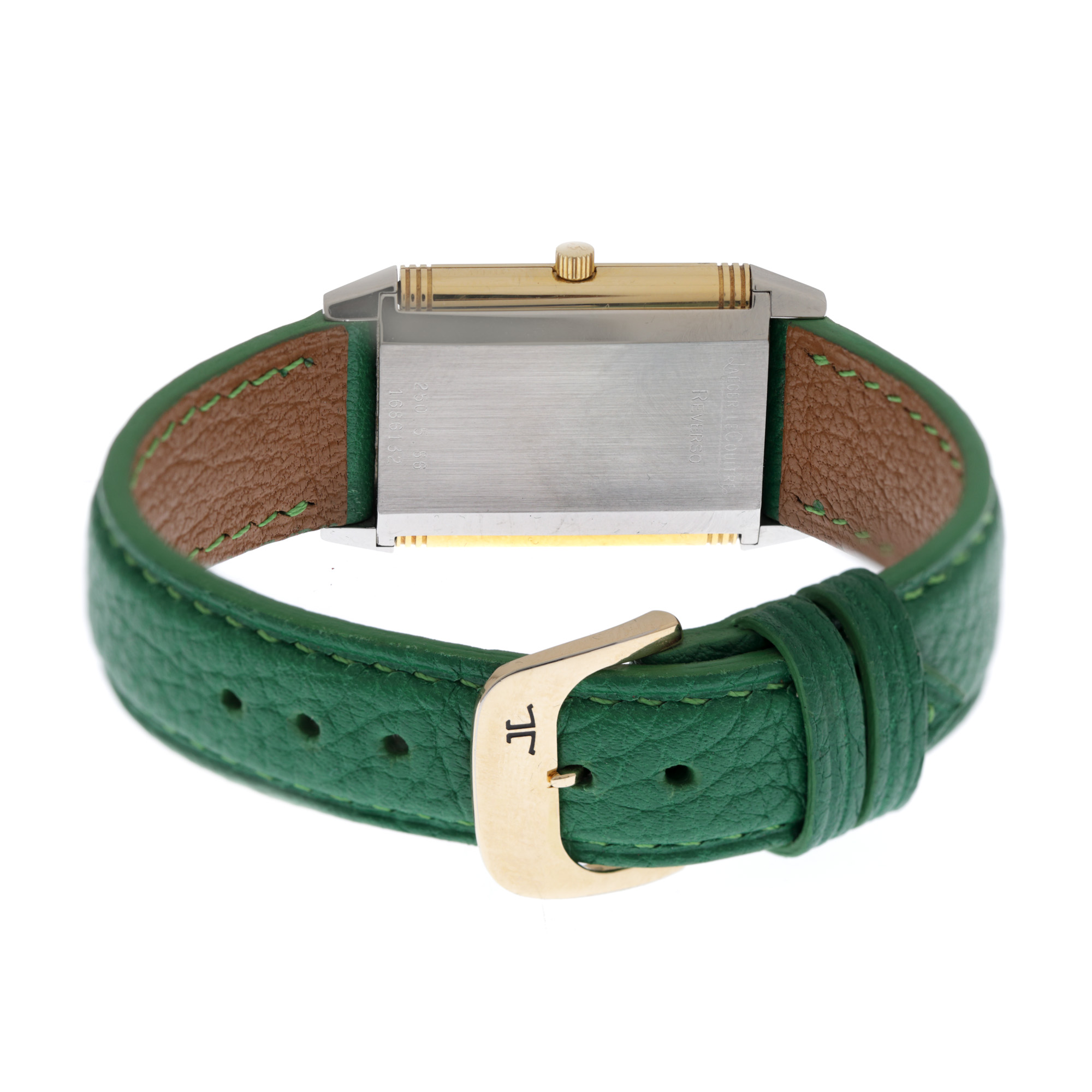 Ceas Jaeger LeCoultre Reverso din aur și oțel, de mână, bărbătesc, referință 250.5.86. Mecanism cu armare manuală. Cadran de culoare gri, indici numerale arabe. Carcasă reversibilă. Curea adăugată aftermarket, de culoare verde, cu sistem de închidere clasic cu catarama originală.
