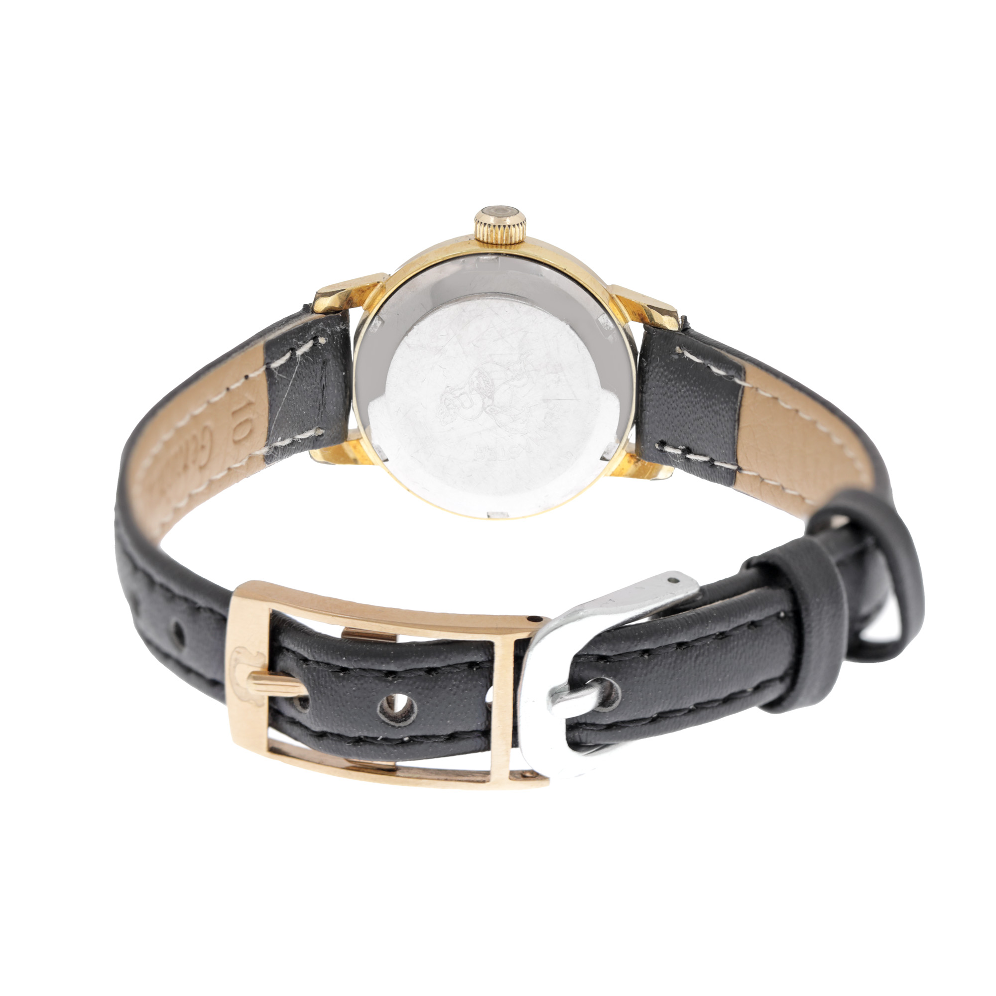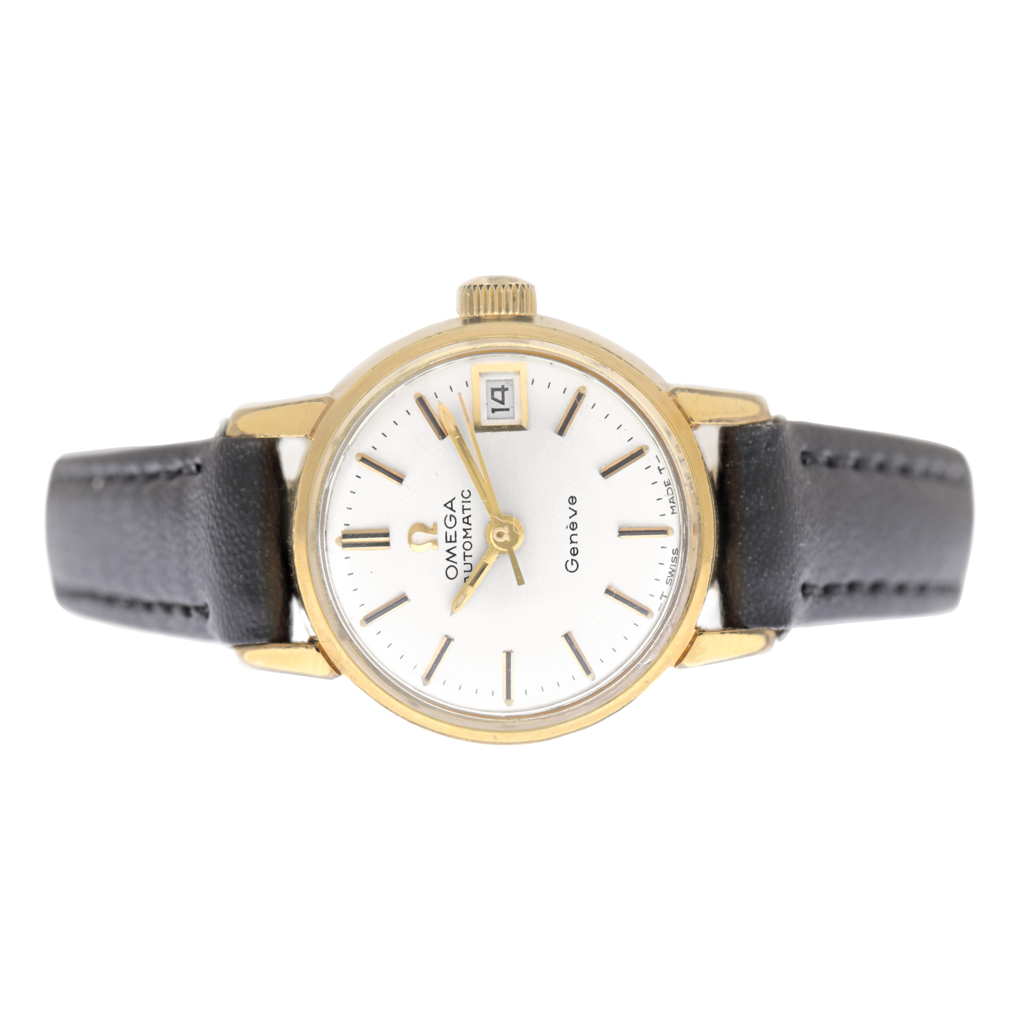 Ceas Omega Geneve Ladymatic, de mână, de damă, referință 562.005. Mecanism automatic, calibrul 681. Cadran de culoare champagne, indici baghete, cu un registru pentru dată în dreptul orei 3. Curea adăugată aftermarket, din piele, de culoare neagră, cu sistem de închidere de tip clasic cu catarama originală.