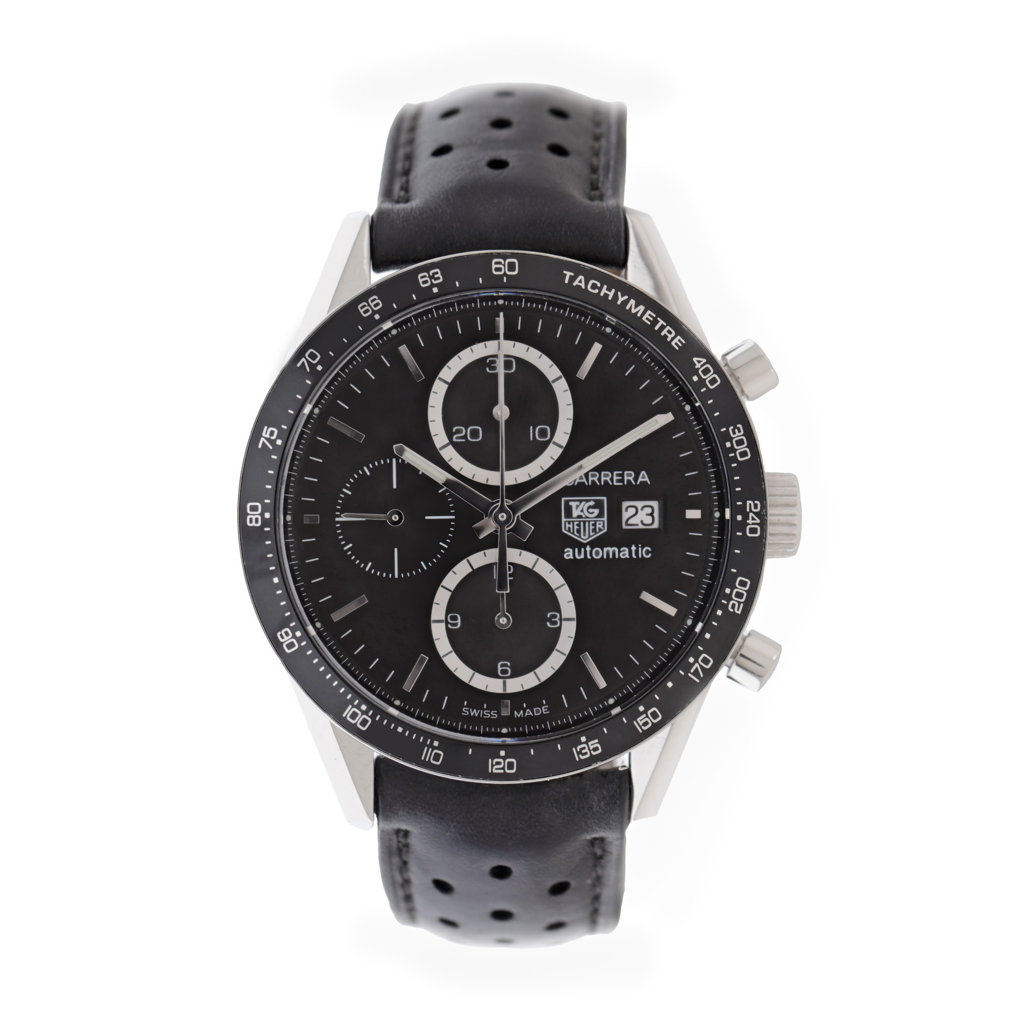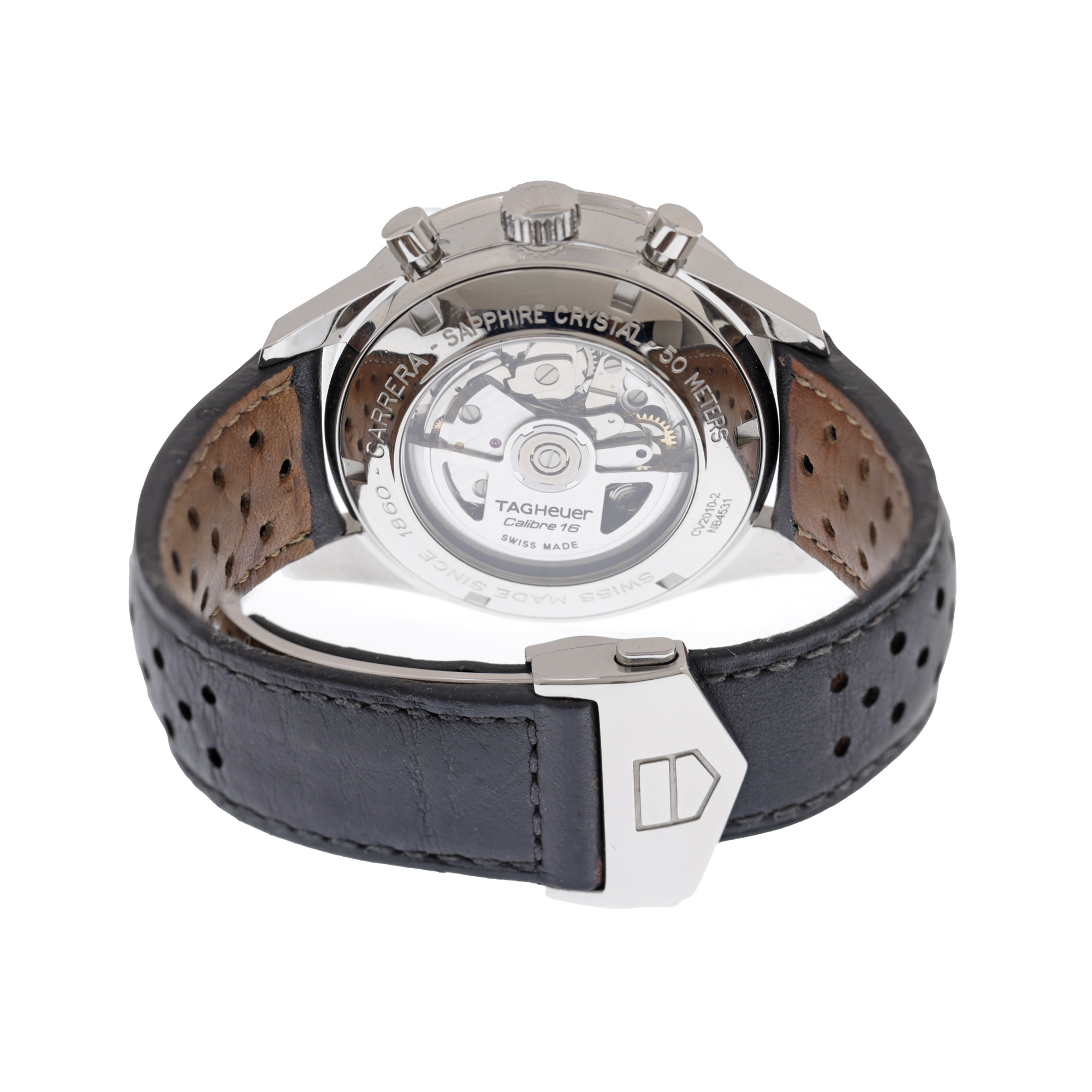 Ceas Tag Heuer Carrera, de mână, bărbătesc CV2010. Mecanism automatic, calibrul 16, cu funcție de chronograph. Cadran de culoare negru, indici baghetă, cu un registru pentru dată în dreptul orei 3, două registre pentru funcția de chronograph în dreptul orelor 12 și 6 și un registru pentru secundar în dreptul orei 9. Curea originală, din piele, de culoare neagră, cu sistem de închidere clasic.