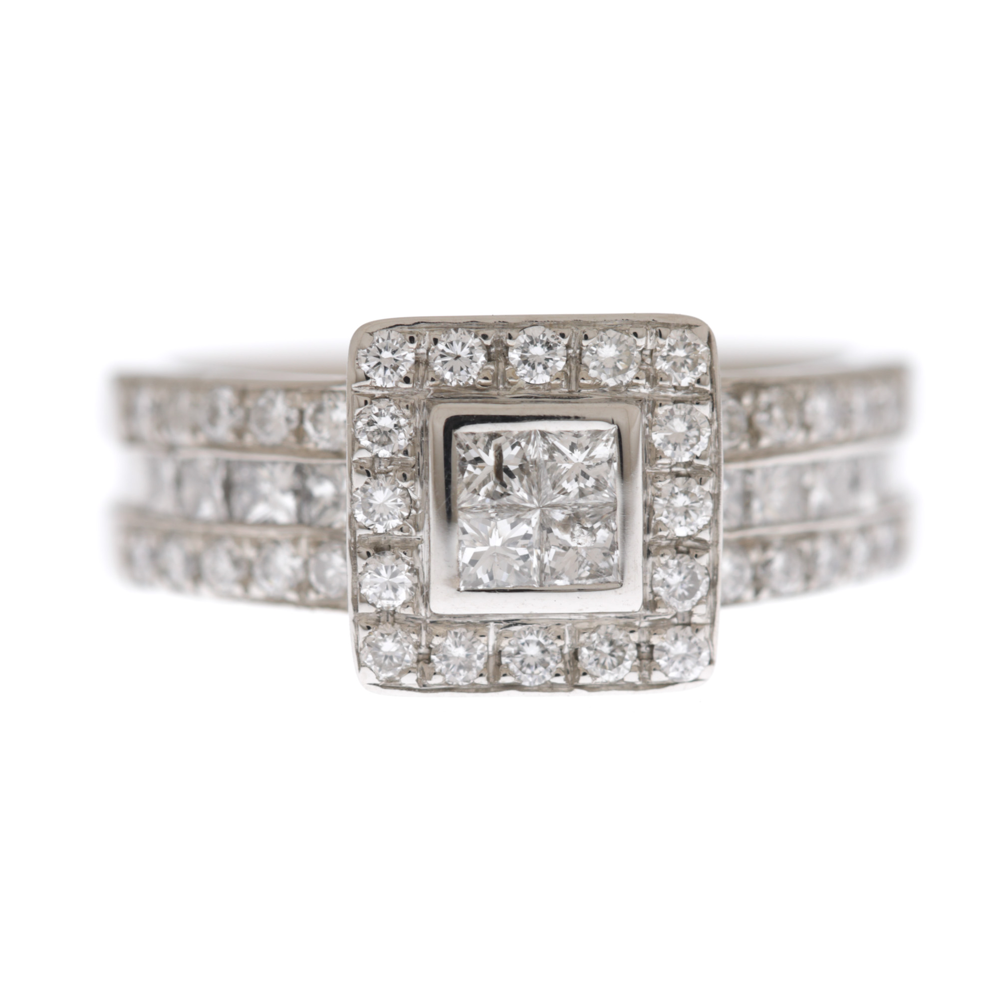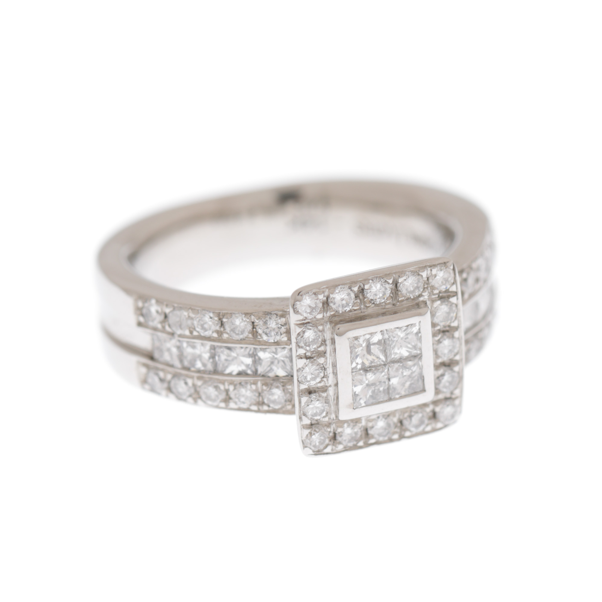 48 diamante (12 princess cut, 36 rotunde briliant), culoare D-F, claritate VVS-VS, cca. 1,27 ct.