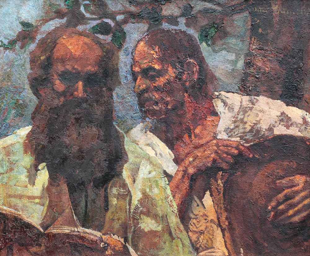 Pentru Octav Băncilă portretul a reprezentat un gen pe care l-a abordat pe întregul parcurs al carierei cu o pasiune explicabilă tocmai prin caracterul acestuia, calitate relevată lesne printr-un produs artistic definit de multitudinea de tipuri umane interogate. Fie că l-a interesat portretul în spirit simbolist – la începutul carierei, în perioada germană -, fie că a pictat chipul uman interesat de trăsăturile fizionomice sau pasionat de apariția pitorească, Băncilă și-a modelat în cei 40 de ani de practică o structură foarte specifică a mijloacelor picturale necesare unei portretistici reprezentative. Atât de cunoscute, tipurile umane cercetate ne relevă un artist interesat nu doar de factura plastică, ci și de apariția omului simplu în opera vizuală. Țăranul, față de care a simțit o atașare profundă, evreul – în special cel tradițional, pitoresc în imaginarul urban al Iașilor primelor decenii ale secolului XX – sau țiganul și nomadul au trezit pasiuni puternice, materializate într-o adevărată operă portretistică. Dincolo de simpla înfățișare, pictura personajului este încărcată uneori și de considerente spiriturale, așa cum lesne putem descoperi și în opera de față. Dublul portret, în fapt un chip de țăran alăturat autoportretului din partea stânga a tabloului, impresionează atât prin pitorescul compozițional, dar și prin reconsiderarea artistului față de sine și față de celălalt. În veșmânt de țăran, cu capul neacoperit – amintind de un anume statut social -, dar cu cartea în mână, Băncilă se apropie de tipul țăranului cult, înglobând astfel un arhetip. (I.P.)