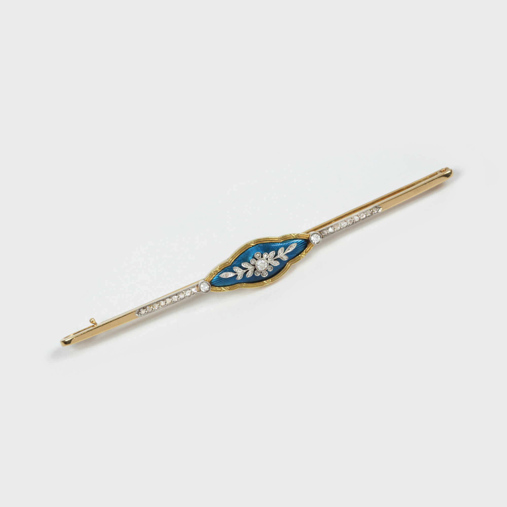 51. Broşă din aur Gustave Wolfers, în stil Neoclasic, decorată cu diamante şi email, lucrată manual, în cutie originală