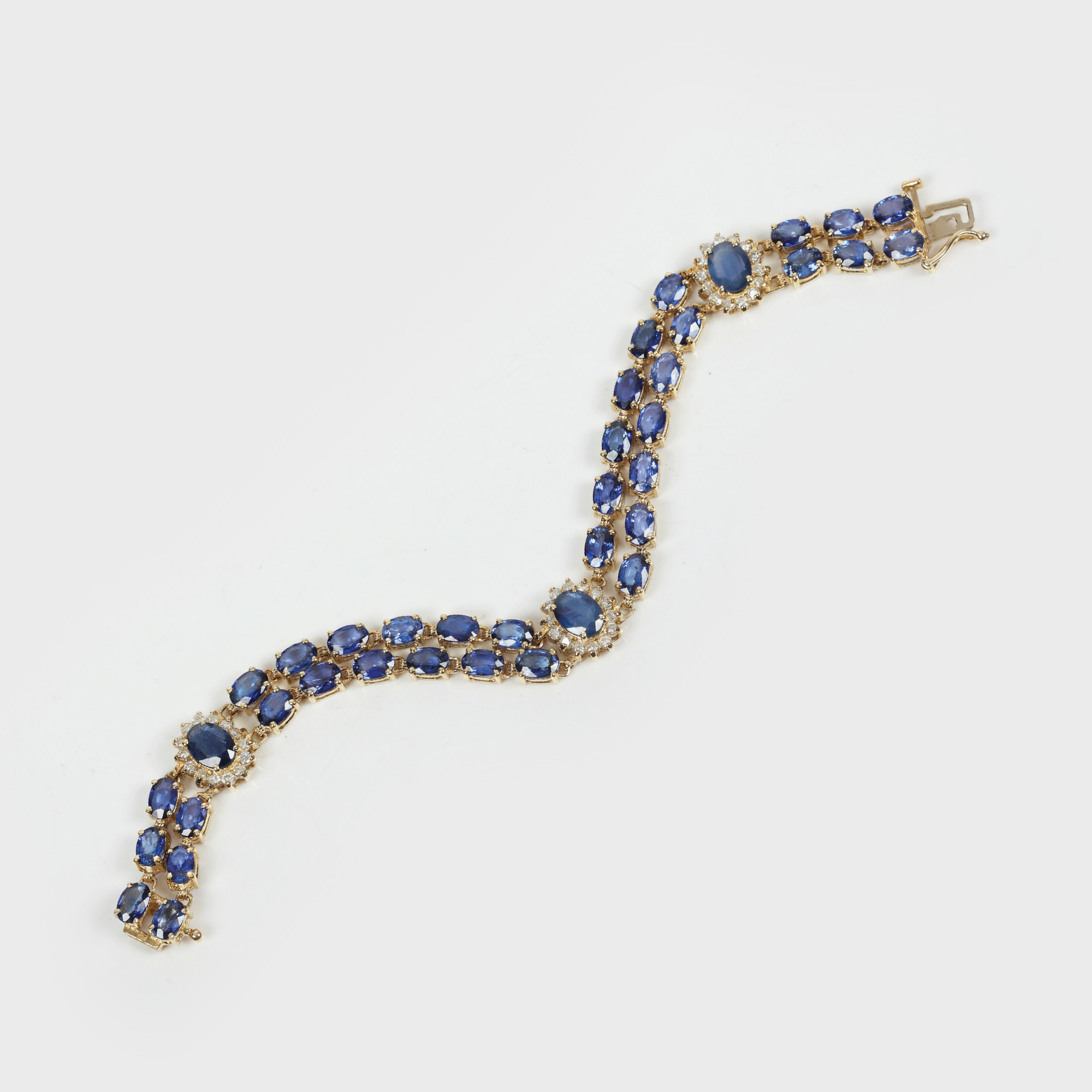aur galben 14 k, 39 safire şlefuite oval cca. 25 ct şi 42 diamante şlefuite briliant cca. 1,26 ct, culoare diamante I-J, culoare safire albastru mediu deschis, diamante claritate I1-SI2 , safire SI-VS, safire tratate deep fusion