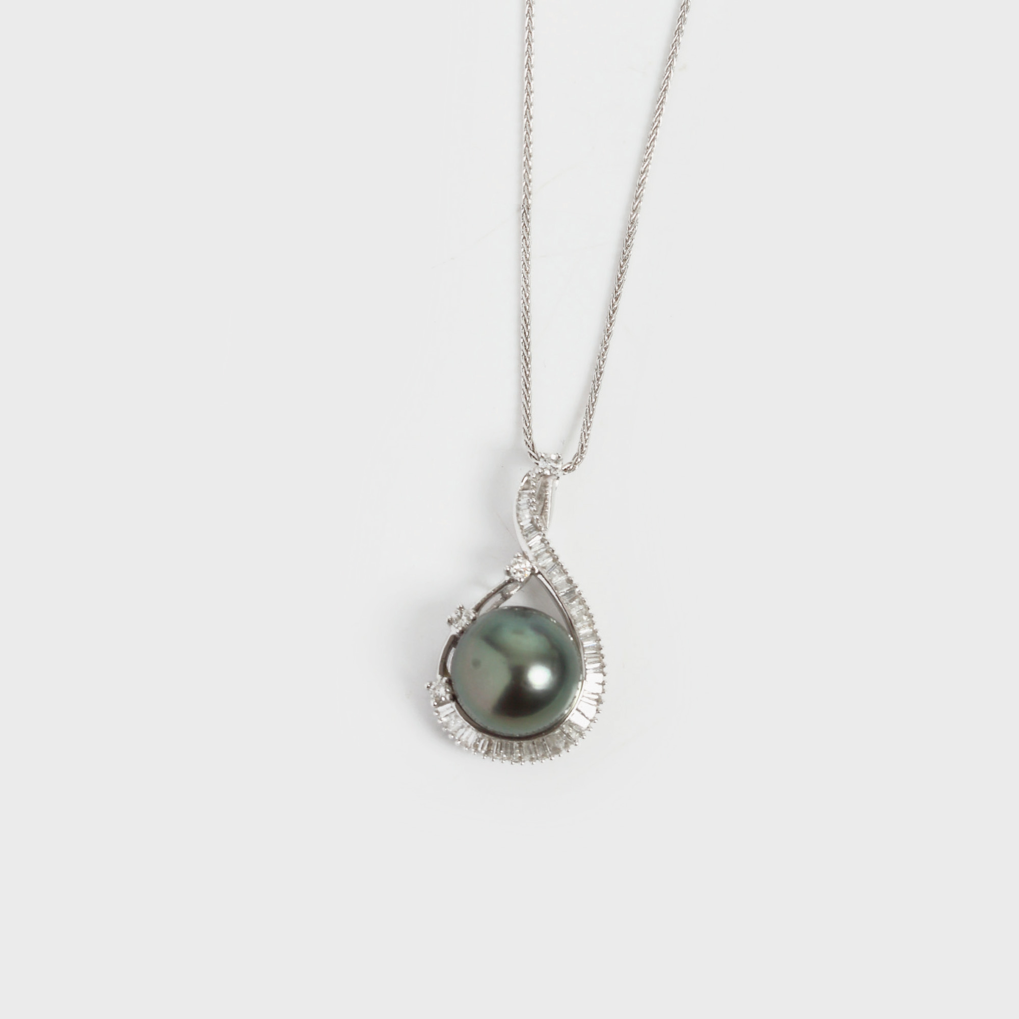 aur alb 14 k, 4 diamante şlefuite briliant rotund, 37 diamante şlefuite baghetă cca. 1 ct total şi perlă Tahitian de cultură, culoare G-H, claritate SI1-SI2