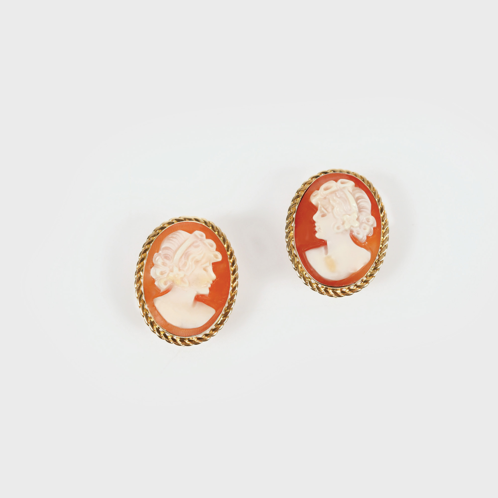 40. Pereche de cercei din aur şi camee, reliefând un profil feminin