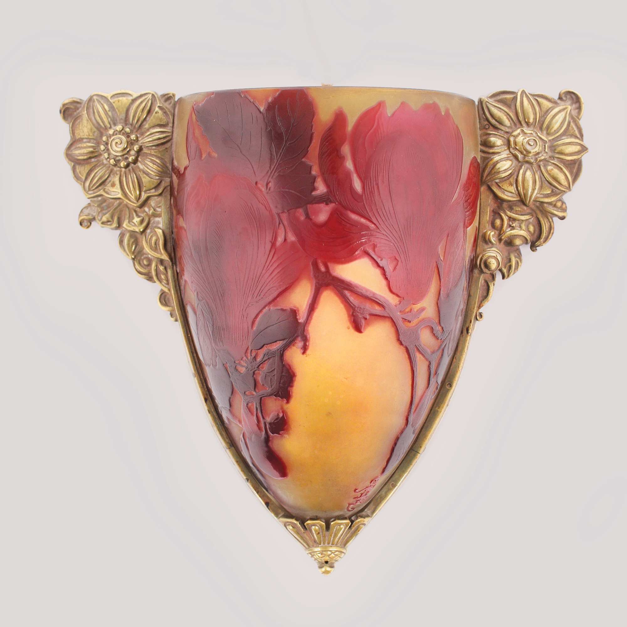 Aplică cu decor floral, magnolii rubinii pe fond galben-verzui, de formă semi-conică, în suport din alamă, cu motiv floral. Semnată cu rubiniu, în interior etichetă cu numele autorului "Emile Galle - Nancy Paris".