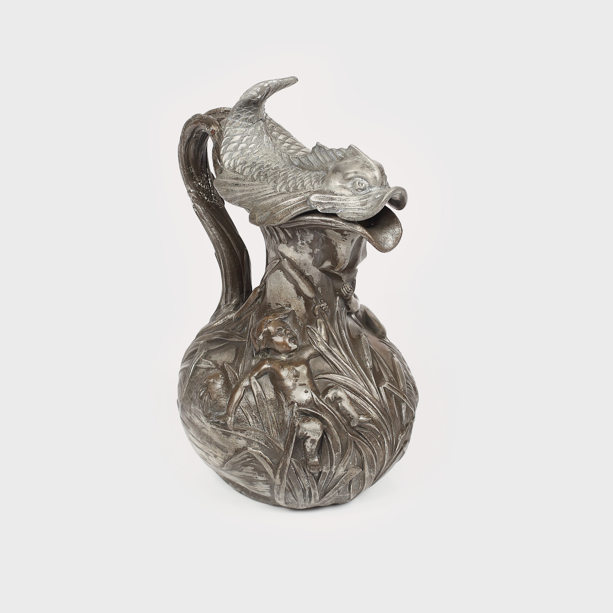 49. Cană Art Nouveau cu capacul în forma unui peşte fantastic, realizată de Henri Huppe, începutul sec. XX
