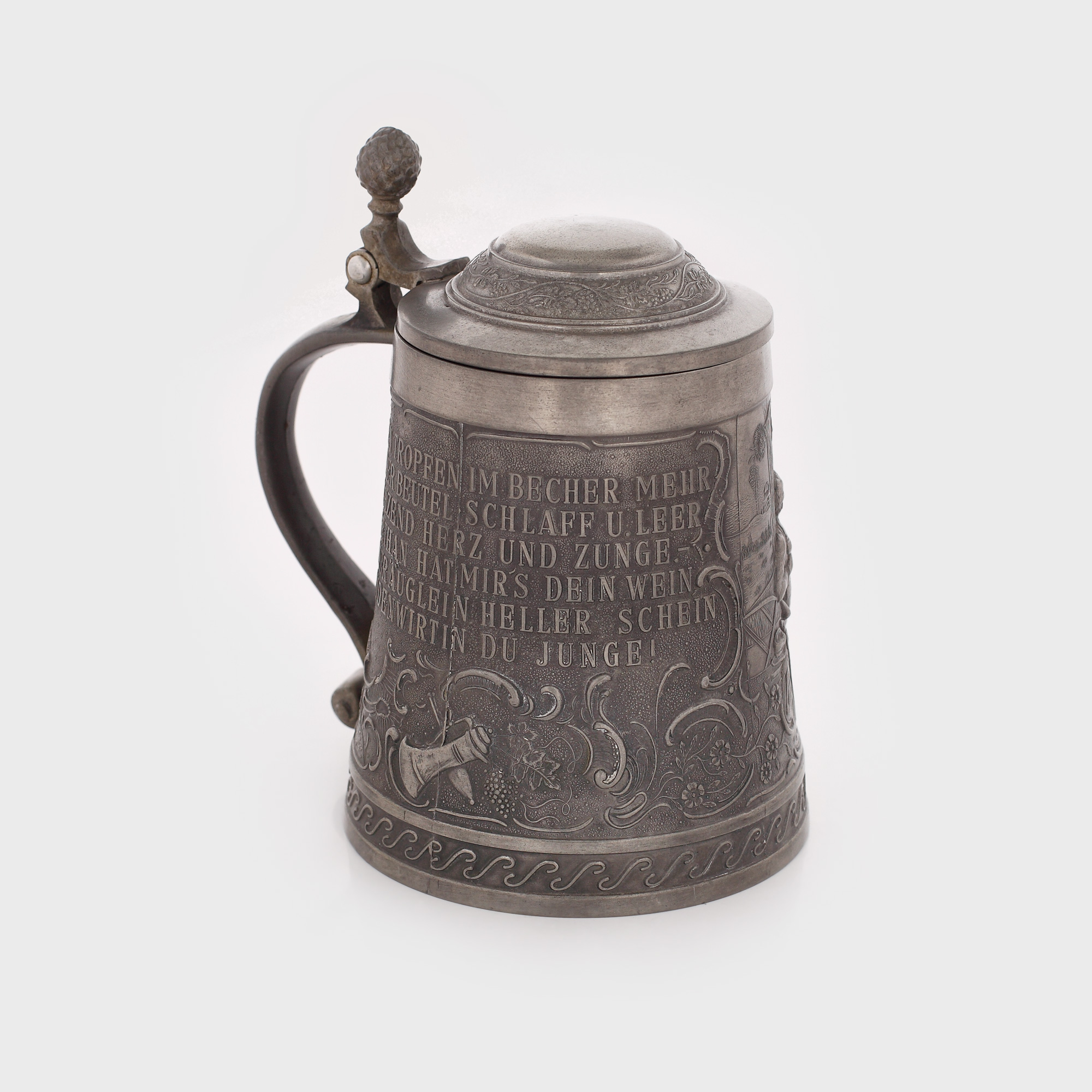 Cană de bere cu capac decorată cu scenă de gen ”sub tei”, clientul unui han ce se îndrăgostește de frumoasa hangiță. Pe corp, prima strofă din cântecul studențesc de petrecere ”Keinen Tropfen im Becher mehr” ( ”Nici o picătură rămasă în cană”), de Rudolf Baumbach, pe muzica lui Franz Abt (1877/1878).