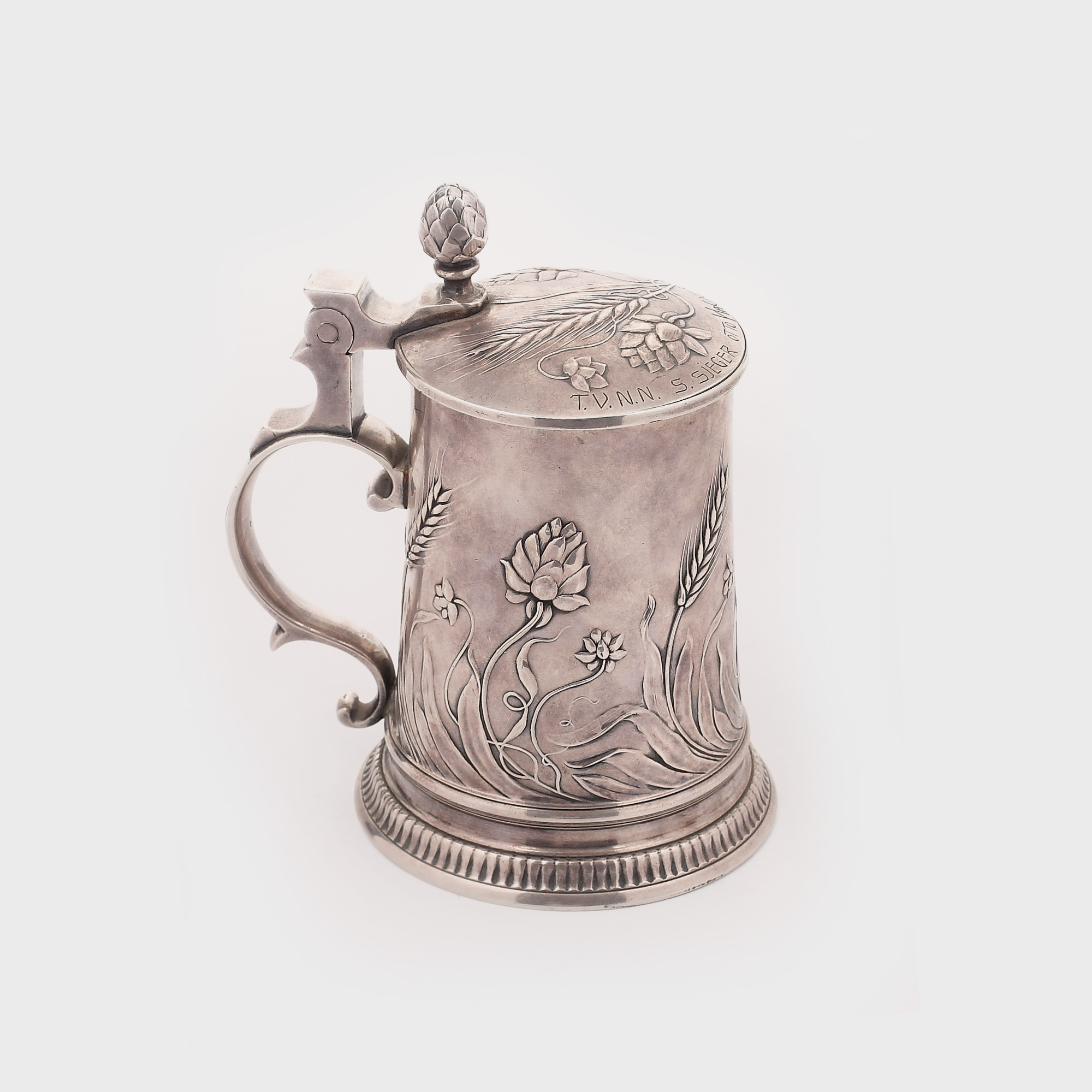Cană de bere cu capac, de tip german tradițional, cu decor adaptat stilului Art Nouveau, cu motive vegetale și florale (caprifoi, spice de grâu). Pe capacul prins în șarnieră gravură "T.V.N.N./S.Sieger/Otto Wagner".
