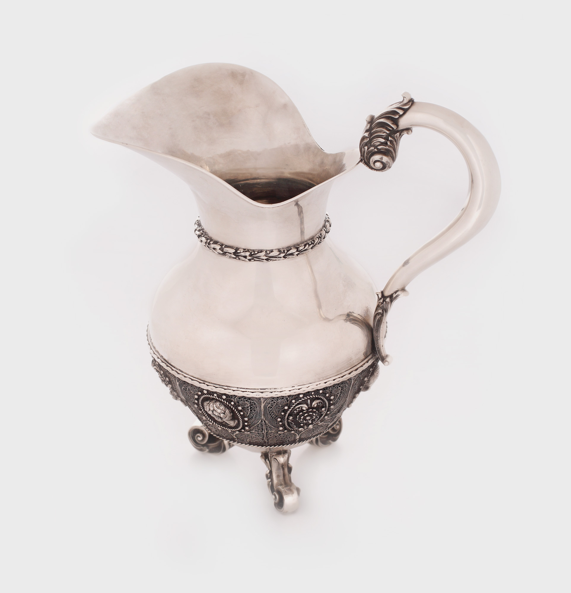 Splendidă carafă din argint, pe trei picioare volute, cu corpul decorat la partea inferioară cu registru decorativ pe fond de filigran, cu medalioane florale și efigii antice, cu partea superioară lisă, cu bordură de frunze de lauri și ansă supraînălțată volută.