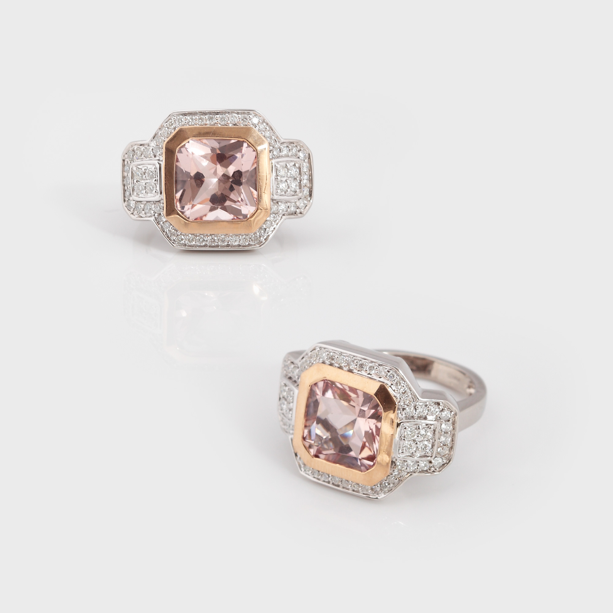 aur roșu 14 k, 56 diamante cu tăietură briliant cca. 0,6 ct și un acvamarin roz cu tăietură princess cu colțurile tăiate cca. 7,44 ct, diamante - culoare H-I, claritate SI1, acvamarin - culoare roz mediu închis, claritate VS