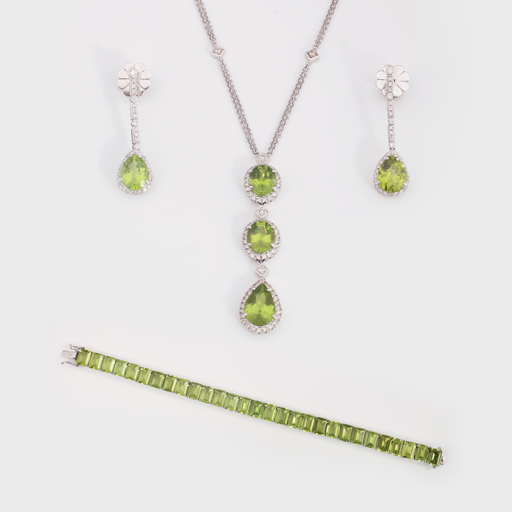 46. Garnitură de seară formată din cercei, brățară și colier din aur, bogat decorat cu diamante și peridoturi [Sec. XX]