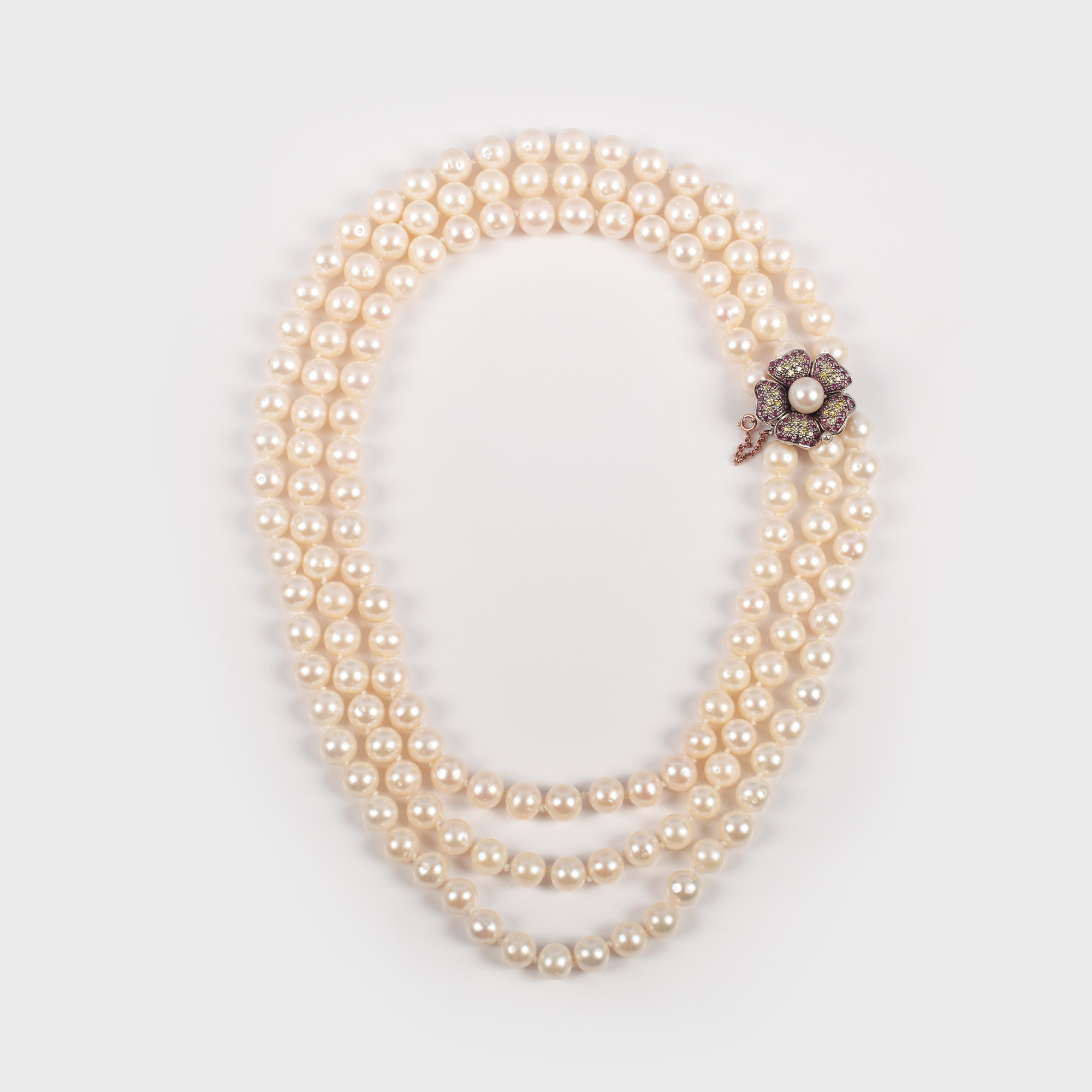 Somptuos colier de perle ce este alcătuit din trei șiraguri de lungimi diferite pentru mărirea efectului decorativ, având elementul de închidere în formă de floare bogat decorată cu safire și rubine pavate în câmpul petalelor.