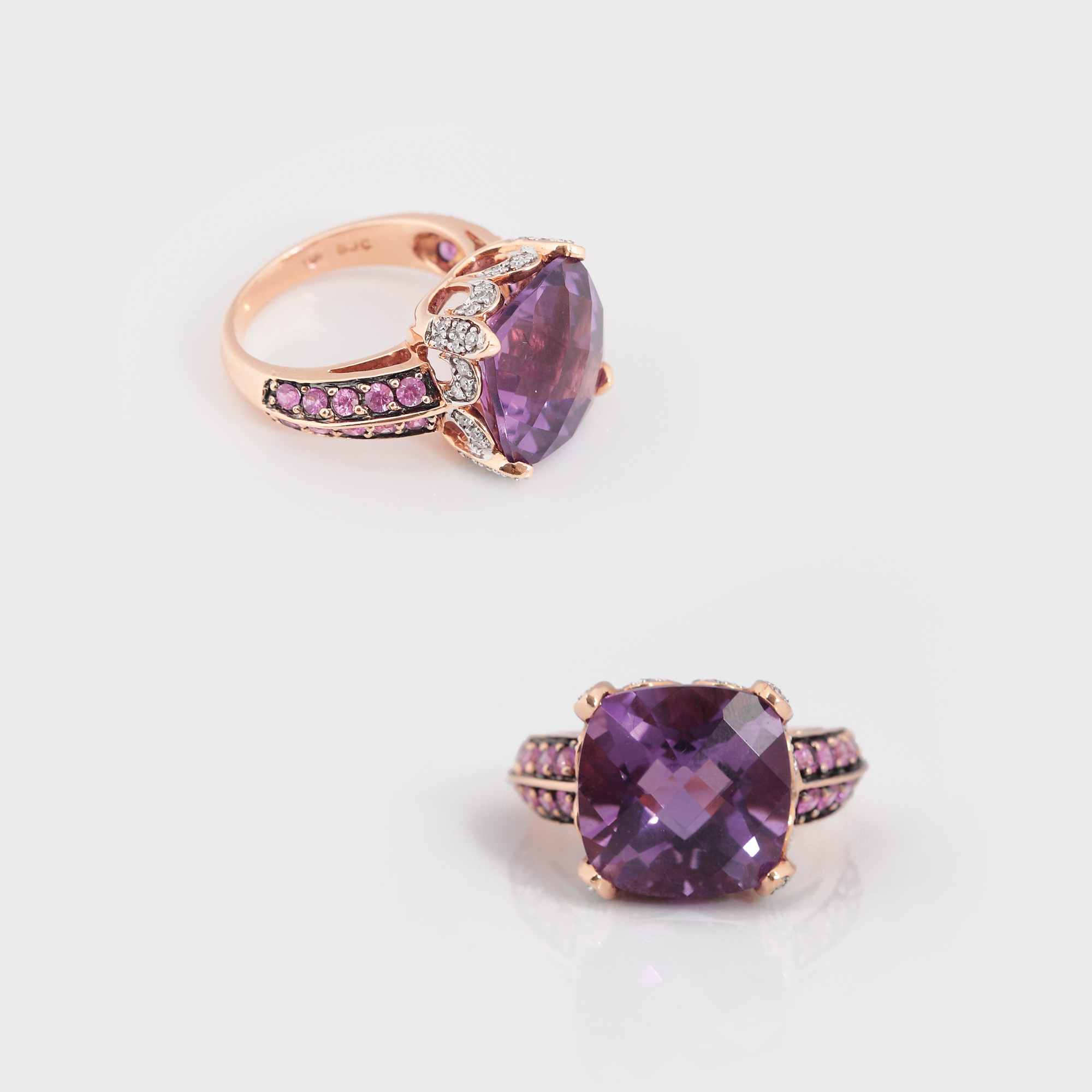 aur galben 14 k, 44 diamante cu tăietură briliant cca. 0,22 ct, 20 safire cu tăietură briliant cca.0,88 ct și un ametist cu tăietură fancy cca. 7 ct, diamante - culoare I-J, claritate SI2, safire - culoare roz, claritate SI, ametist - claritate VS