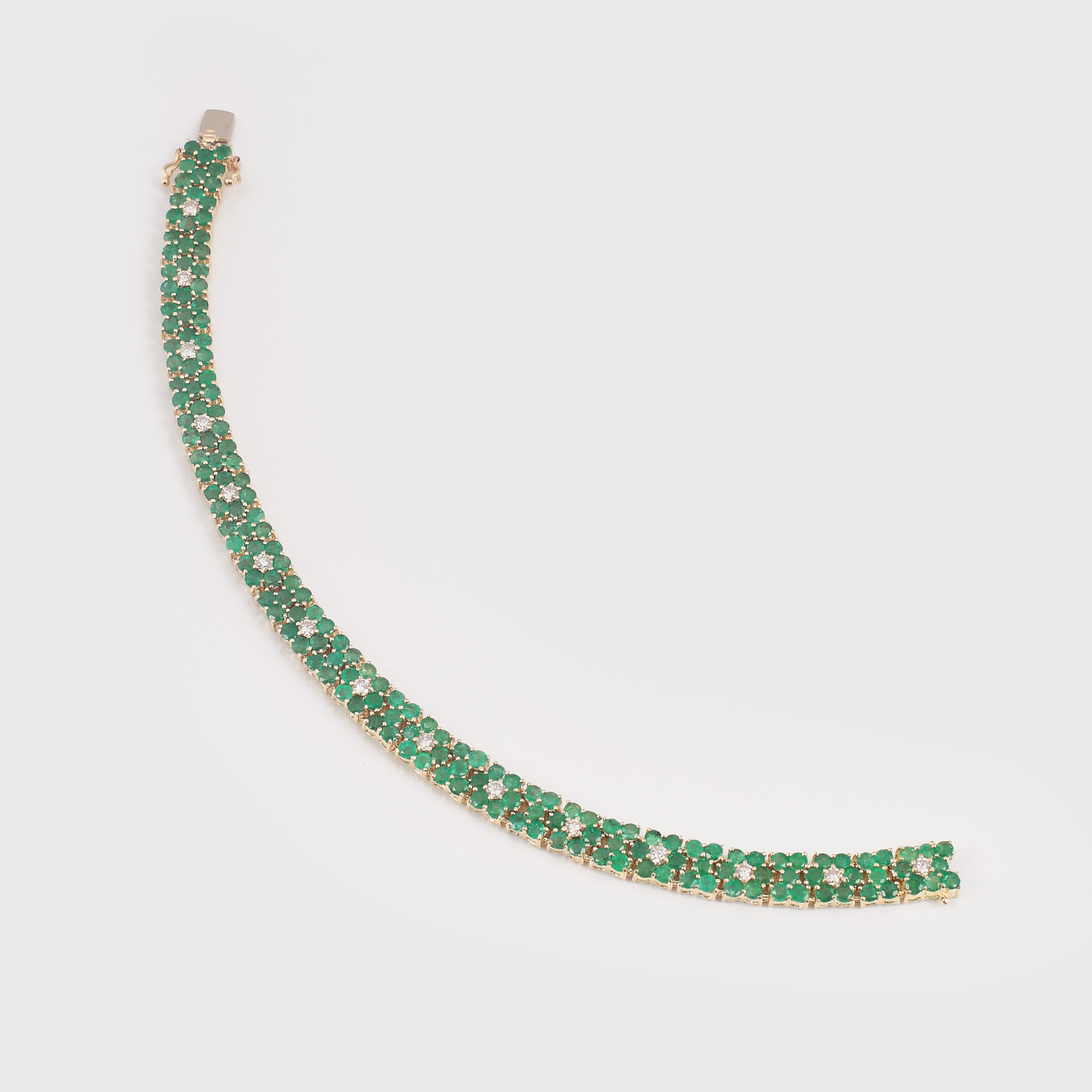 Brățară din aur bogat decorată cu glieduri articulate, alternante, decorate cu smaralde și diamante dispuse în motive florale.