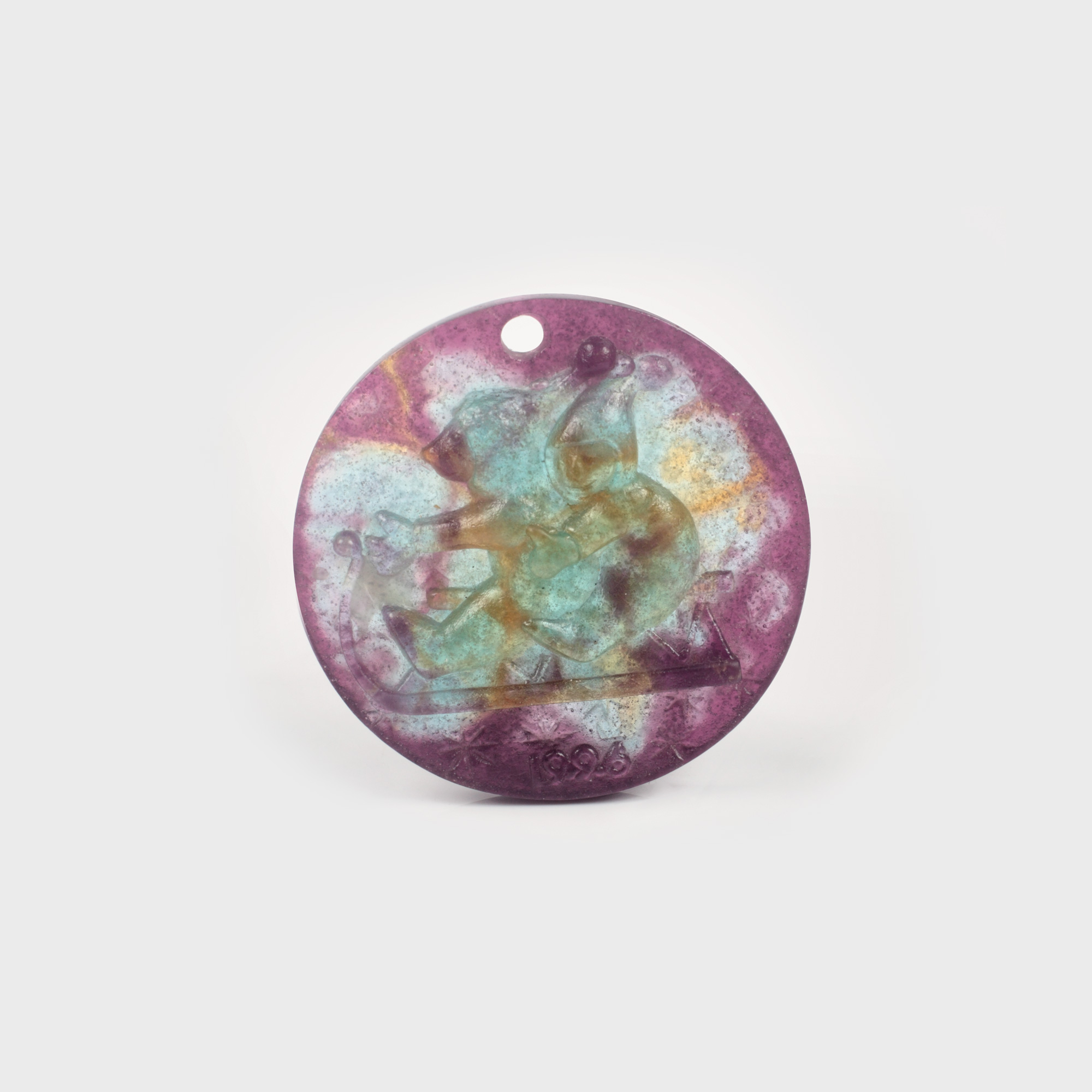 Medalion circular, realizat din pastă de cristal turcoaz şi violaceu, este decorat cu scenă de iarnă, având în centru copii pe săniuţă, iar la bază menţionat anul realizării 1996.