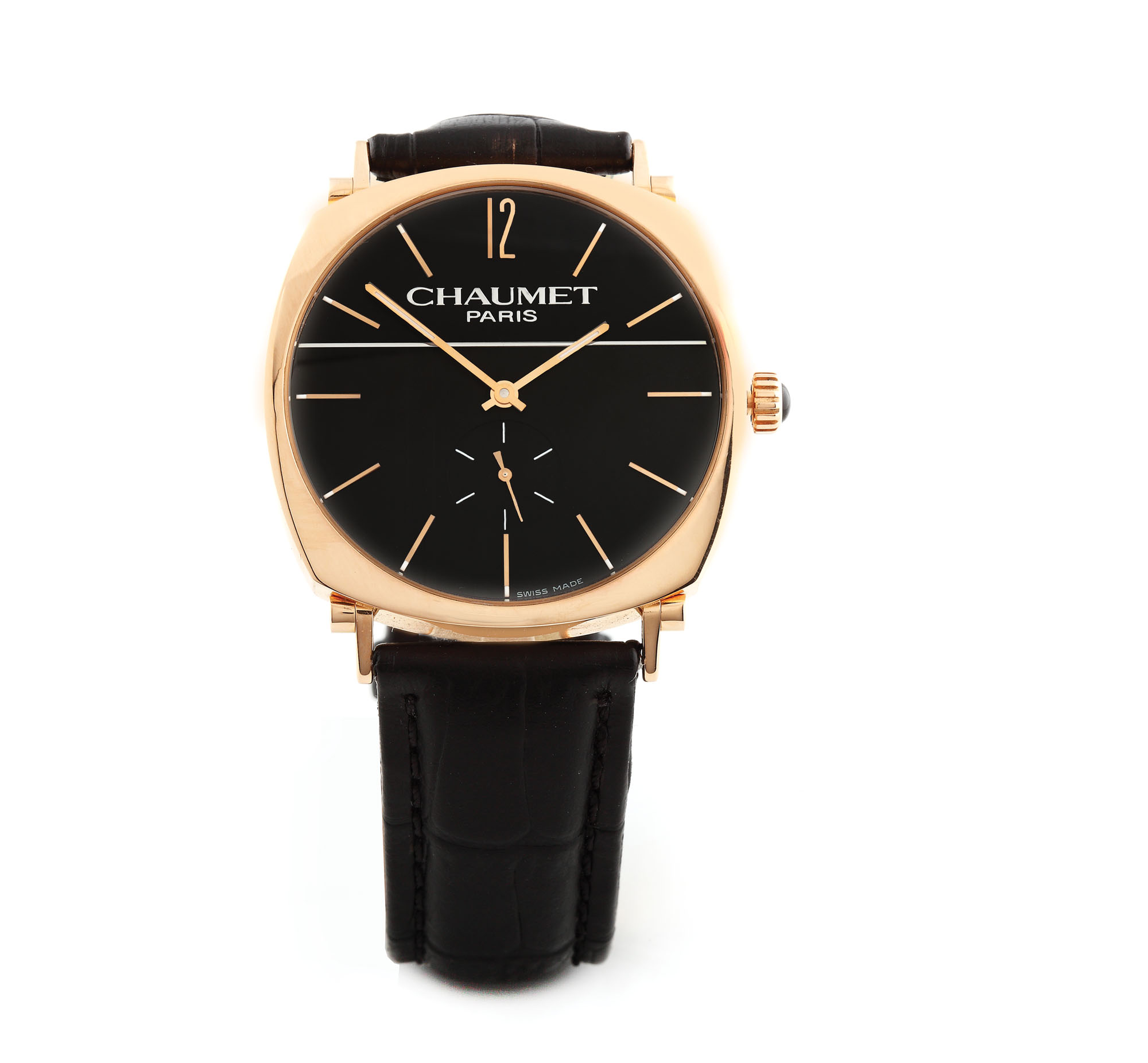Ceas Chaumet Dandy de mână, bărbătesc, din aur roz. Mecanism cu întoarcere manuală, cadran de culoare neagră și secundar la ora 6. Curea din piele de culoare neagră și cataramă originală din aur de 18 k.