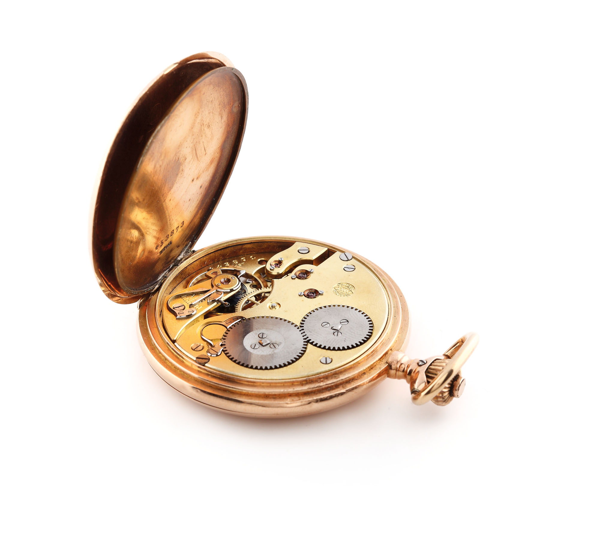 Ceas IWC, de buzunar, din aur, cca. 1940, cu 3 capace, cadran de culoare albă cu cifre arabe și secundar la ora 6. Mecanism cu armare manuală, având seria 443801, serie carcasă 453873.