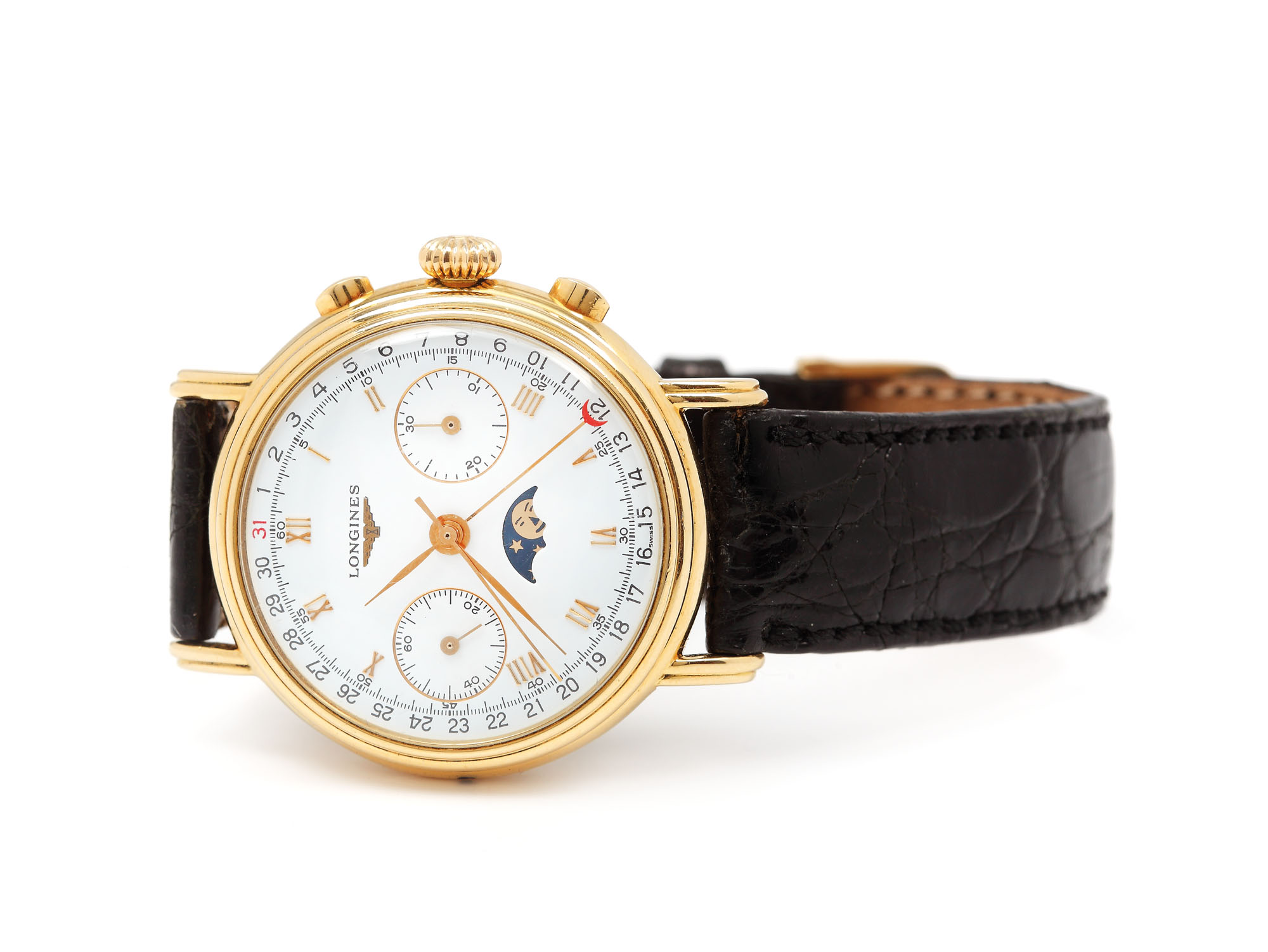 48. Superb ceas Longines Moon Phases, de mână, bărbătesc, din aur, indică fazele lunii [Cca. 1950-1960]