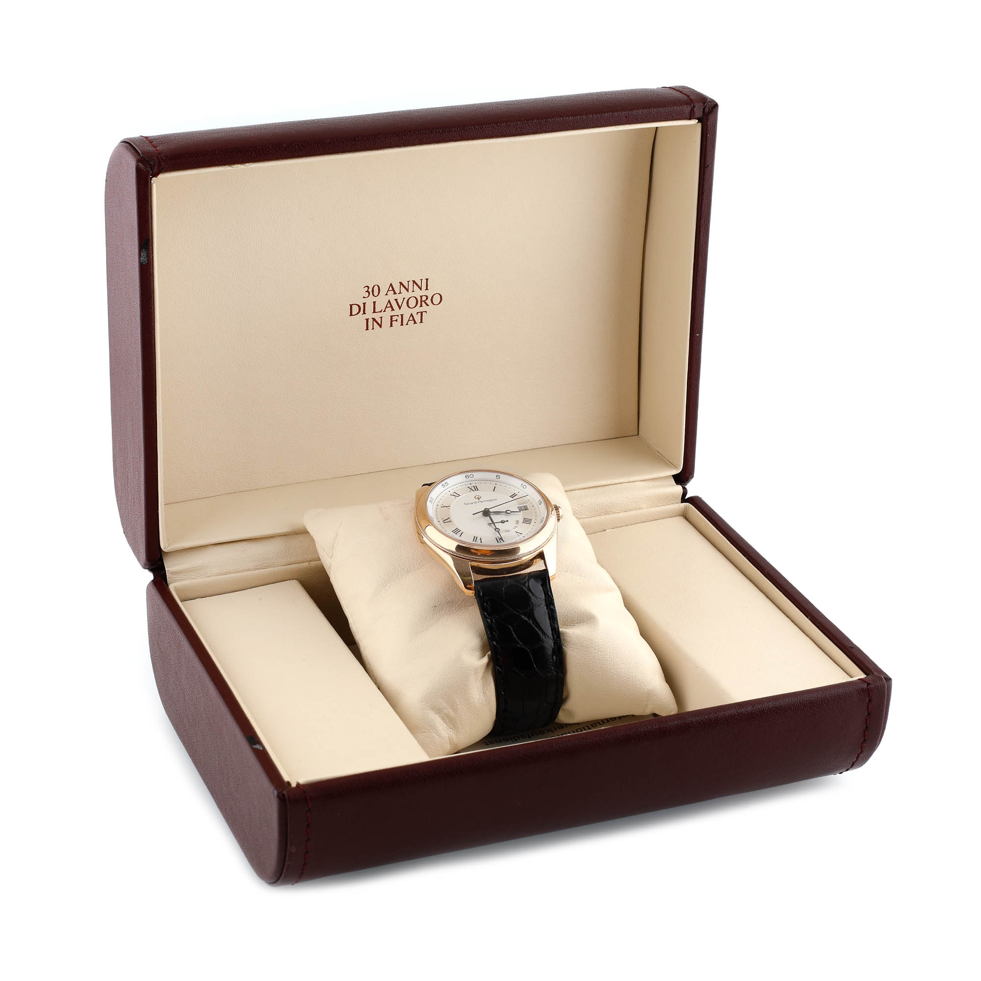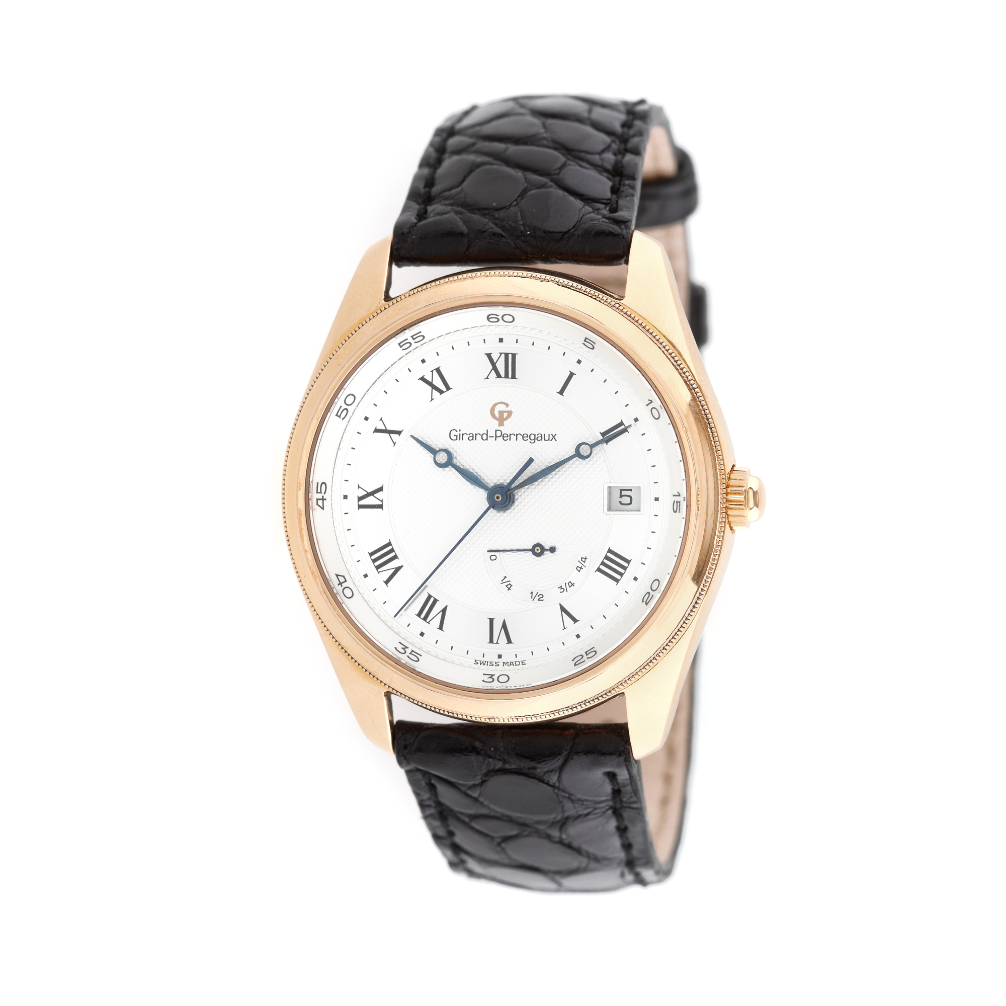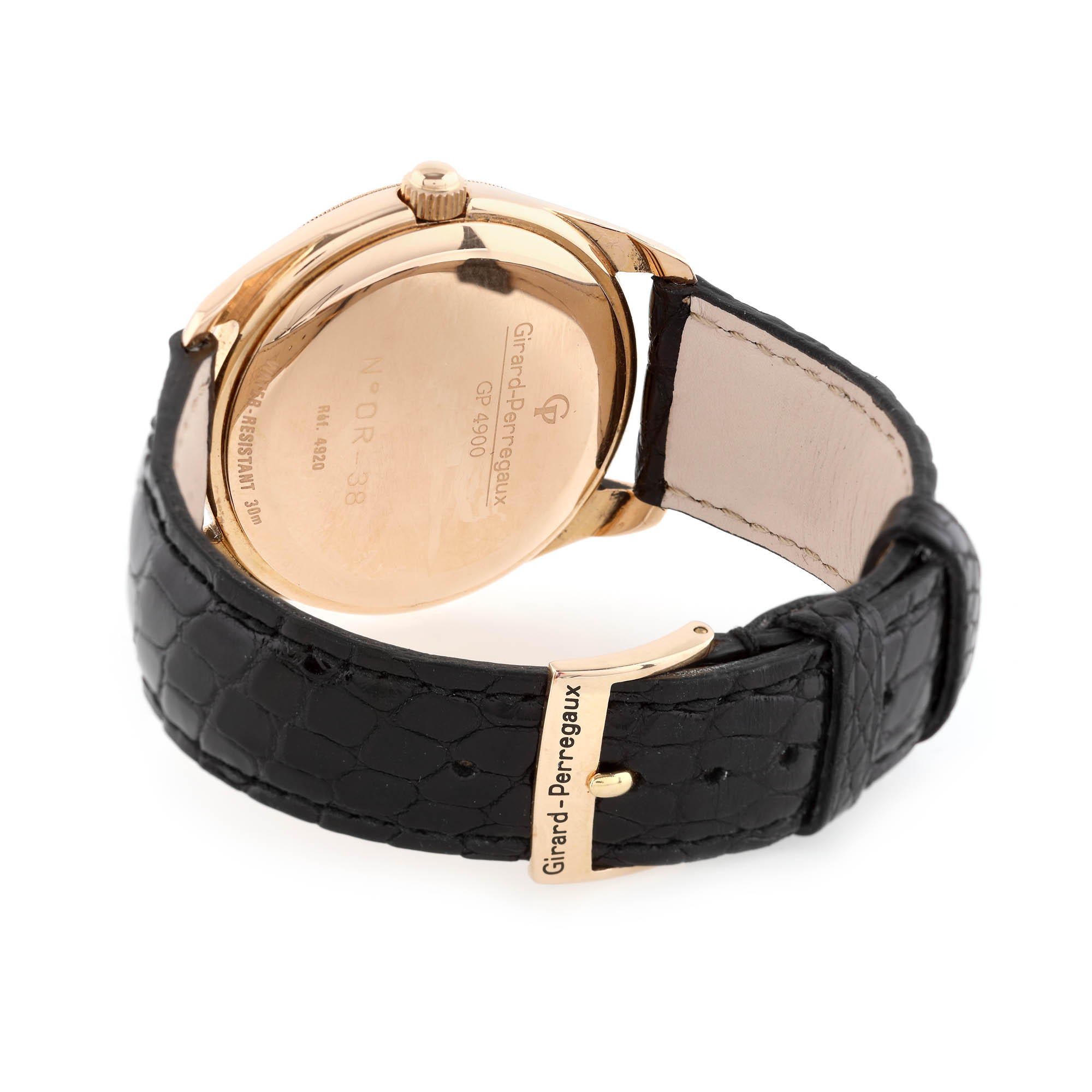Ceas Girard Perregaux, din aur, de mână, bărbătesc, referință 4920, mecanism automatic. Cadran de culoare alb, decorat în tehnica guilloche, numerale romane, dată în dreptul orei 3 și rezervă de timp în dreptul orei 5. Curea din piele, de culoare neagră și cataramă din aur, originale. Accesorii: cutie originală Girard Perregaux.