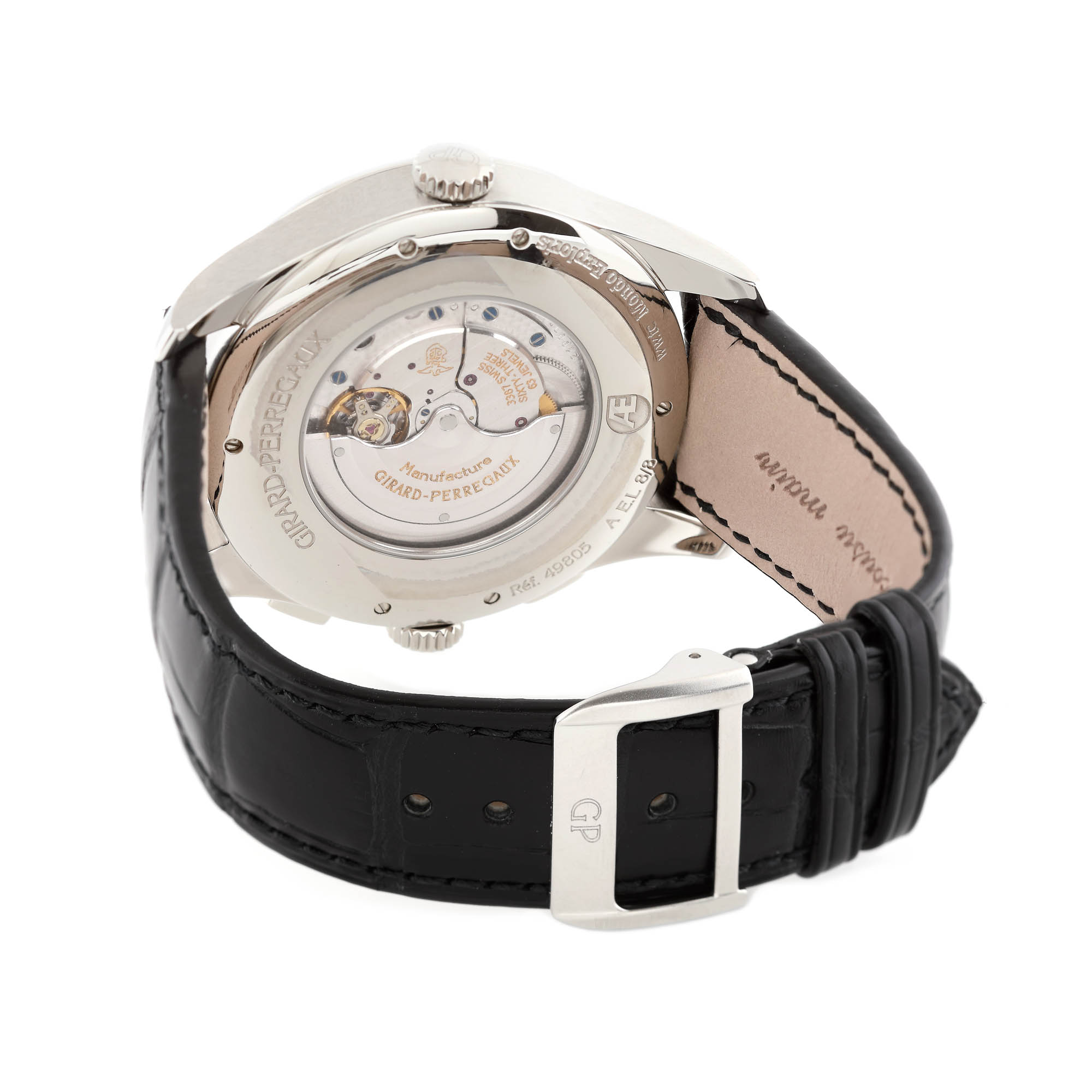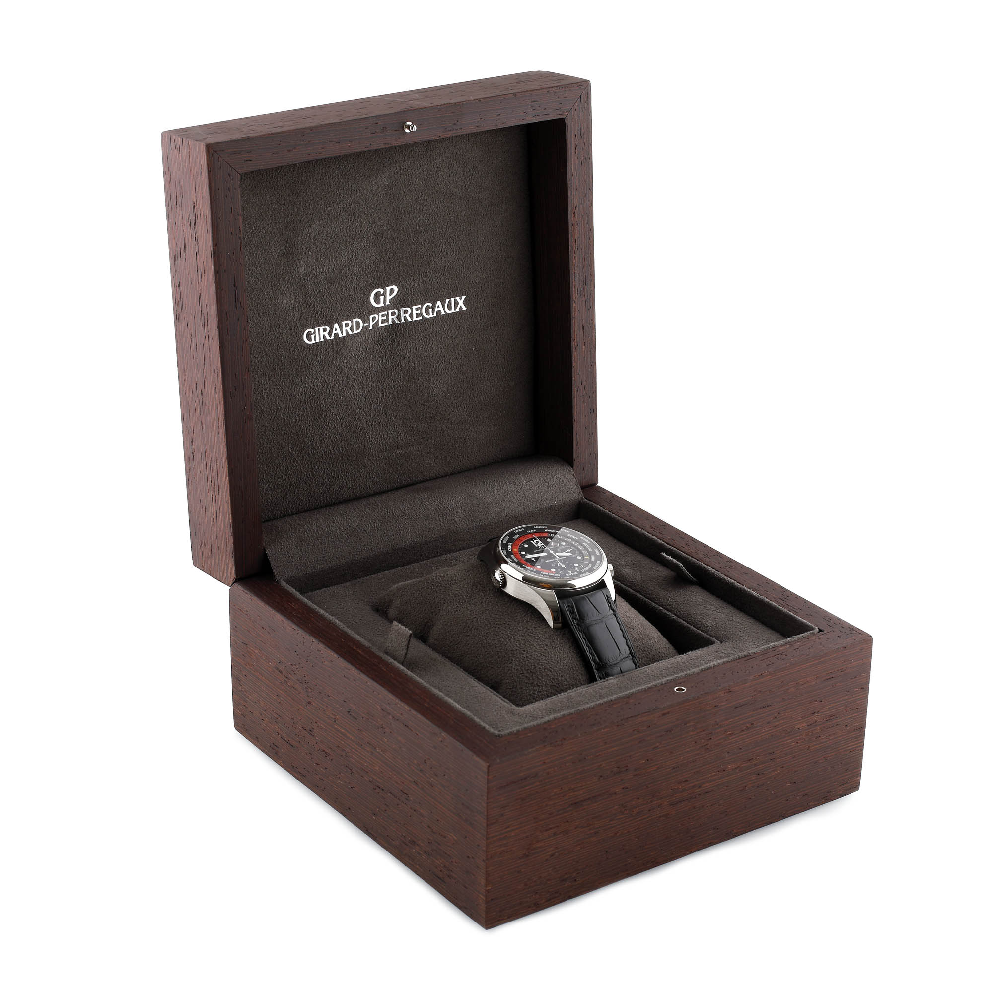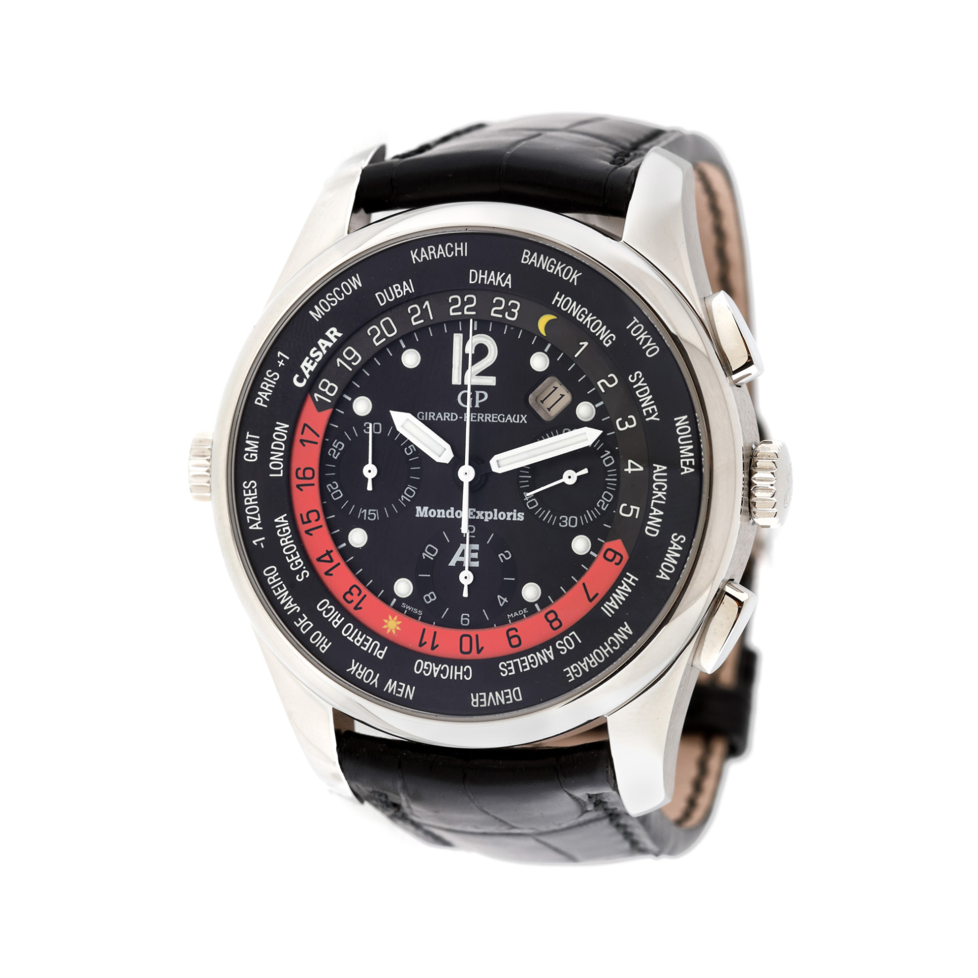 Ceas Girard-Perregaux WW.TC Chronograph “Mondo Exploris”, de mână, bărbătesc, referință 49805-11-777SBA6A, mecanism automatic. Cadran de culoare negru, numerale arabe, funcții: oră, minutar, secundar, world time, indicator zi/noapte, cronograf și dată între orele 1-2. Curea din piele, de culoare neagră și sistem de închidere tip deployant. Ceasul vine însoțit de accesorii: cutie originală și de actele de proveniență: manual de utilizare, certificat de ediție limitată (modelul 8 dintr-o ediție de 8 piese) și card de garanție internațională datat 12.12.2011 și ștampilat de retailer.