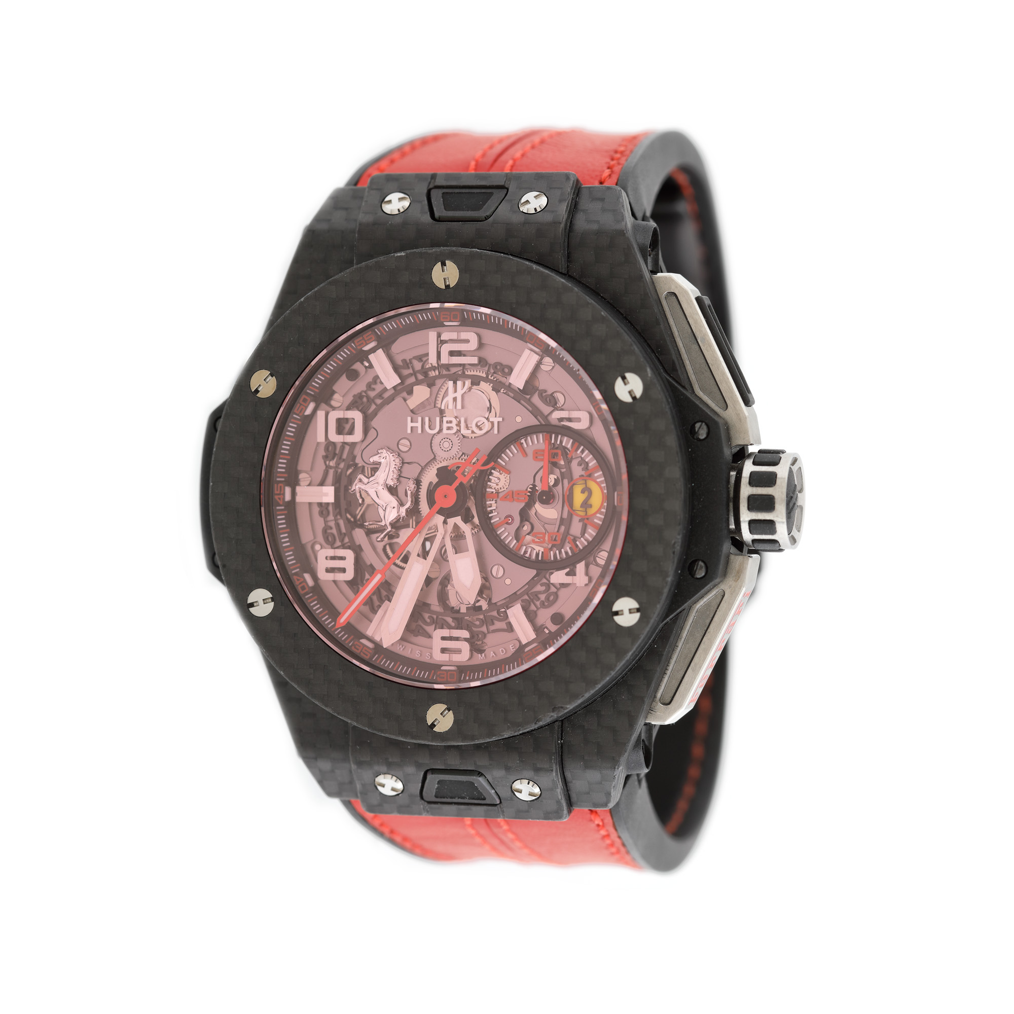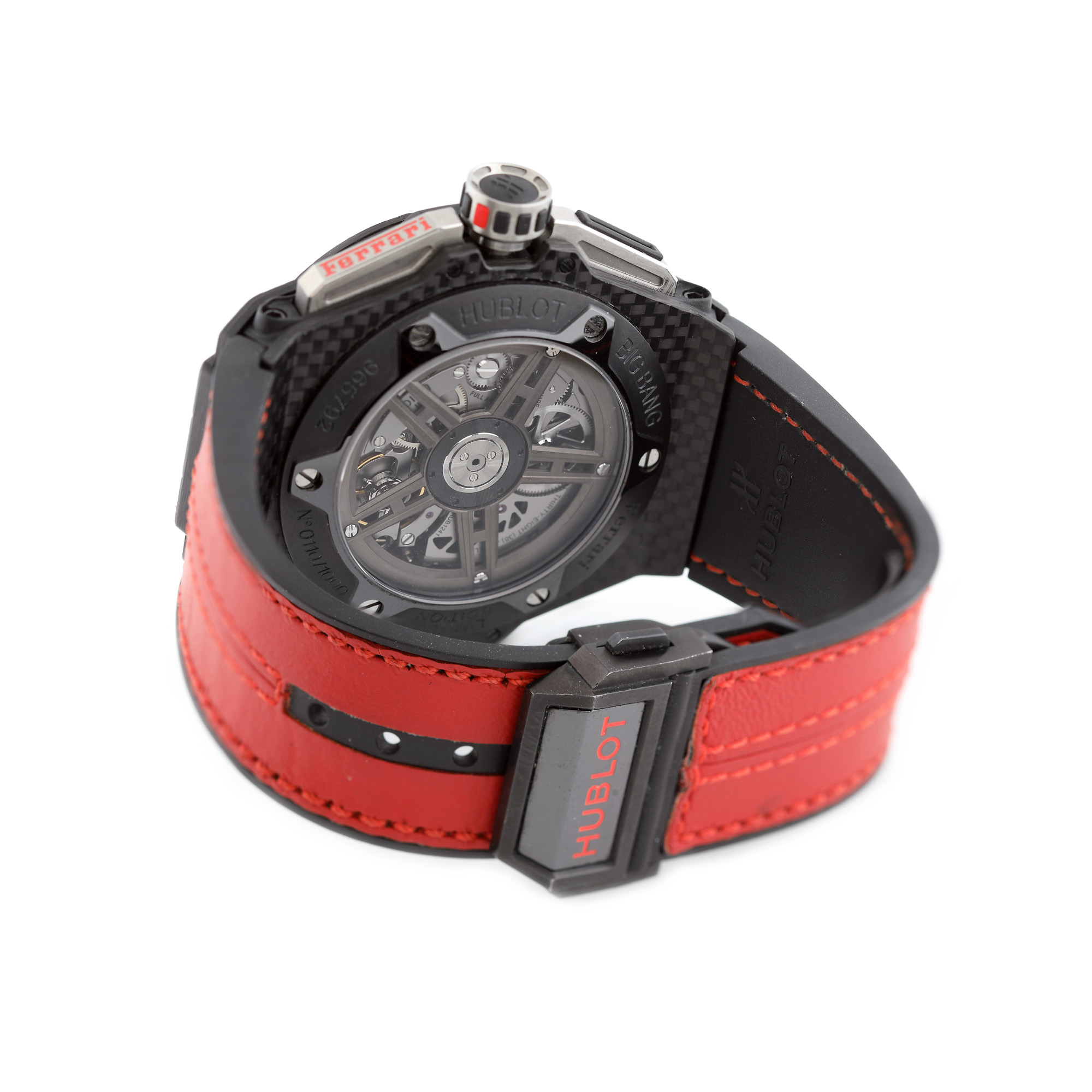 Ceas Hublot Big Bang Ferrari, din carbon, de mână, bărbătesc, referință 401.QX.0123.VR, mecanism automatic. Cadran skeleton , numerale arabe, registru și dată în dreptul orei 3, Curea din piele, de culoare roșie, și sistem de închidere tip deployant. Geam din safir sintetic roșu.