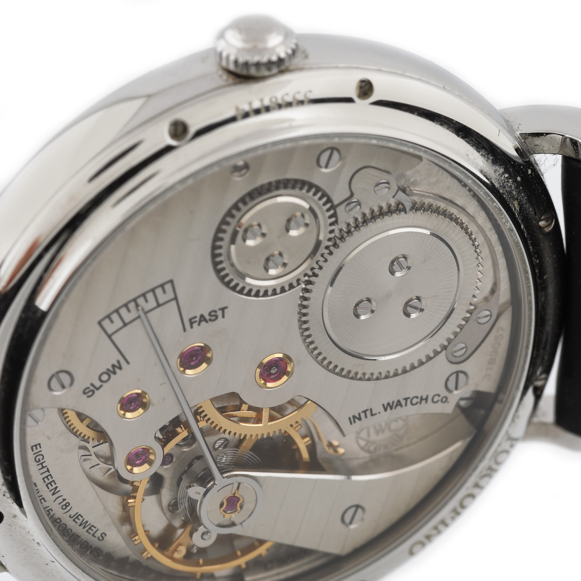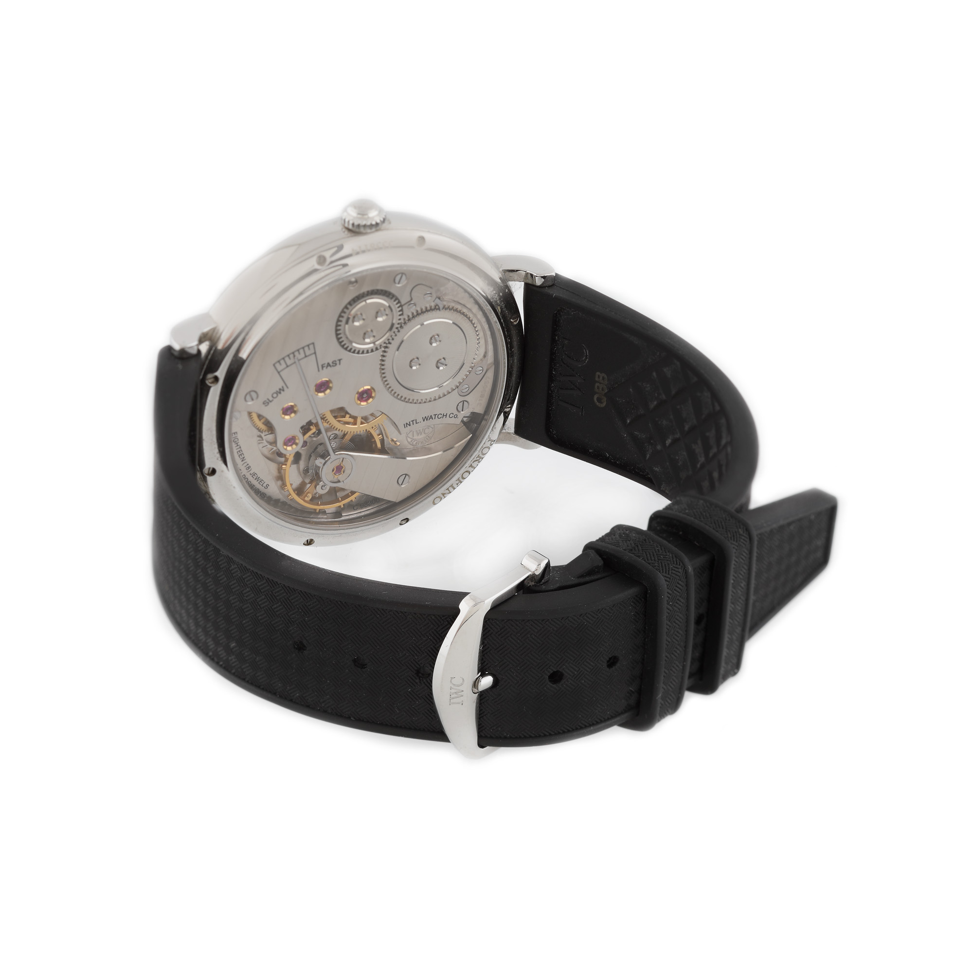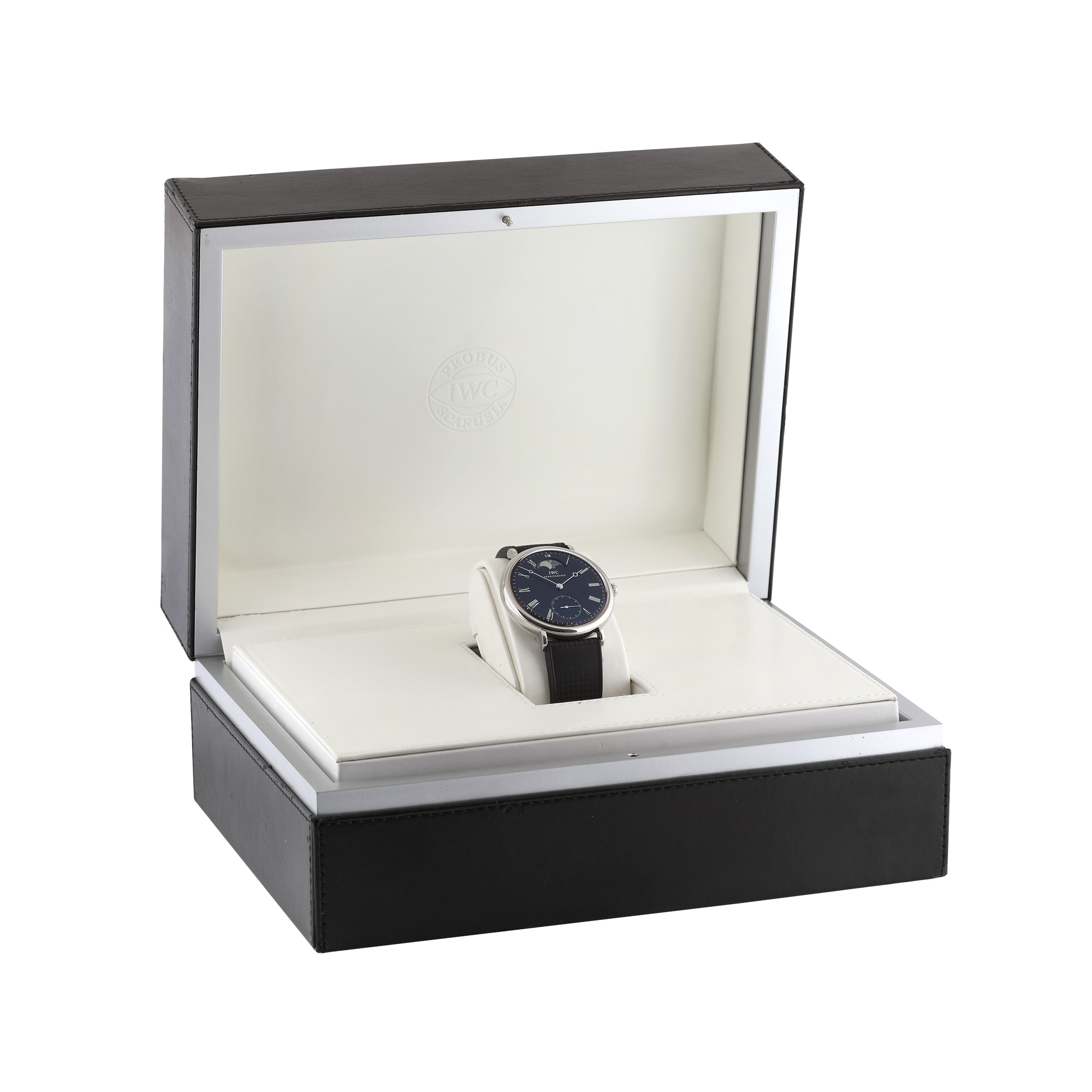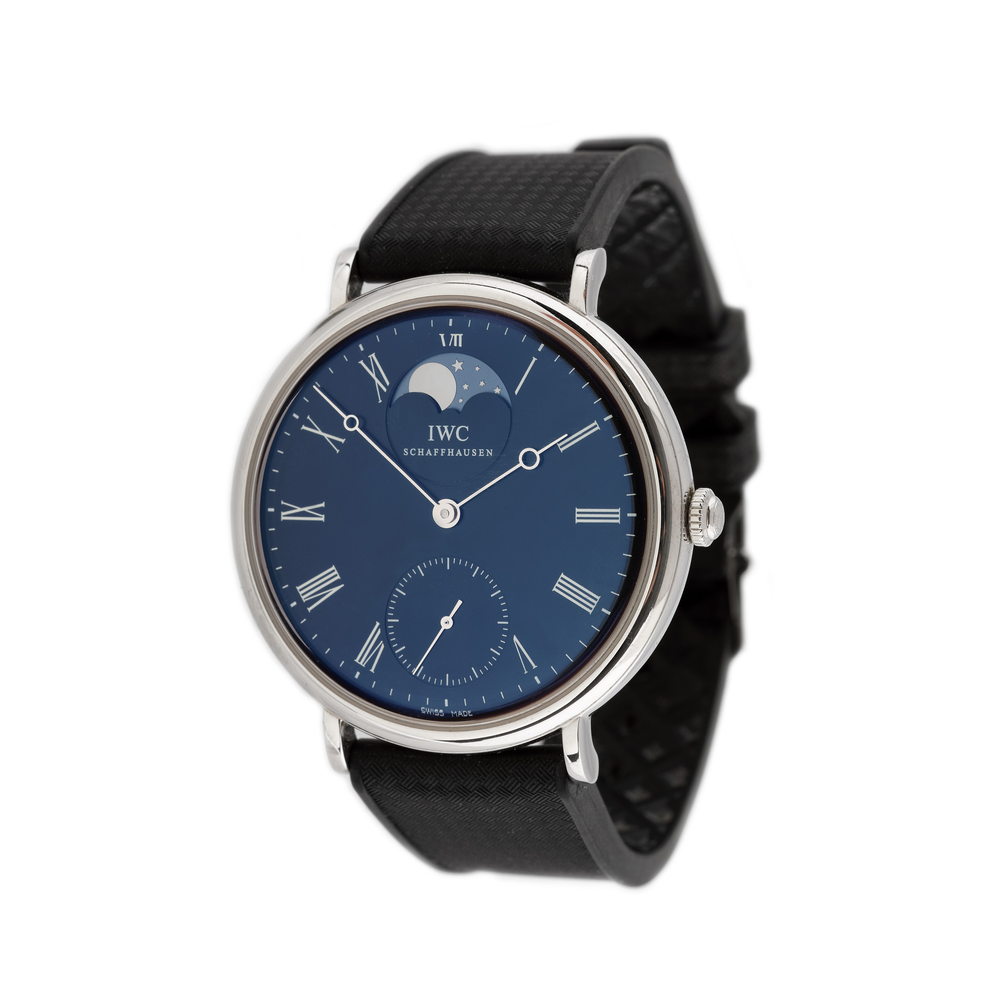 Ceas IWC Portofino Moonphase, de mână, bărbătesc, referință IW544801, mecanism cu armare manuală. Cadran de culoare negru, numerale romane, registru pentru fazele lunii în dreptul orei 12 și registru pentru secundar în dreptul orei 6. Curea din cauciuc, de culoare neagră și cataramă originală. Ceasul vine însoțit de accesorii: cutia originală, curea de rezervă din piele de aligator, de culoare neagră și acte de proveniență: manual de utilizare și card de garanție datat (28.08.2012) și semnat.