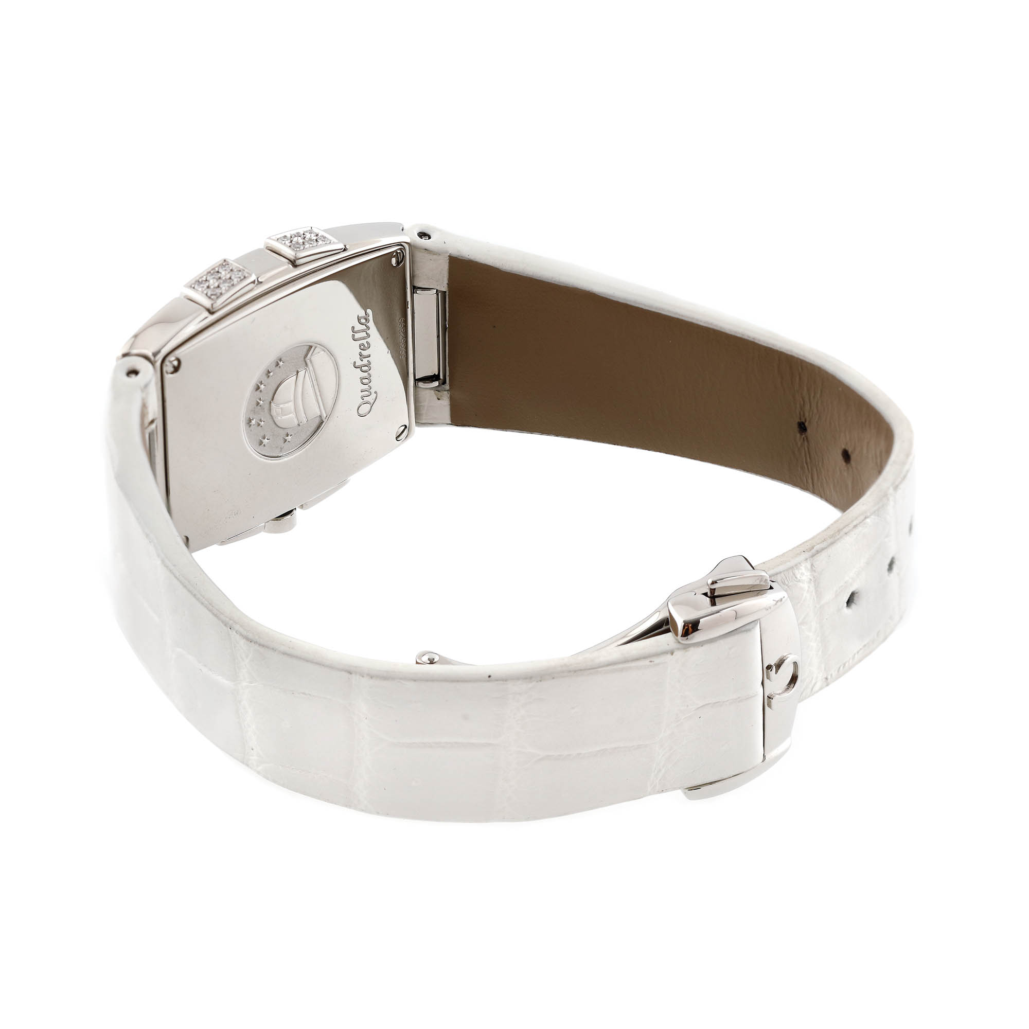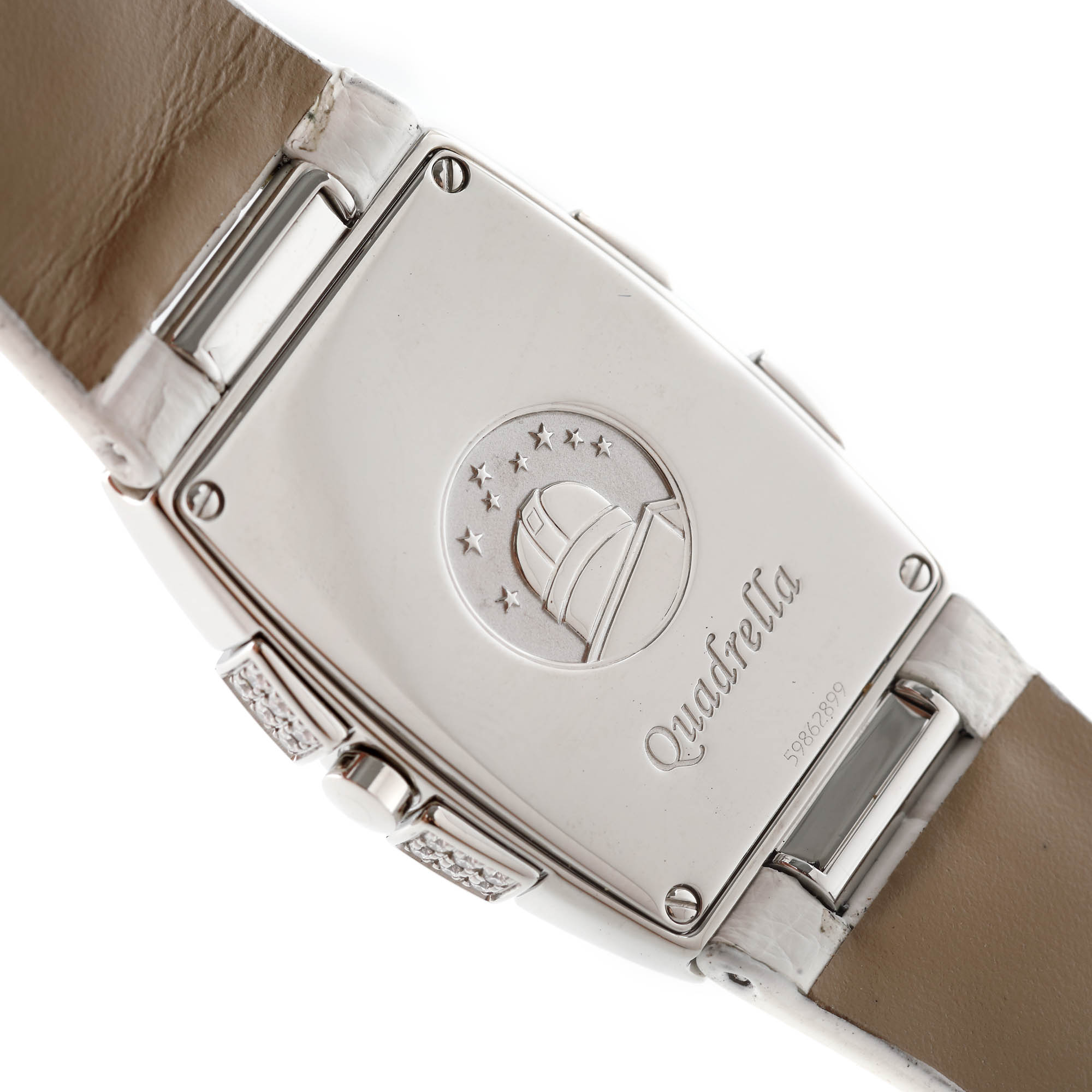 Ceas Omega Constellation Quadrella, de mână, de damă, referință 1886.79.40, mecanism quartz. Cadran alb, cu numerale romane și diamante dispuse pe bezel. Curea albă, din piele, cu închizătoare tip deployant.