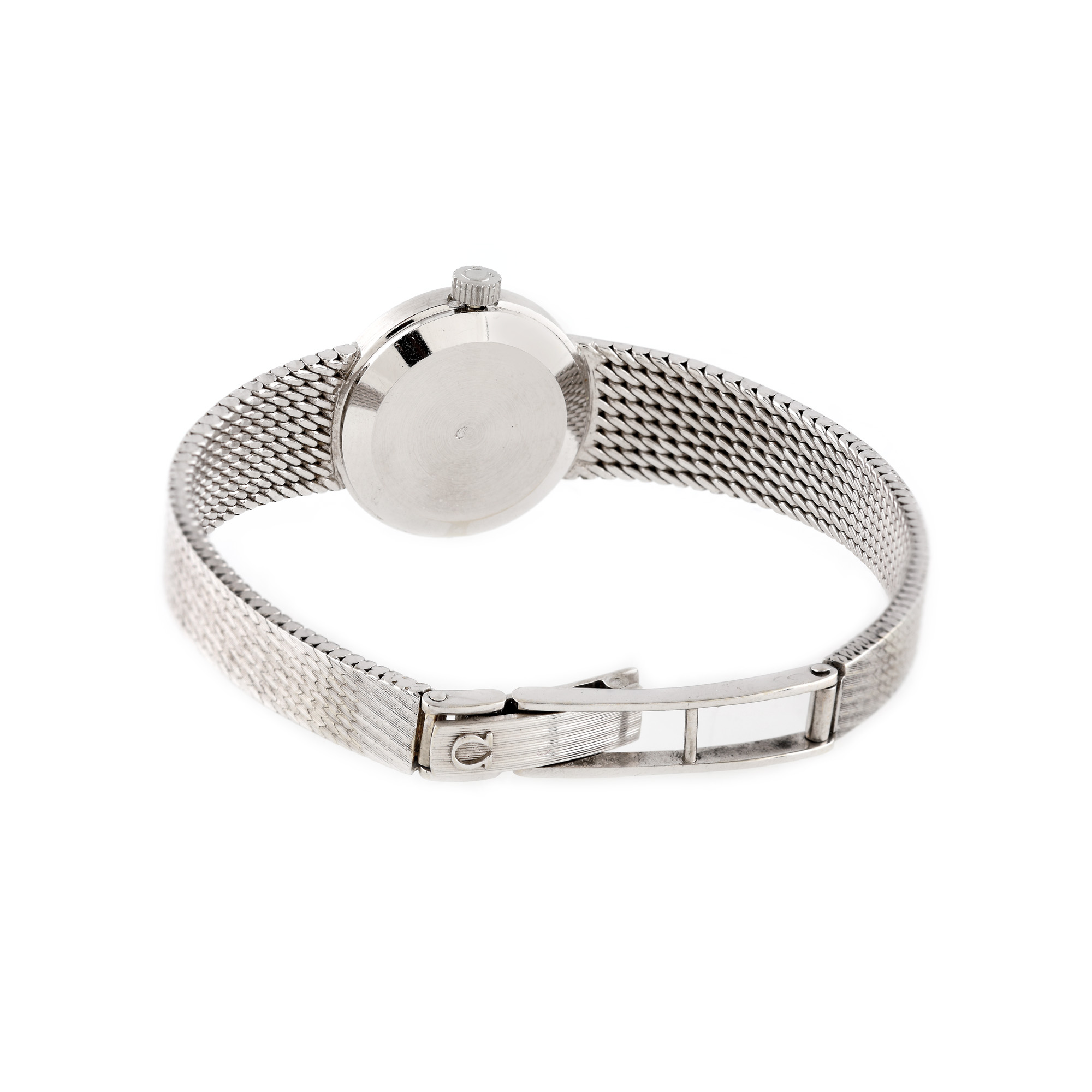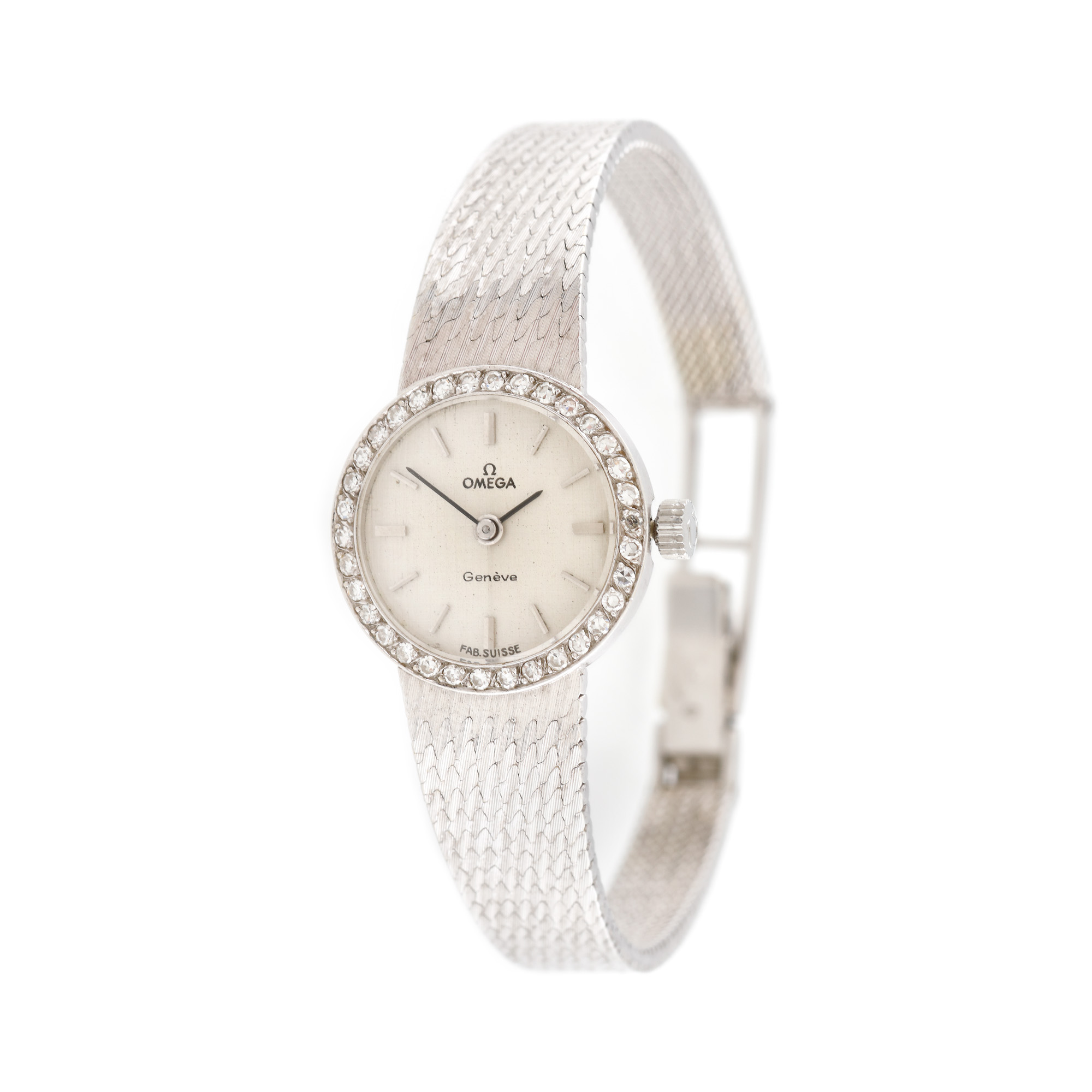 Ceas Omega Genève din aur alb, de mână, de damă, cu mecanism cu armare manuală și cadran argintiu.