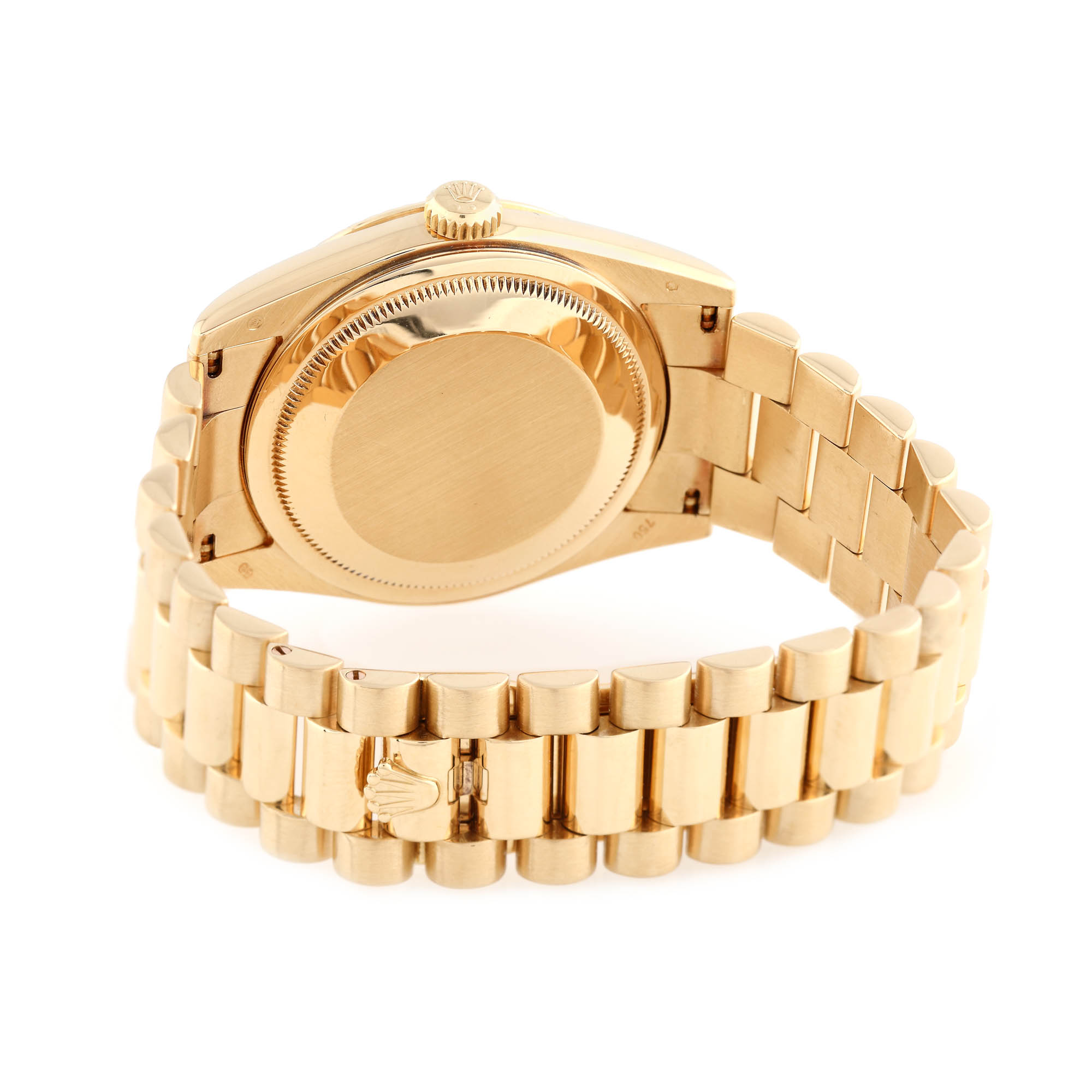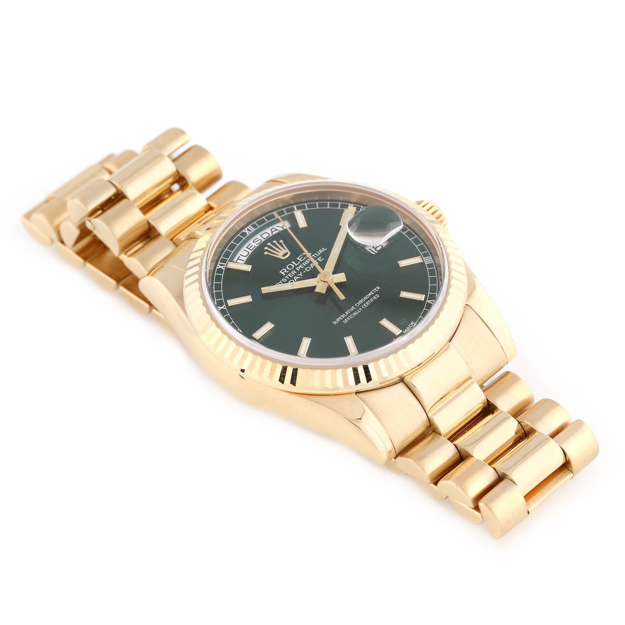 Ceas Rolex Day-Date din aur, de mână, bărbătesc, referință 118238, mecanism automatic, calibru 3155, rezervă de timp de 48 h. Cadran de culoare verde smarald, cu ziua săptămânii la ora 12 și dată cu lupă în dreptul orei 3. Ceasul vine însoțit de cutia originală, manualul de utilizare și certificatul de garanție, semnat și datat 01/03/07, distribuitor Andreas Schmid.
