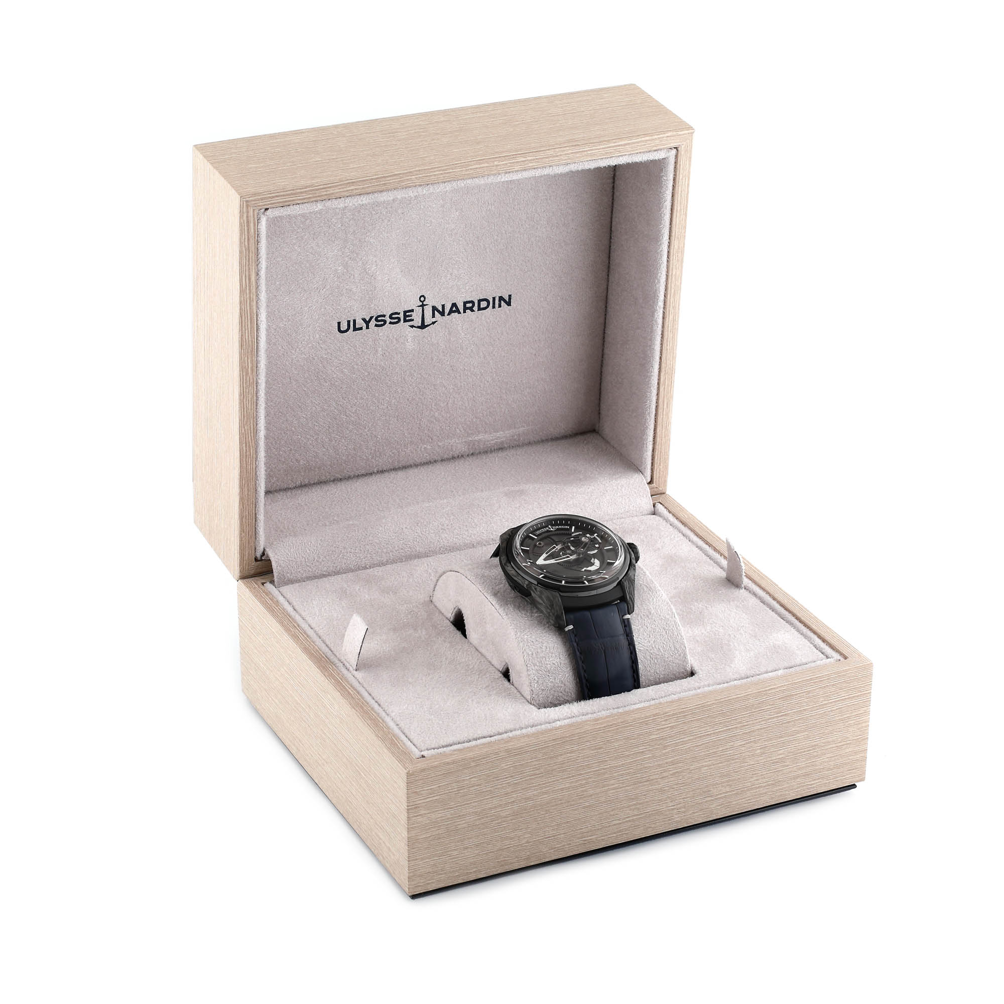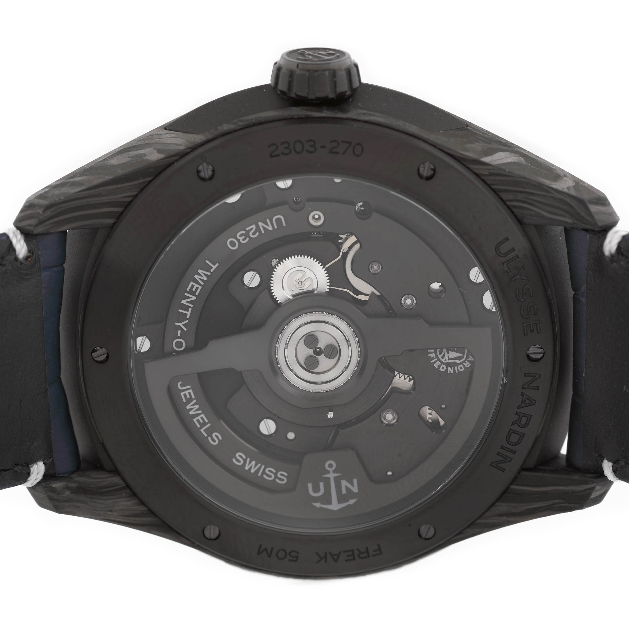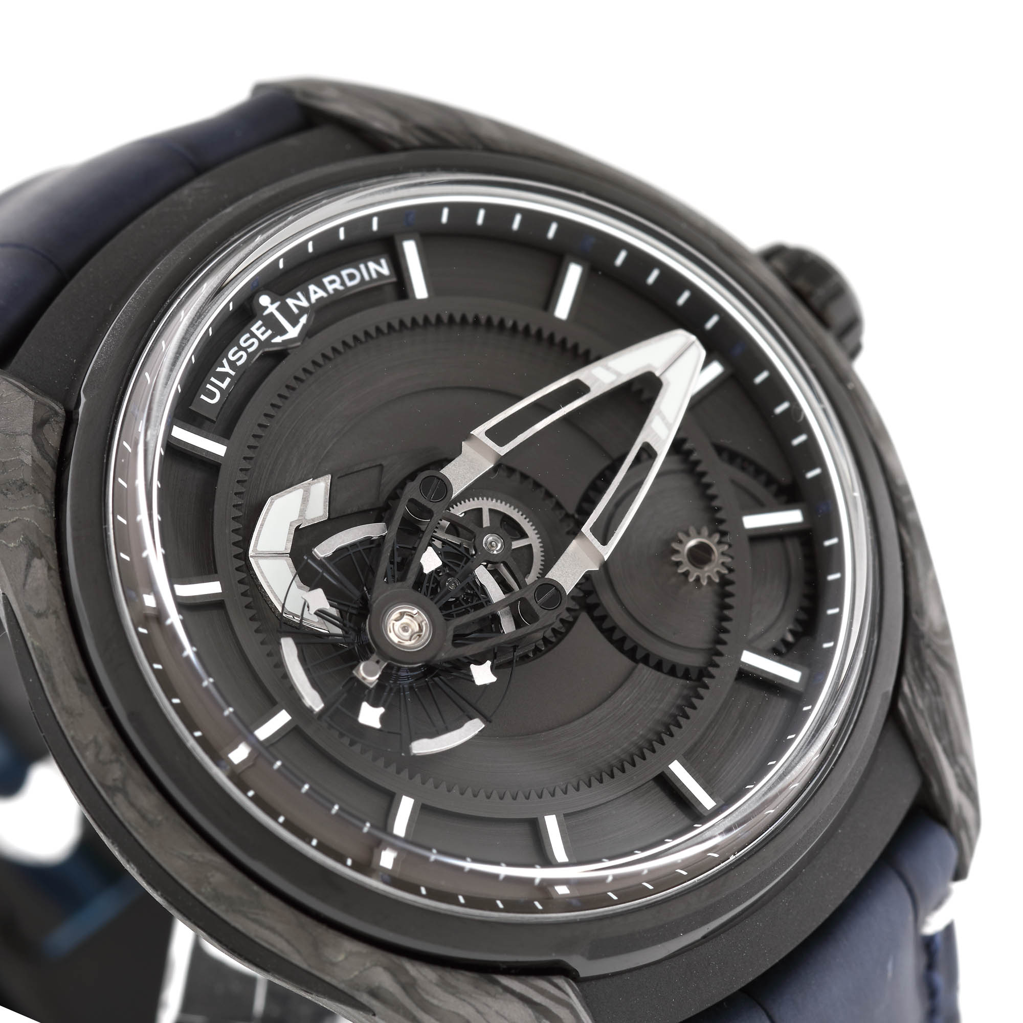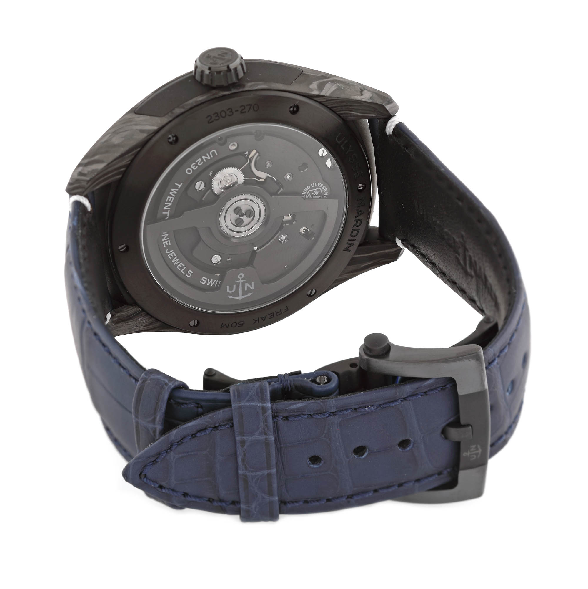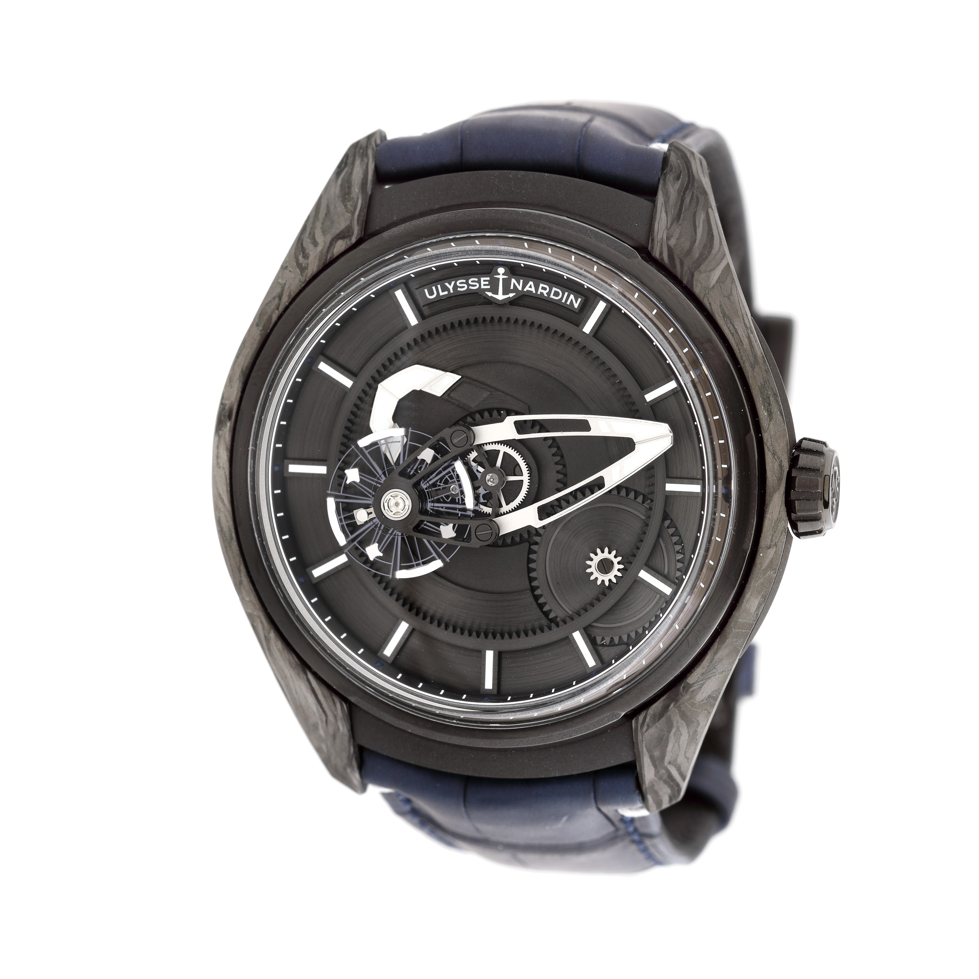 Ceas Ulysse Nardin Freak X, din carbon, de mână, bărbătesc, referință 2303-270/carb, mecanism automatic. Cadran de culoare negru, parțial vitrat. Curea din piele, de culoare bleumarin și sistem de închidere tip deployant. Ceasul este însoțit de cutia originală.