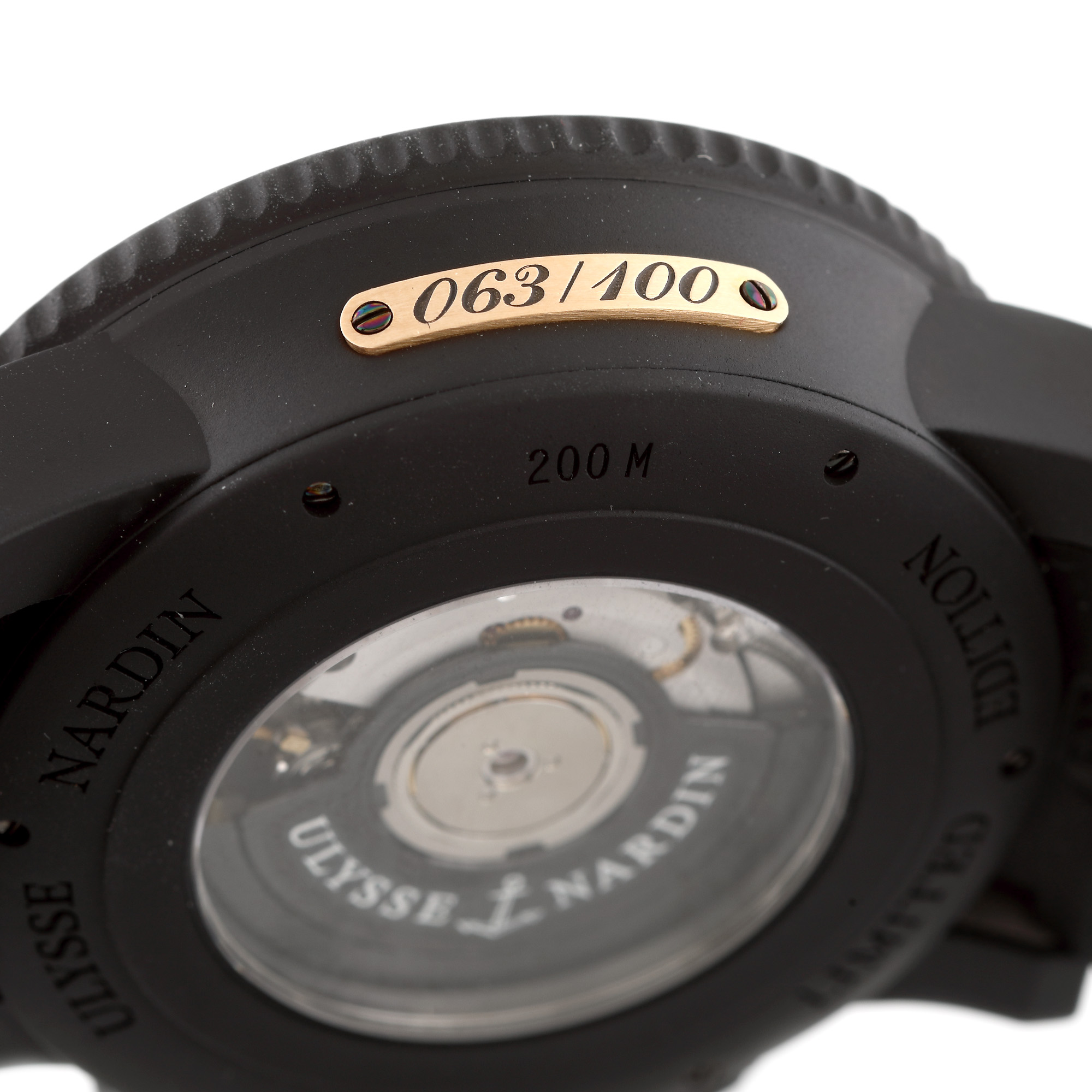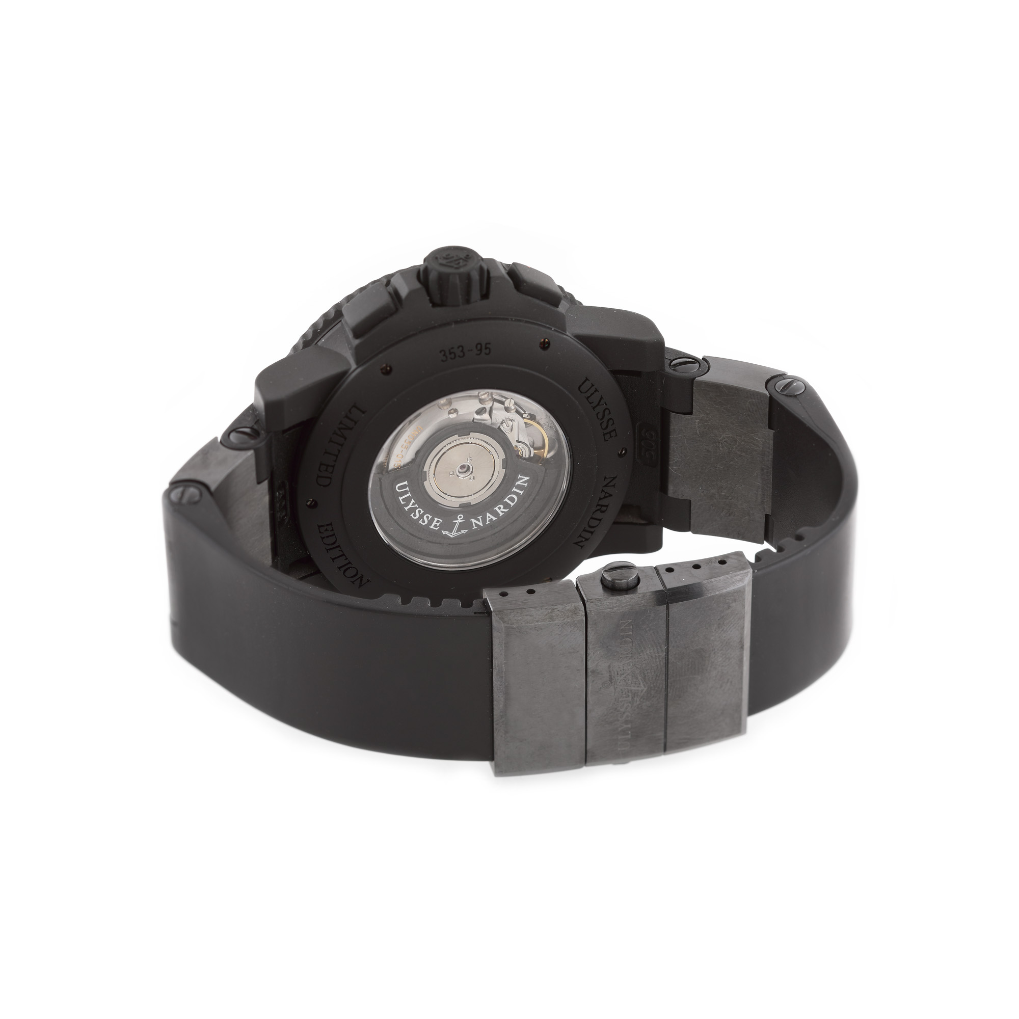 Ceas Ulysse Nardin Marine Diver Chronograph "Big Unit", de mână, bărbătesc, referință 353-95, mecanism automatic. Cadran cu 3 registre, limbi și indecși orari luminiscenți, dată între orele 4 și 5. Curea din cauciuc, cu sistem închidere tip deployant. Ceasul vine însoțit de cardul de garanție ștampilat, nedatat, unde sunt menționate următoarele informații: referința și numărul carcasei.