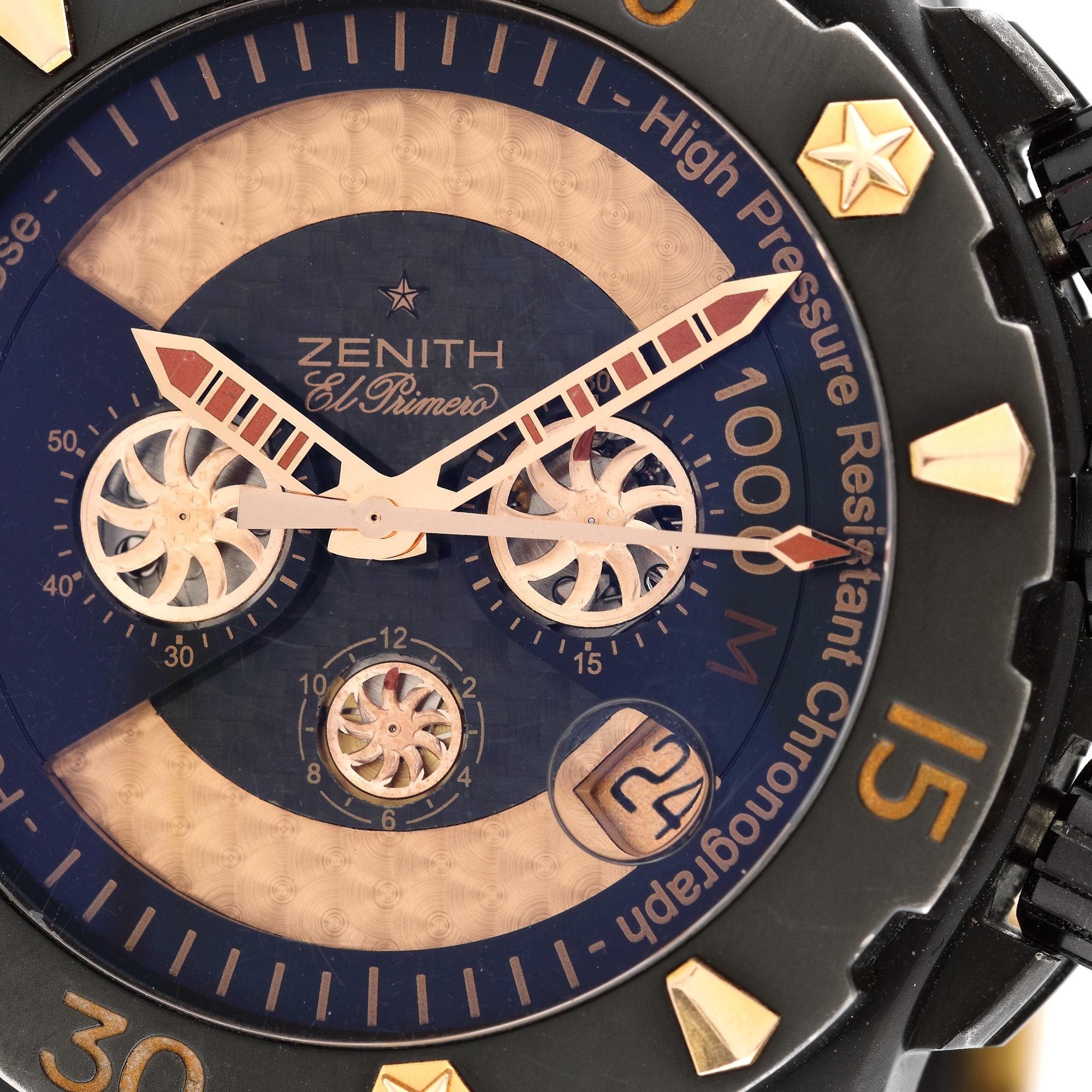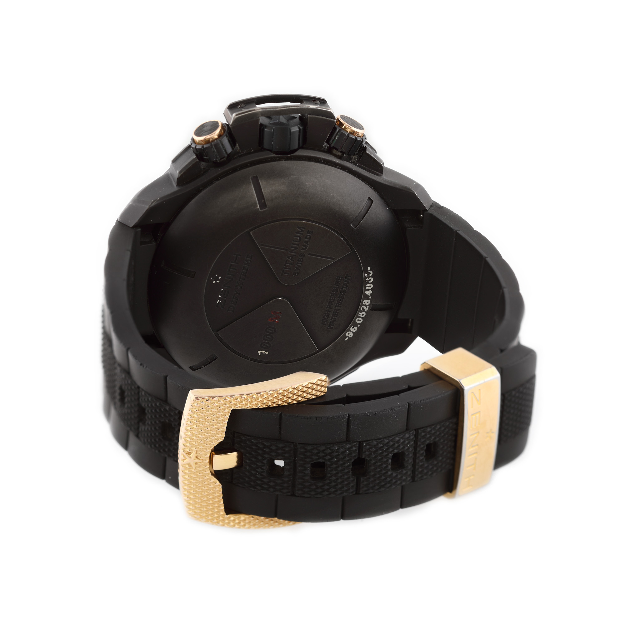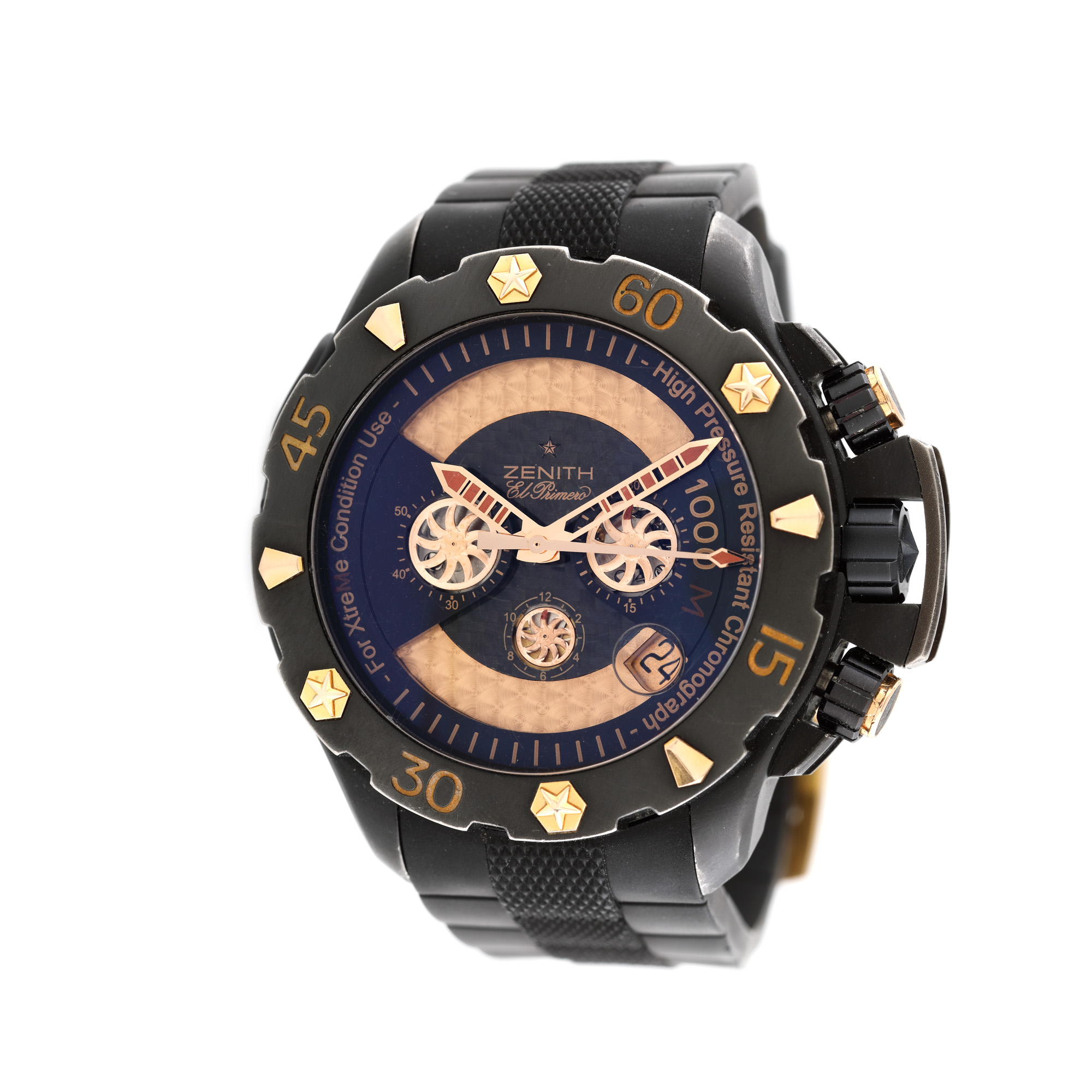 Ceas Zenith El Primero Defy Xtreme de mână, bărbătesc, referință 96-0528-4000, mecanism automatic chronograph. Carcasă din titan, bezel rotativ unidirecțional, cadran stratificat, în cromatică negru și auriu, cu fibră de carbon și aluminiu lăcuit. Dată cu lupă între ora 4 și 5. Curea din cauciuc și cataramă din aur roz 18 k. În 1865, în orașul Le Locle din cantonul elvețian Neuchâtel, vizionarul ceasornicar George Favre-Jacot a avut determinarea să creeze cele mai precise și mai fiabile ceasuri din timpul său. El a revoluționat modul de producere a ceasurilor, reunind întreaga gamă de profesii de ceasornicar sub un singur acoperiș. Procedând astfel, a facilitat controlul sistematic al fiecărei componente și al mecanismului complet. Regruparea acestor abilități într-un singur loc a stimulat semnificativ progresul tehnicilor de producție, iar Zenith a fost într-adevăr capabil să producă cele mai precise și mai fiabile ceasuri de până acum. Până în prezent, Zenith rămâne unul dintre rarii producători capabili să producă toate piesele ceasurilor sale, iar Zenith Defy Xtreme Chronograph Automatic întrunește toate recompensele acestei întregi istorii.