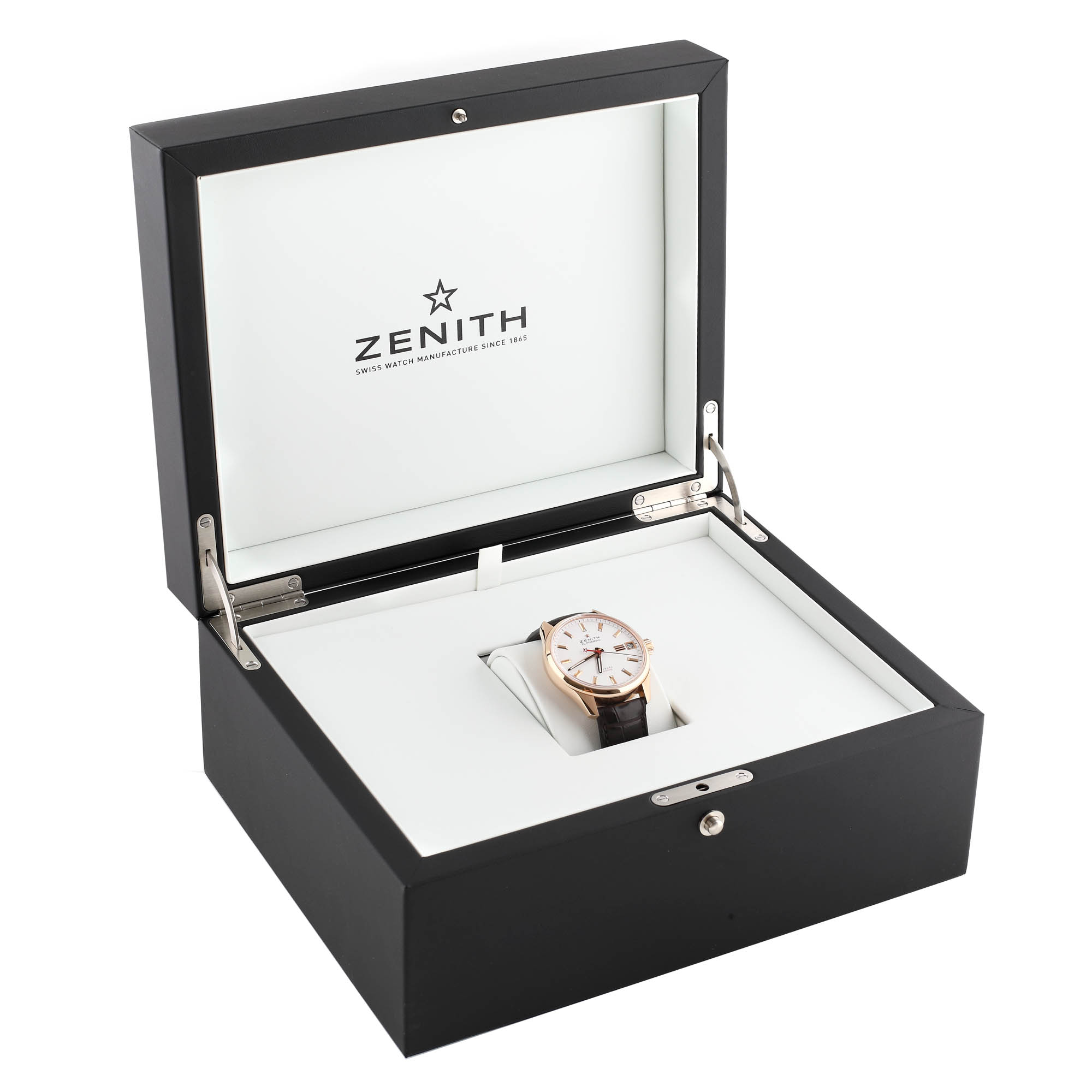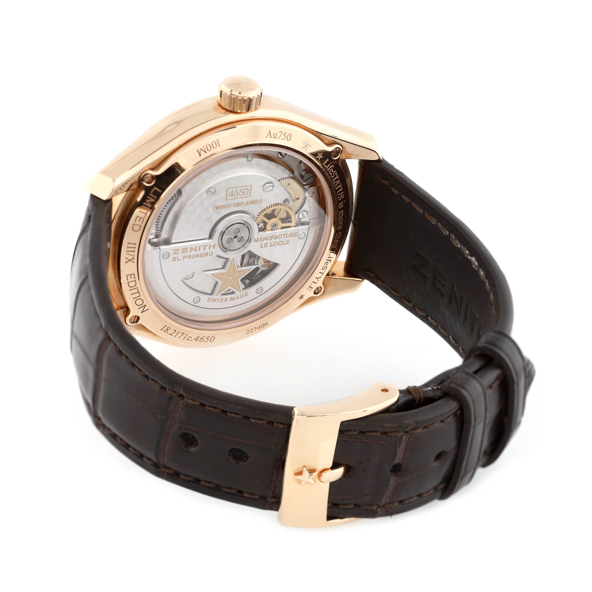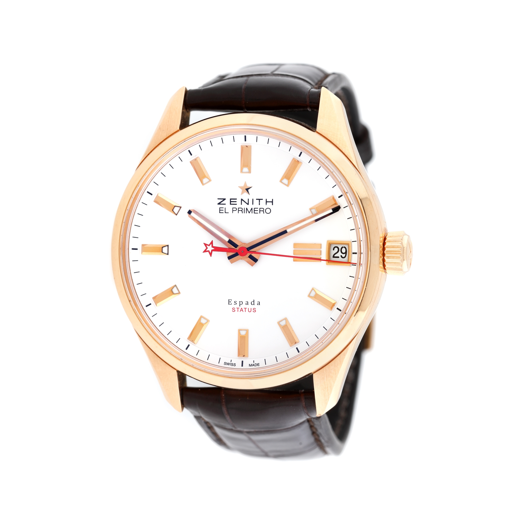 Ceas Zenith El Primero Espada din aur, de mână, bărbătesc, referință 18.2171C.4650/01.C498, mecanism automatic, vitrat anterior. Cadran alb, cu indecși orari aurii și dată în dreptul orei 3. Curea din piele de crocodil, neagră, cu cataramă originală din aur. Actele de proveniență cuprind cardul de garanție internațională nedatat și certificatul de autenticitate semnat de Jean-Frédéric Dufour. Ceasul vine însoțit de accesorii: cutie originală, stick, manual de utilizare, lavetă pentru curățare și panoul de prezentare semnat Jean-Frédéric Dufour.