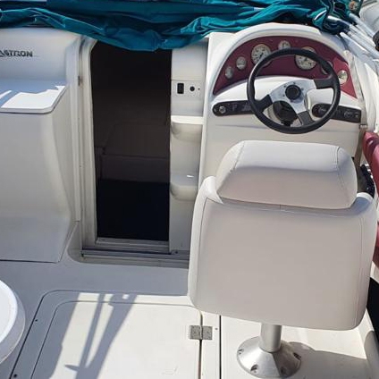 Barcă de agrement Glastron GS 229 cuddy cabin, echipată cu motor inboard Volvo Penta 5.0 GL benzină, cu o putere de 161.8 kw (220 Cp), capacitate de 12 persoane, 506 ore de funcționare. Cabină de dormit cu trei locuri, chiuvetă, masă, bimini top, sistem audio cu boxe marine, lumini navigație, sonar nou, ancoră de 20Kg. Revizie recent efectuată, schimbat: ulei de motor, filtre, bujii, impeler, talpă, elice. Barca vine însoțită de peridoc cu două axe.
