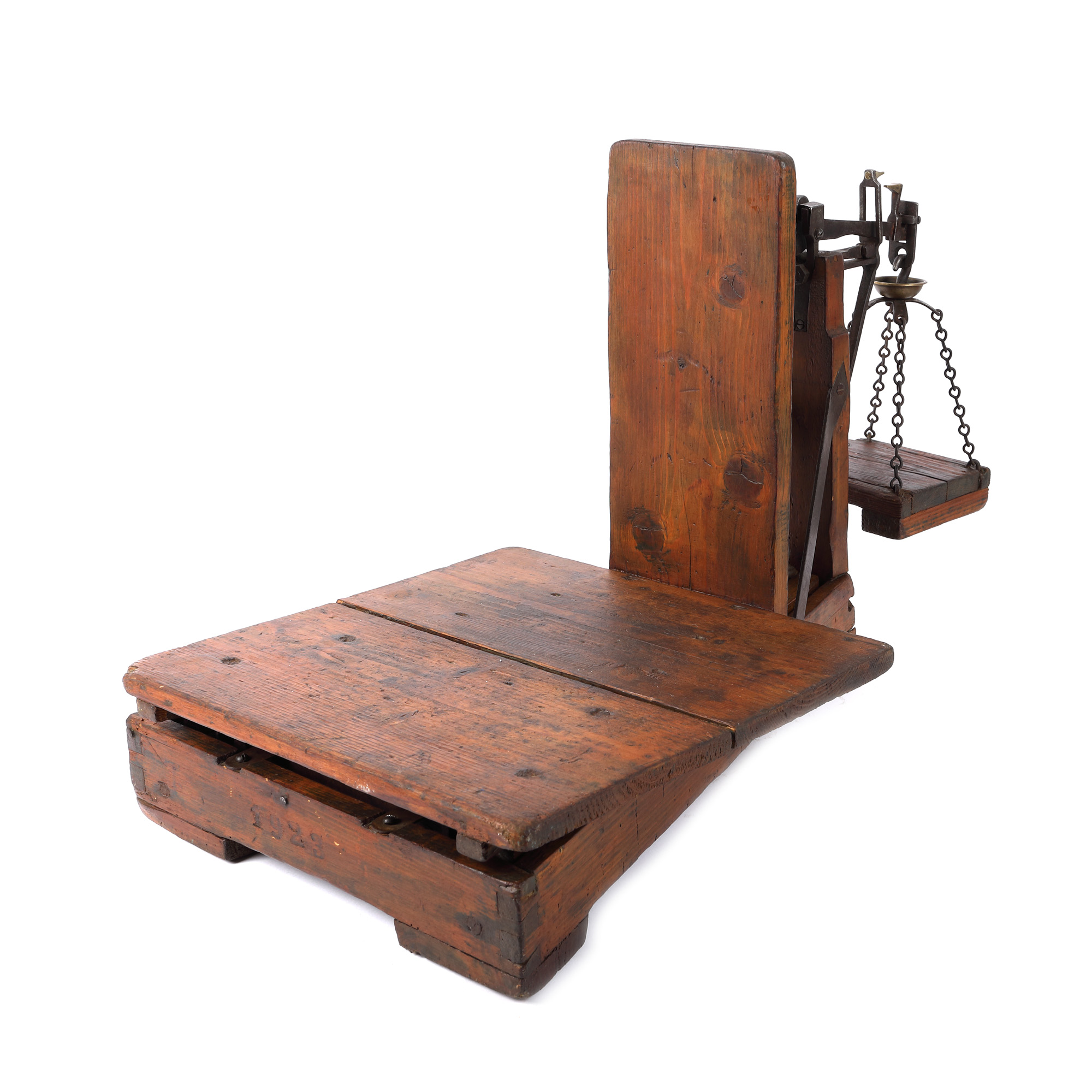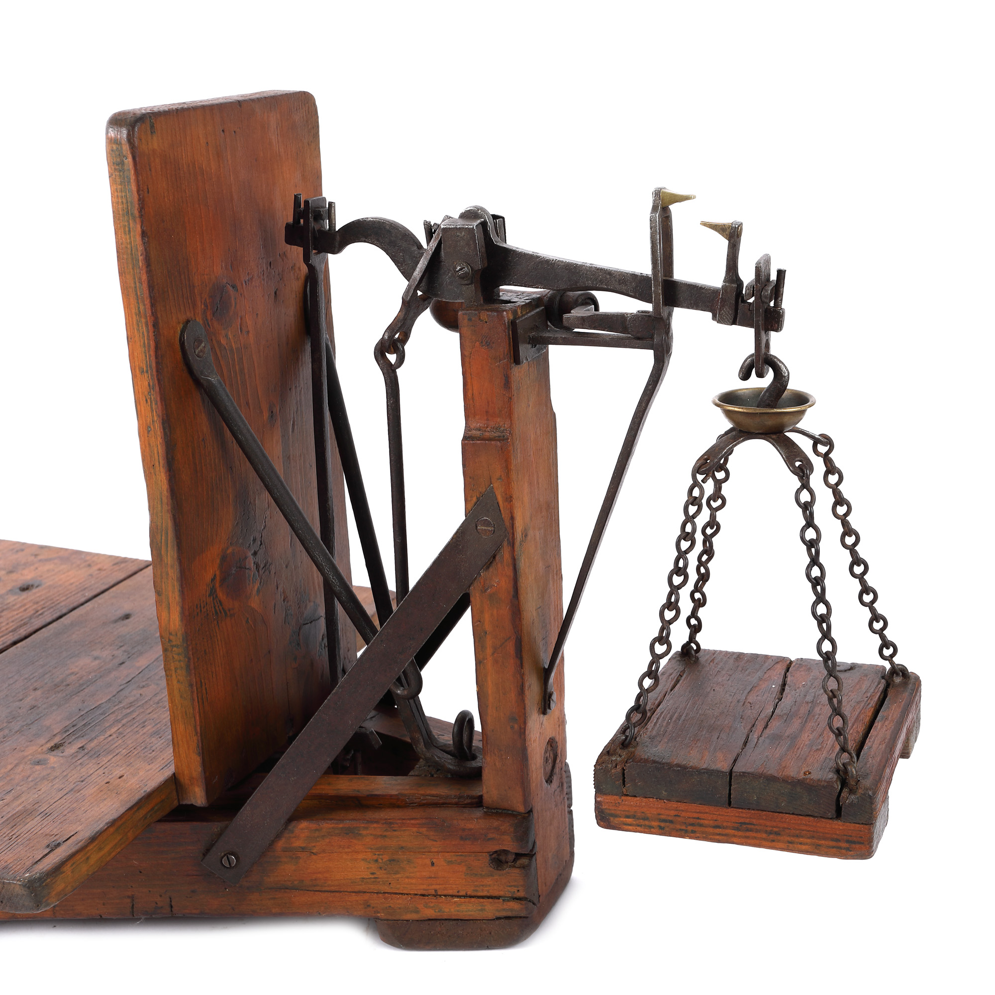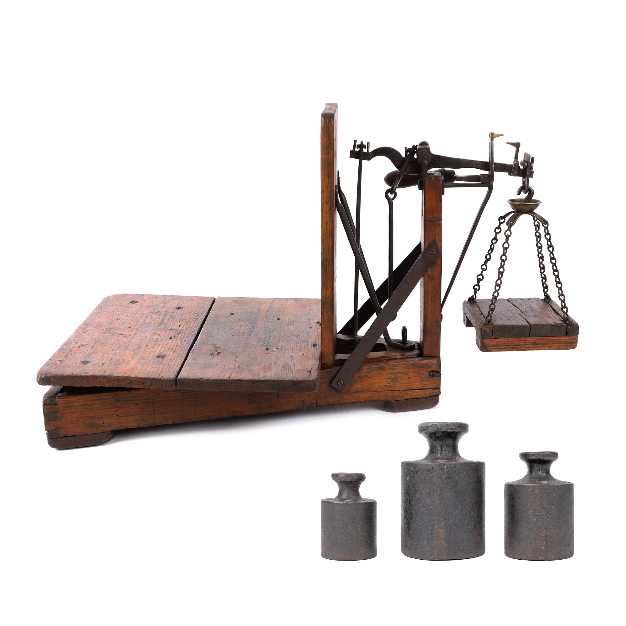 75. Cântar de podea, din lemn, cu trei greutăți, prima jumătate a sec. XX
