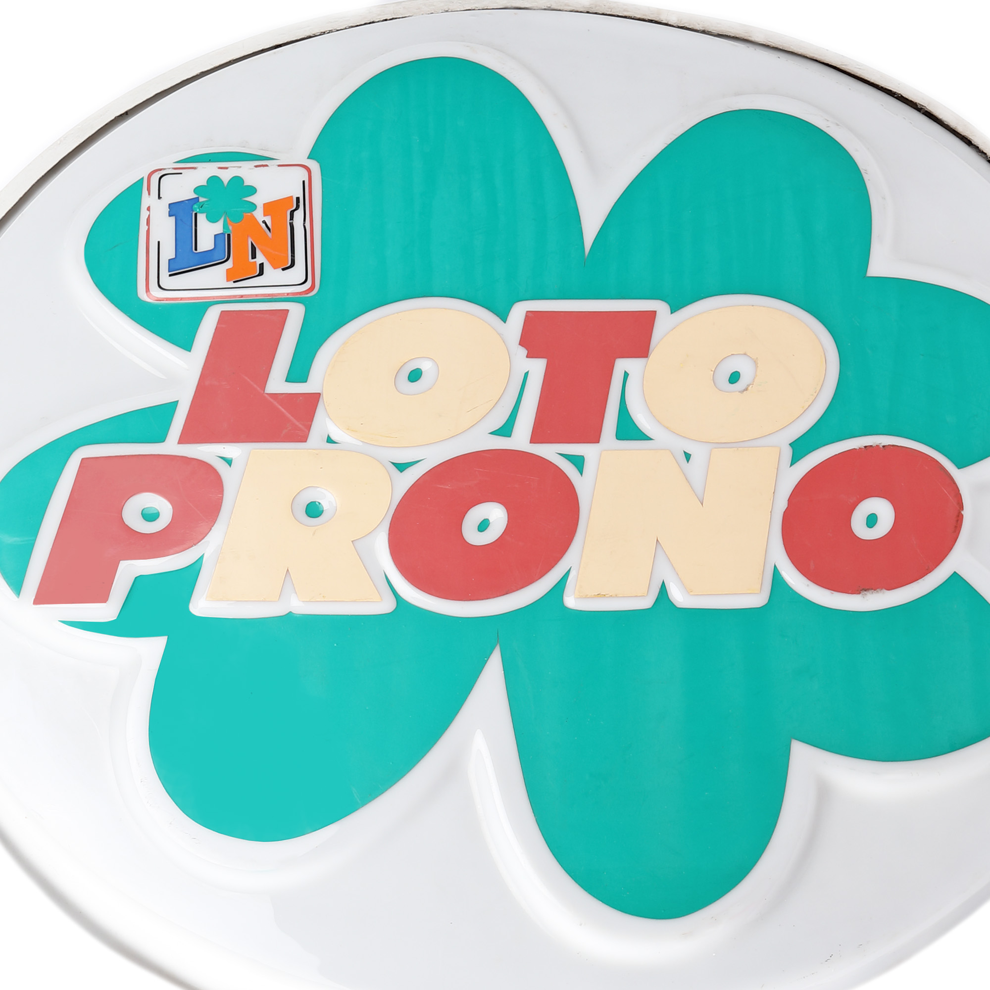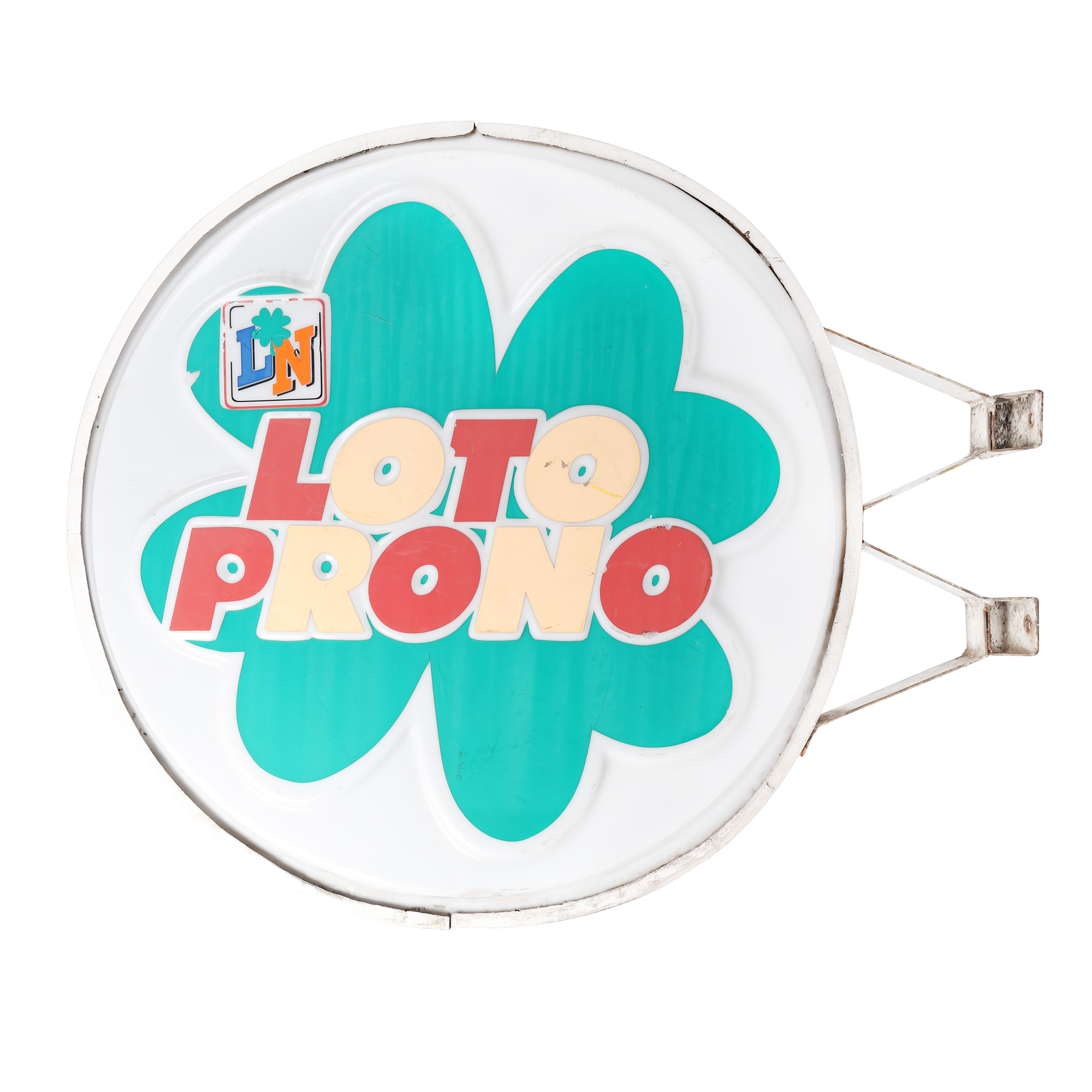 Reclama este însoțită de doi suporți din metal și un sticker 3D inscripționat cu inițialele Loteriei Naționale.