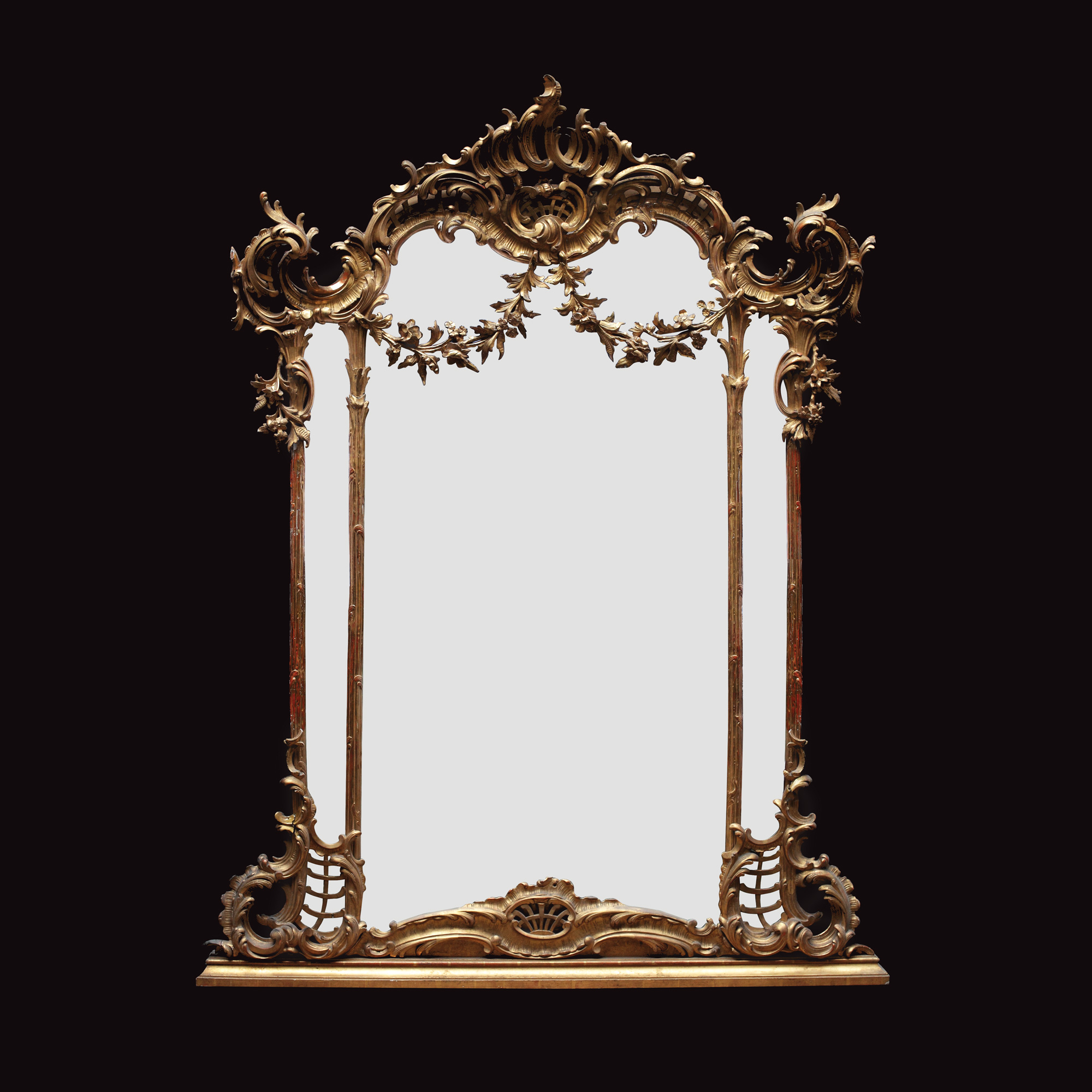 Oglinda este încadrată de o ramă lată din lemn sculptat, aurit, cu motive vegetale stilizate al cărei fronton amplu ajurat marchează planul superior bogat sculptat cu volute, ghirlande florale şi scoici în contur franjurat. Cristalul prezintă un bizot lat urmărind conturul ramei. Ansamblul era destinat decorării atât a spaţiilor de primire în reşedinţele nobiliare, cât şi pe cele de interior. Piesa completa ansamblul format de alte elemente de mobilier ce preluau în decoraţie aceleaşi motive. Astfel de piese de mobilier marchează trecerea spre un alt tip de locuire care va pune accentul pe funcţionalitate şi intimitate. Păstrarea dimensiunilor ample duce cu gândul la conservarea trecutului.