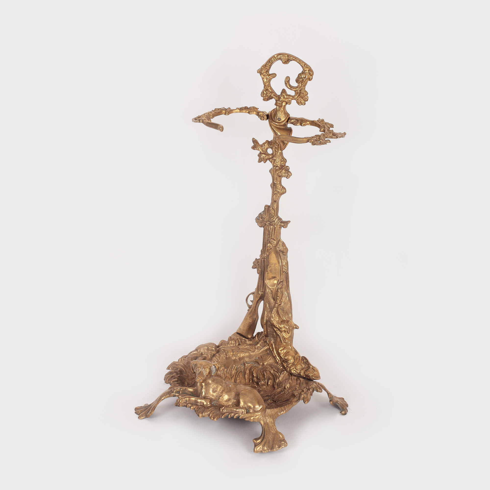 Suportul de umbrele și bastoane din bronz, piesă utilitar-decorativă, are la bază o cupă uşor adâncită decorată în basorelief cu vegetaţie de pădure, câteva păsări vânate şi un câine de vânătoare în altorelief pe latura anterioară. De pe fundal se ridică un trunchi de copac, terminat printr-un mâner inelat şi două ramuri arcuite, ce vor susţine umbrelele. În completarea atmosferei cinegetice o puşcă de vânătoare, un iepure şi un corn de vânătoare sunt figurate lângă copac.