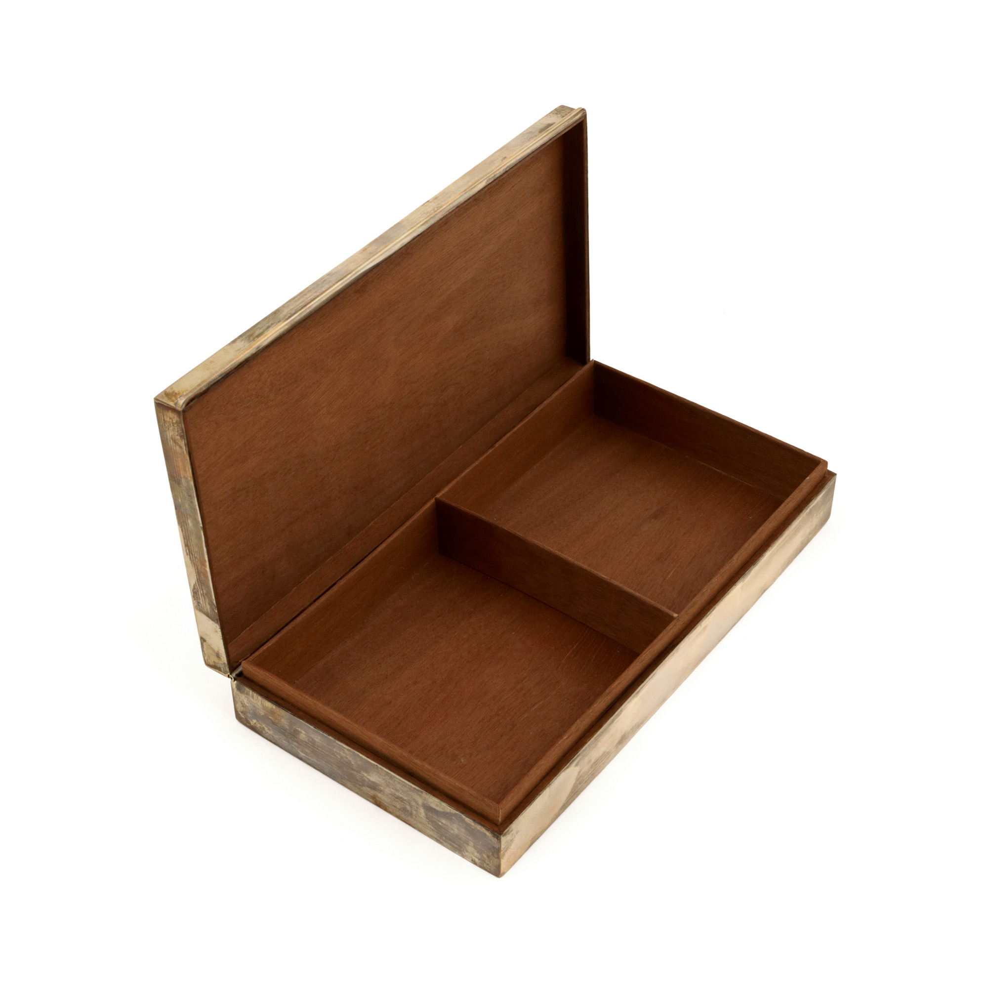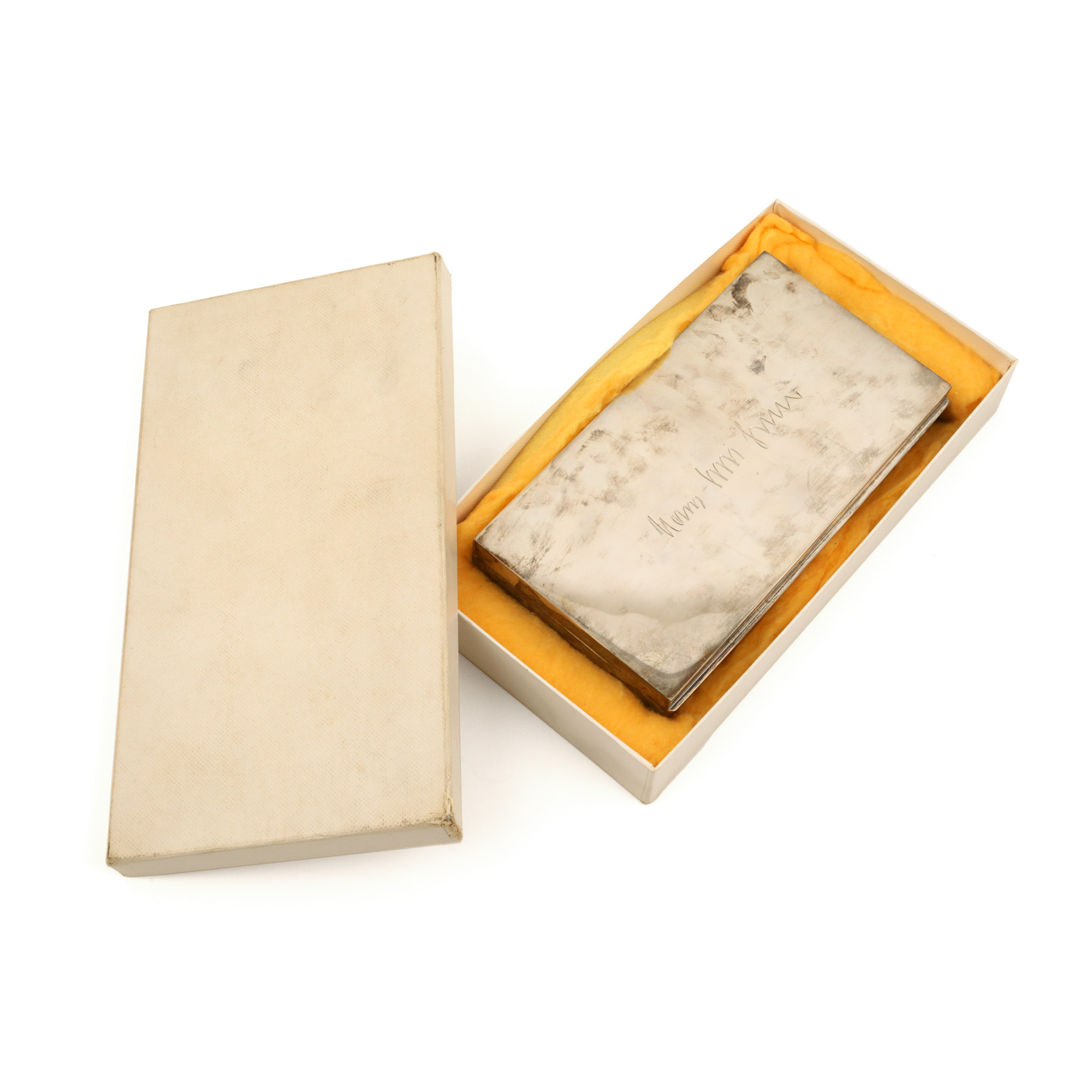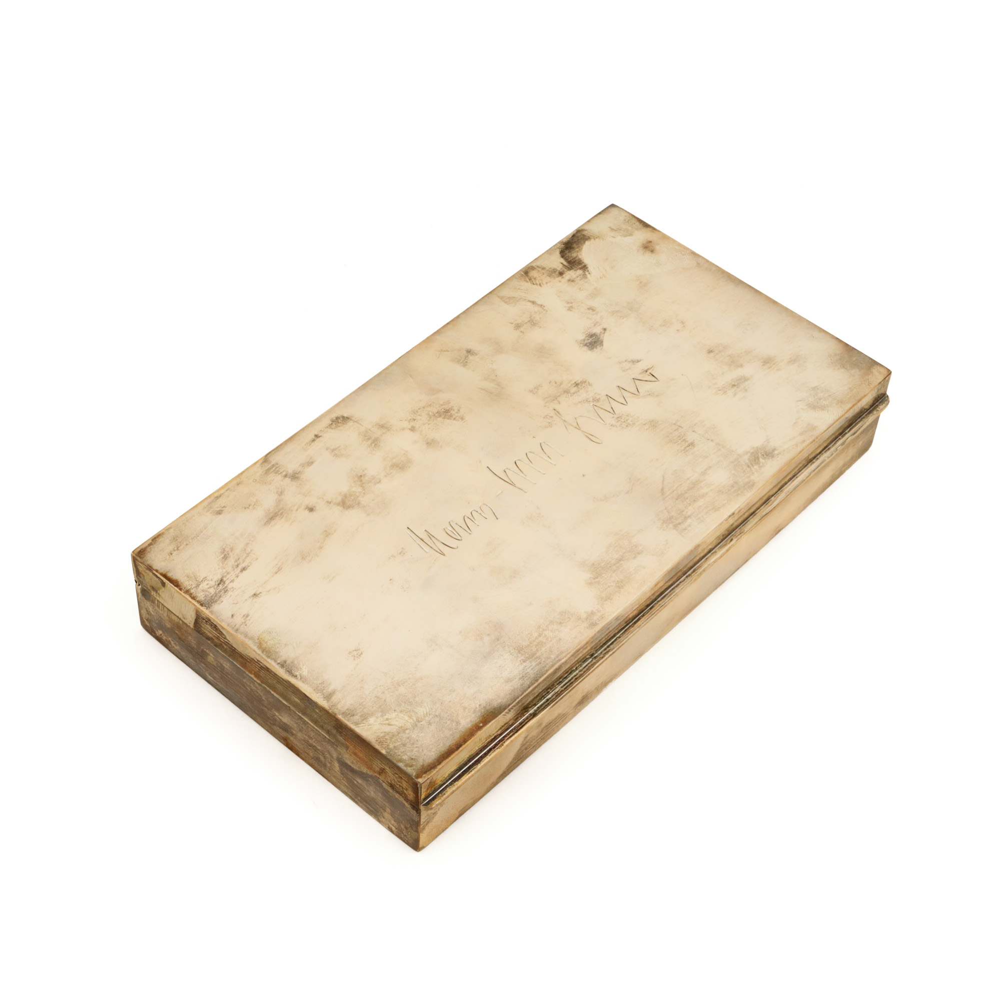 114. Cutie pentru trabucuri, din argint, inscripționată cu semnătura fostului ministru de externe al Germaniei, Hans-Dietrich Genscher, cadou de protocol, însoțită de carte de vizită [a doua jumătate a sec. XX]