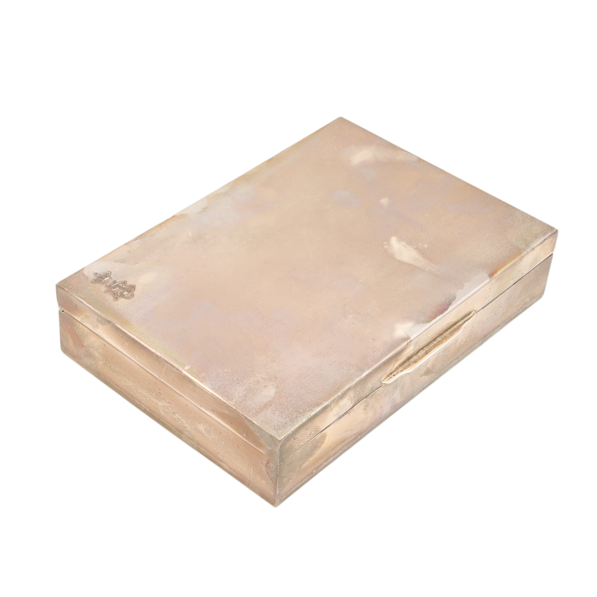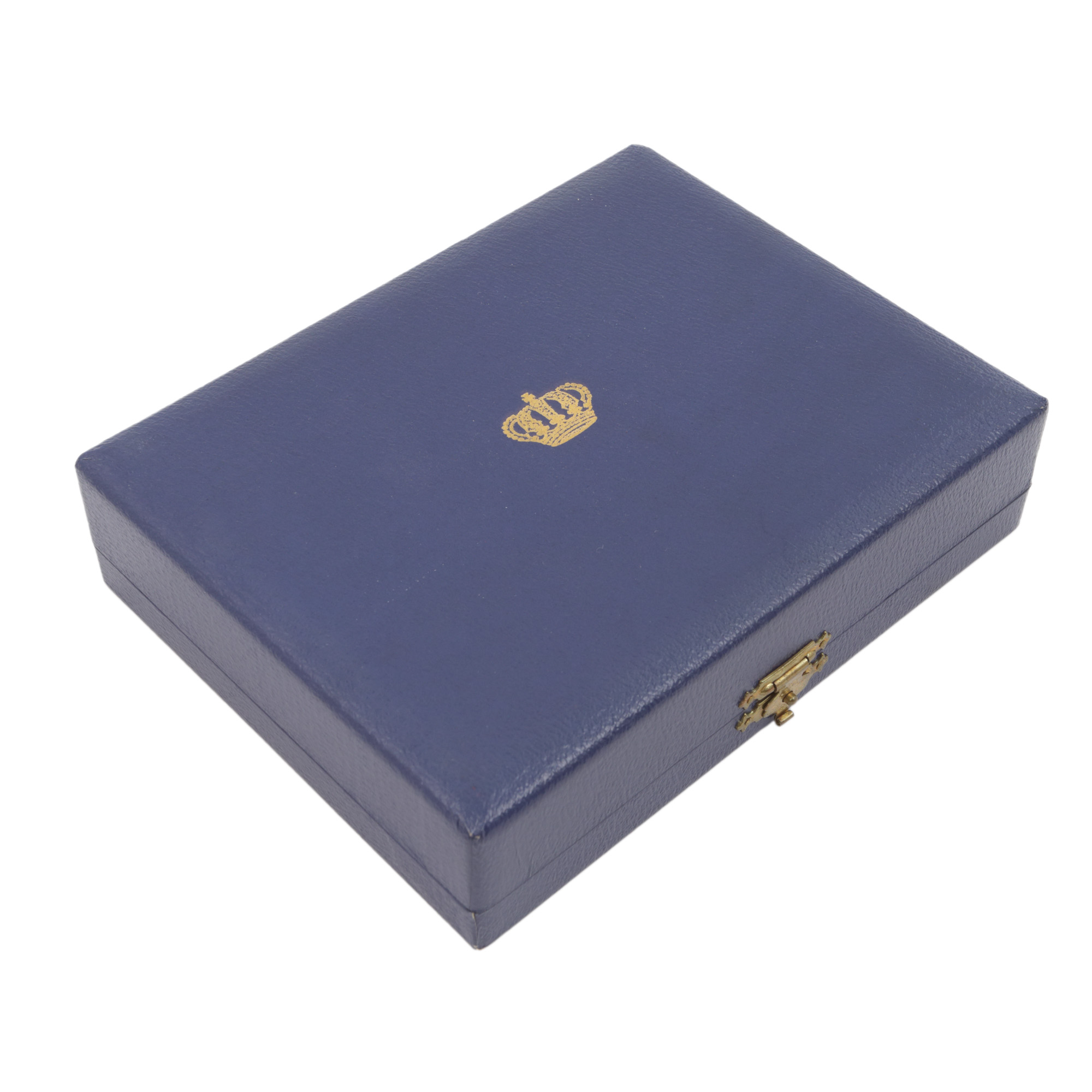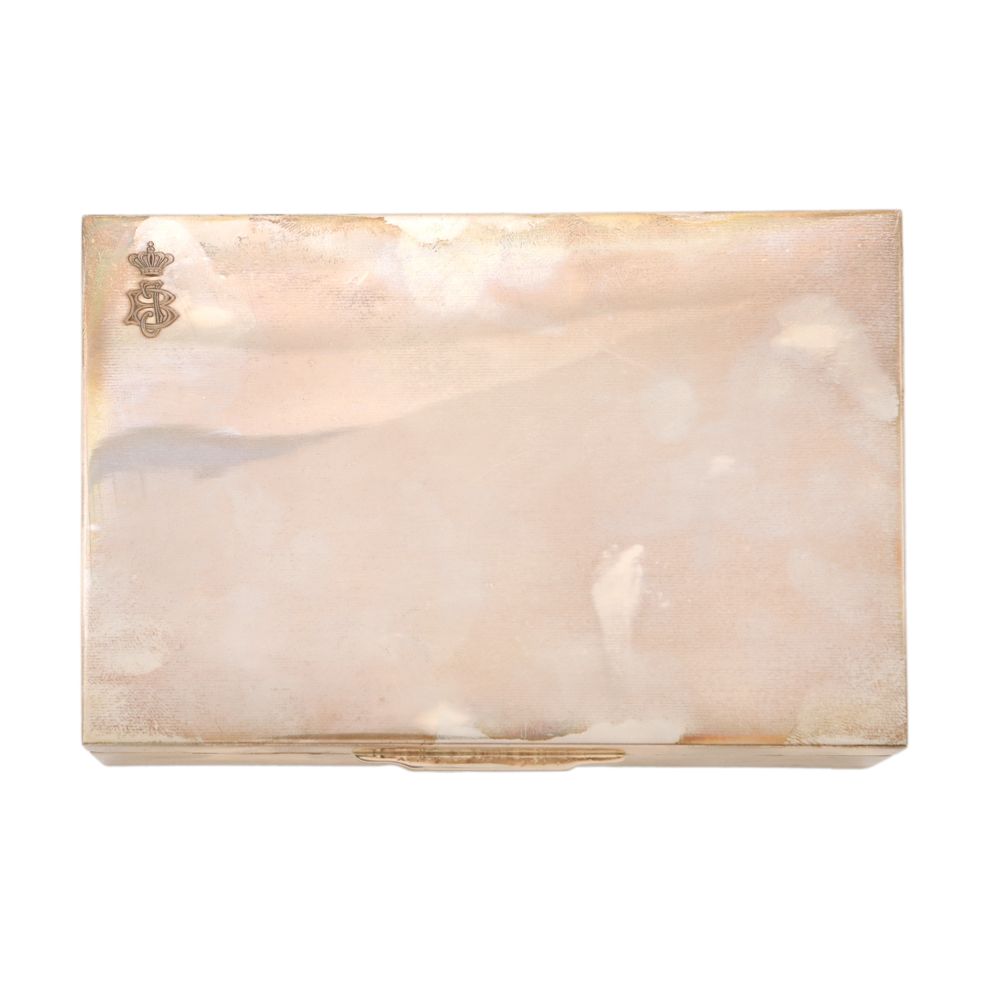 94. Cutie pentru trabucuri, din argint, purtând simbolul casei regale a Olandei, cadou de protocol, în cadrul vizitei de stat din aprilie 1973, în cutia originală [cca. 1970]