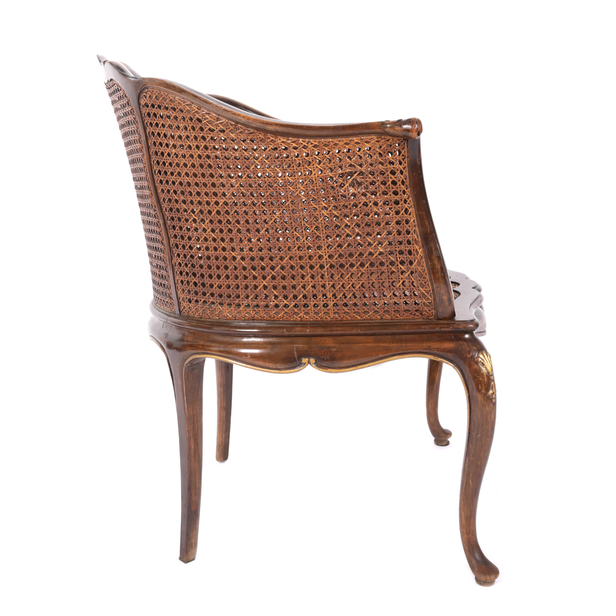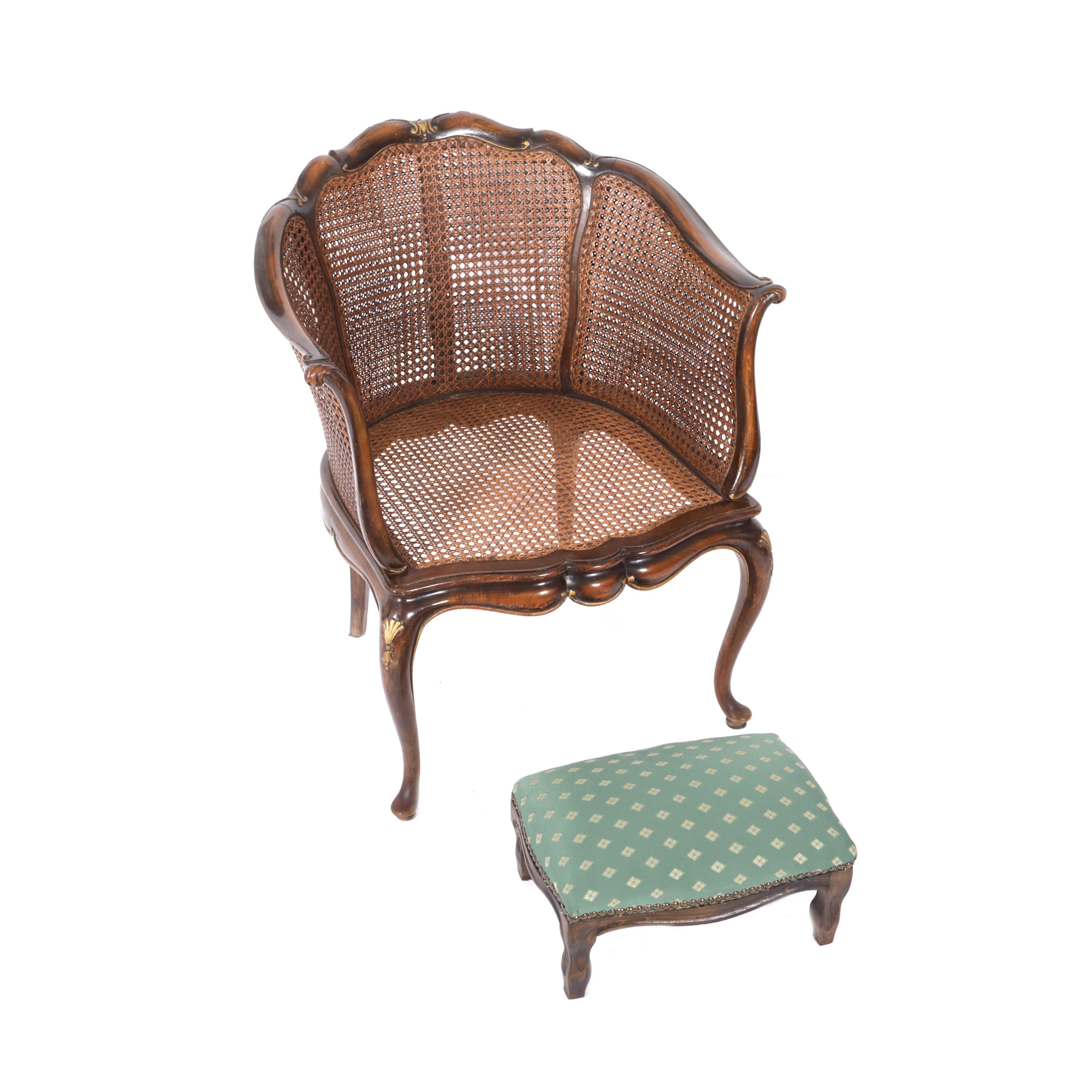 89. Fotoliu bergère în manieră Neo-Louis XV, din lemn de mahon, însoțit de mic taburet tapițat, începutul sec. XX