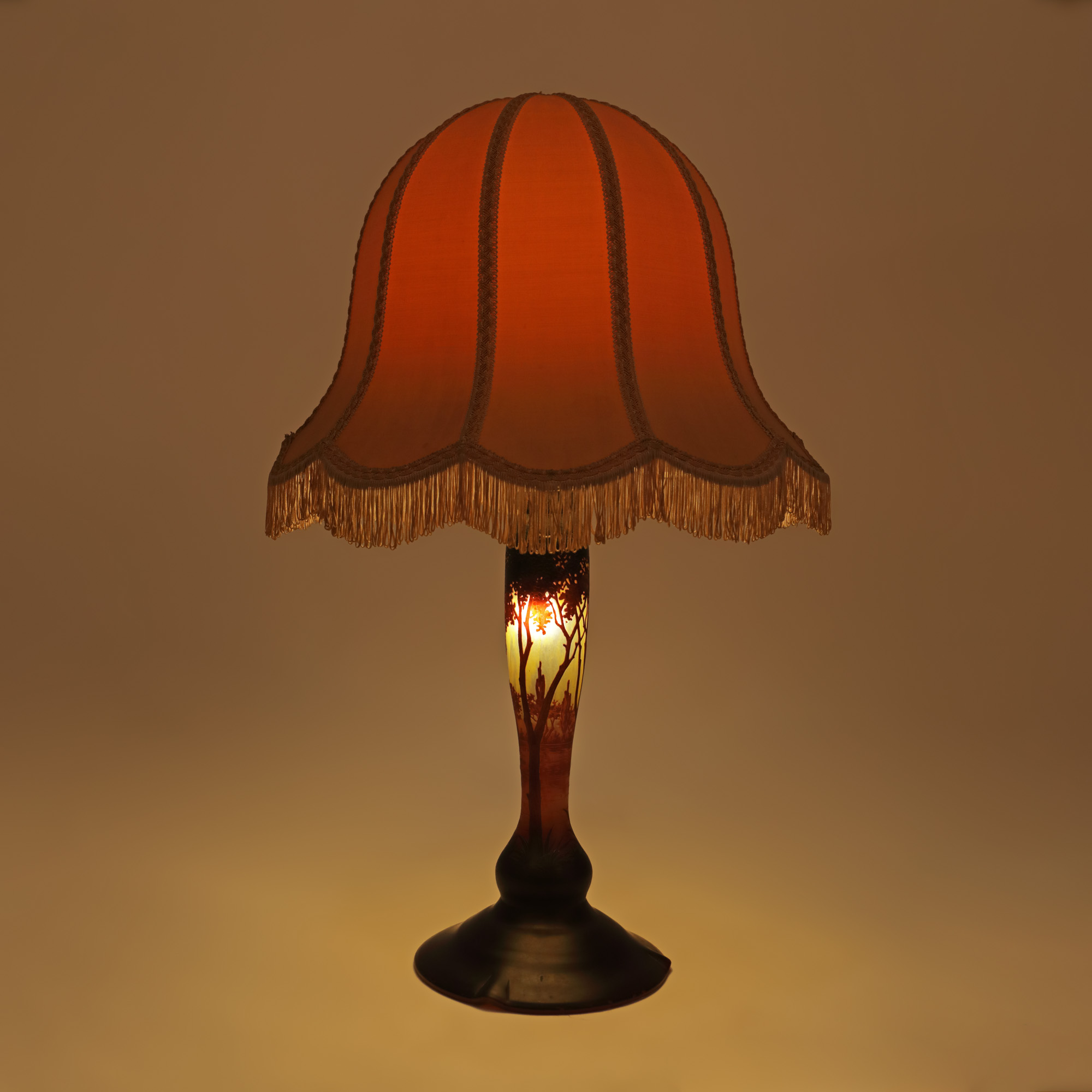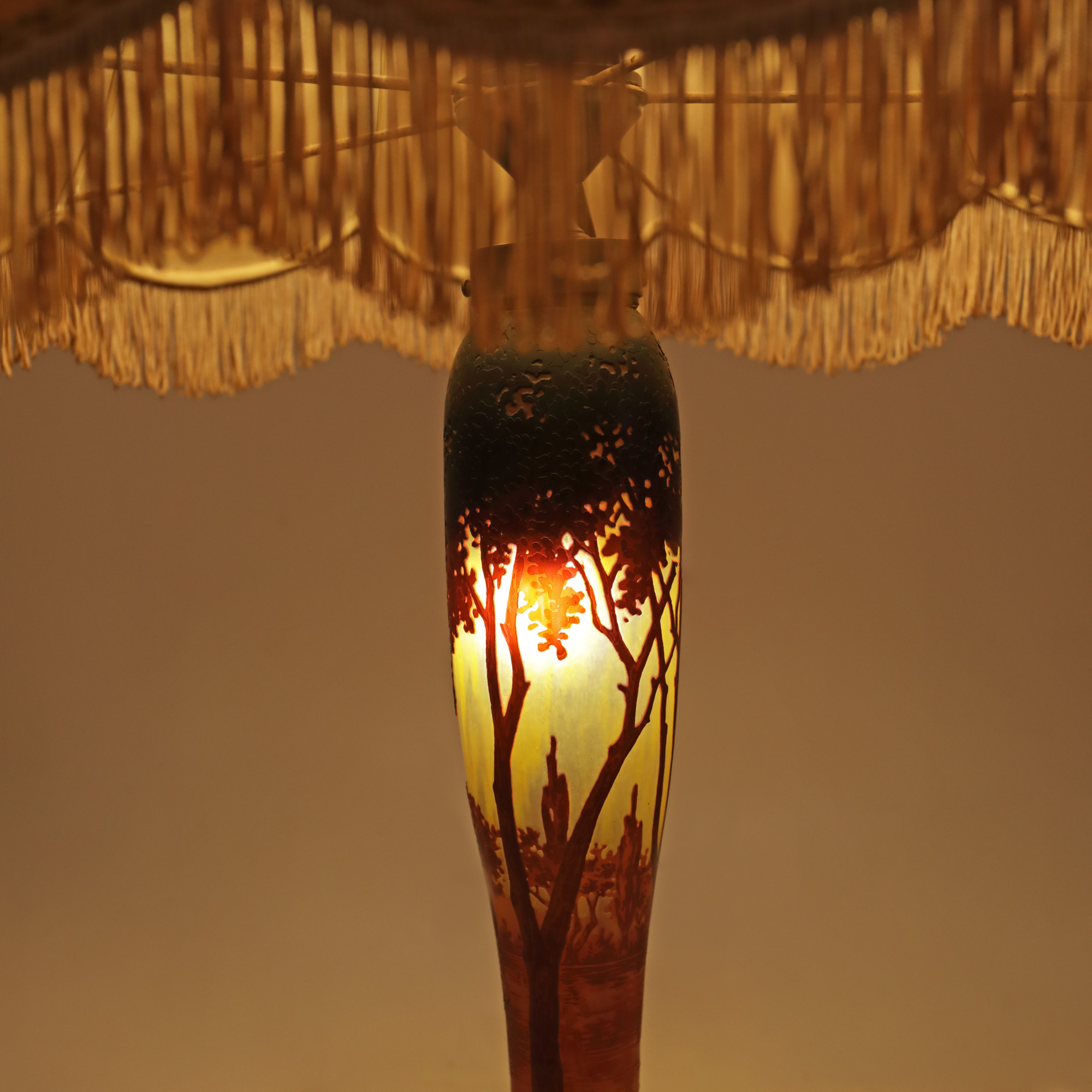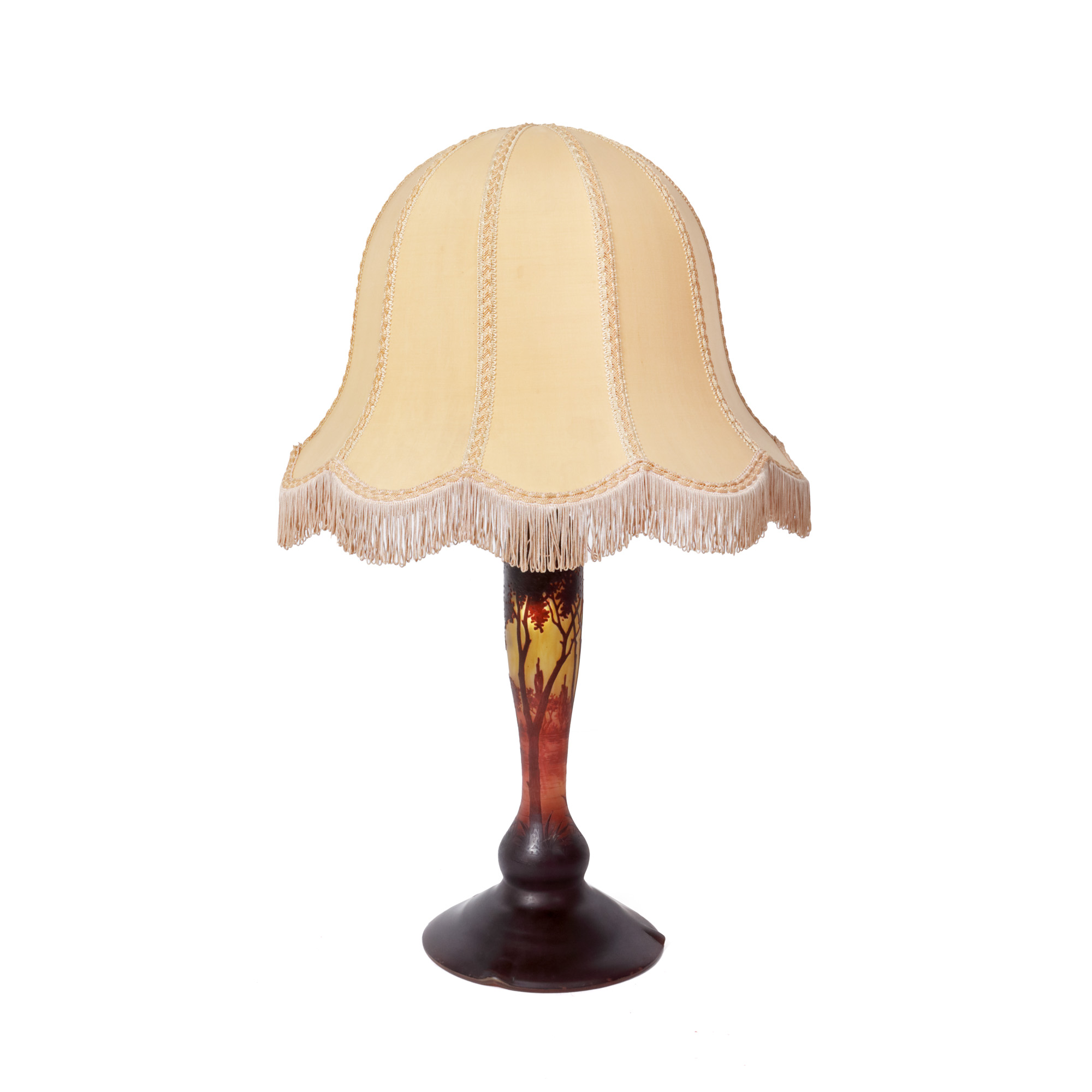 86. Lampă Daum Nancy, semnată, cu abajur din mătase, începutul sec. XX