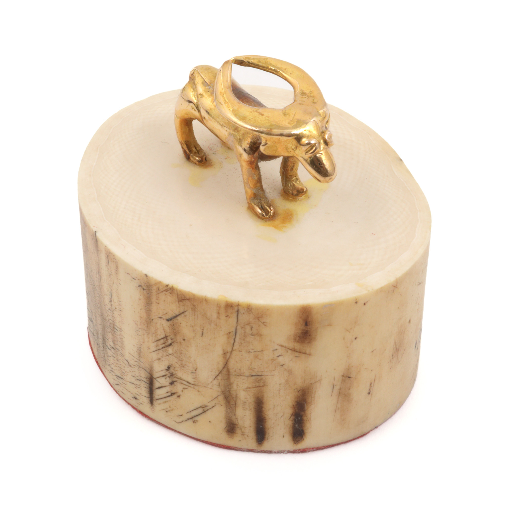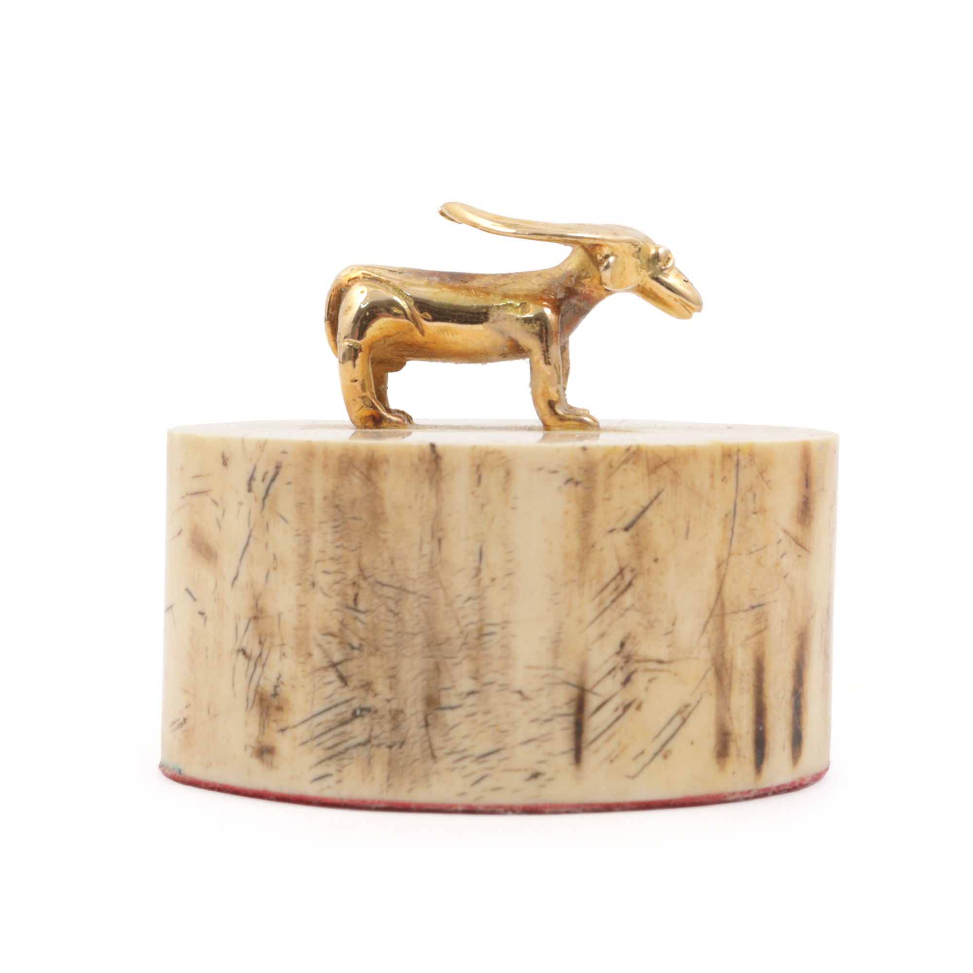 104. Presse-papier din aur reprezentând un bivol pe suport de fildeș, cadou de protocol din partea liderului Republicii Populare Chineze, Deng Xiaoping, în cadrul vizitei de stat din mai 1978 [cca. 1970]