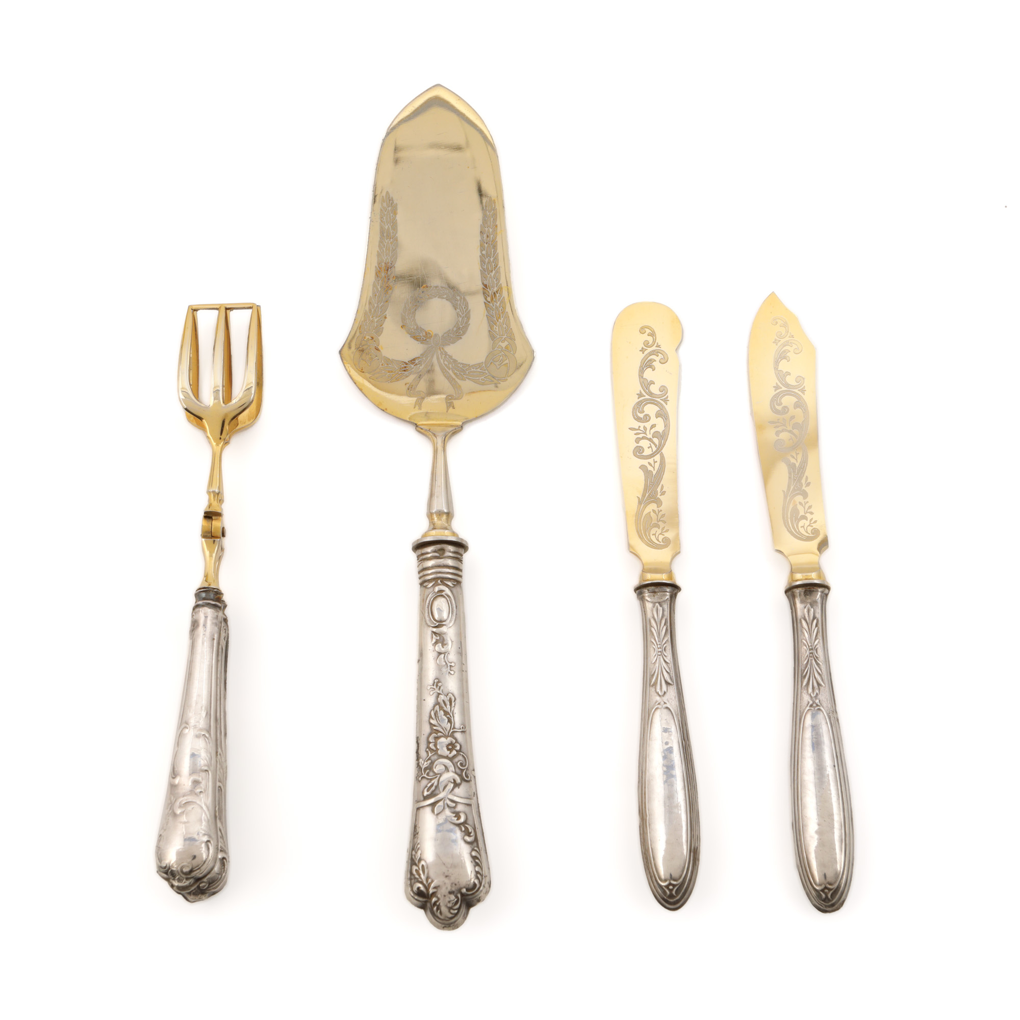122. Set de tacâmuri pentru servirea tortului, format din spatulă, clește servire și două cuțite, însoțit de cutie, prima jumătate a sec. XX