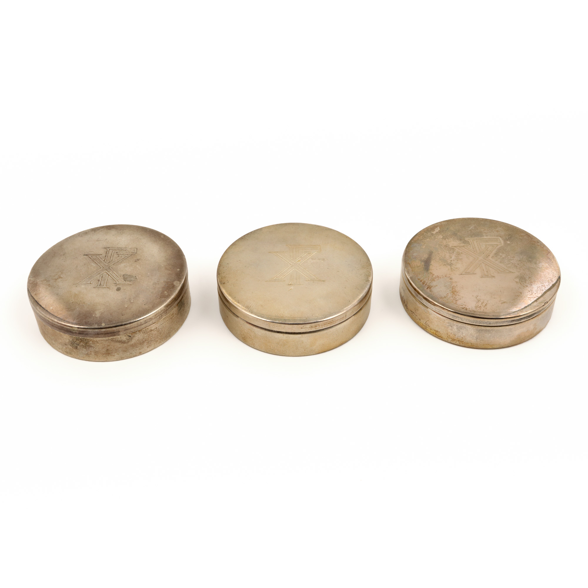 112. Set format din trei cutii din argint, pentru medicamente, decorate cu monograma creștină XP, provine din colecția ambasadorului Nicolae Ecobescu [a doua jumătate a sec. XX]
