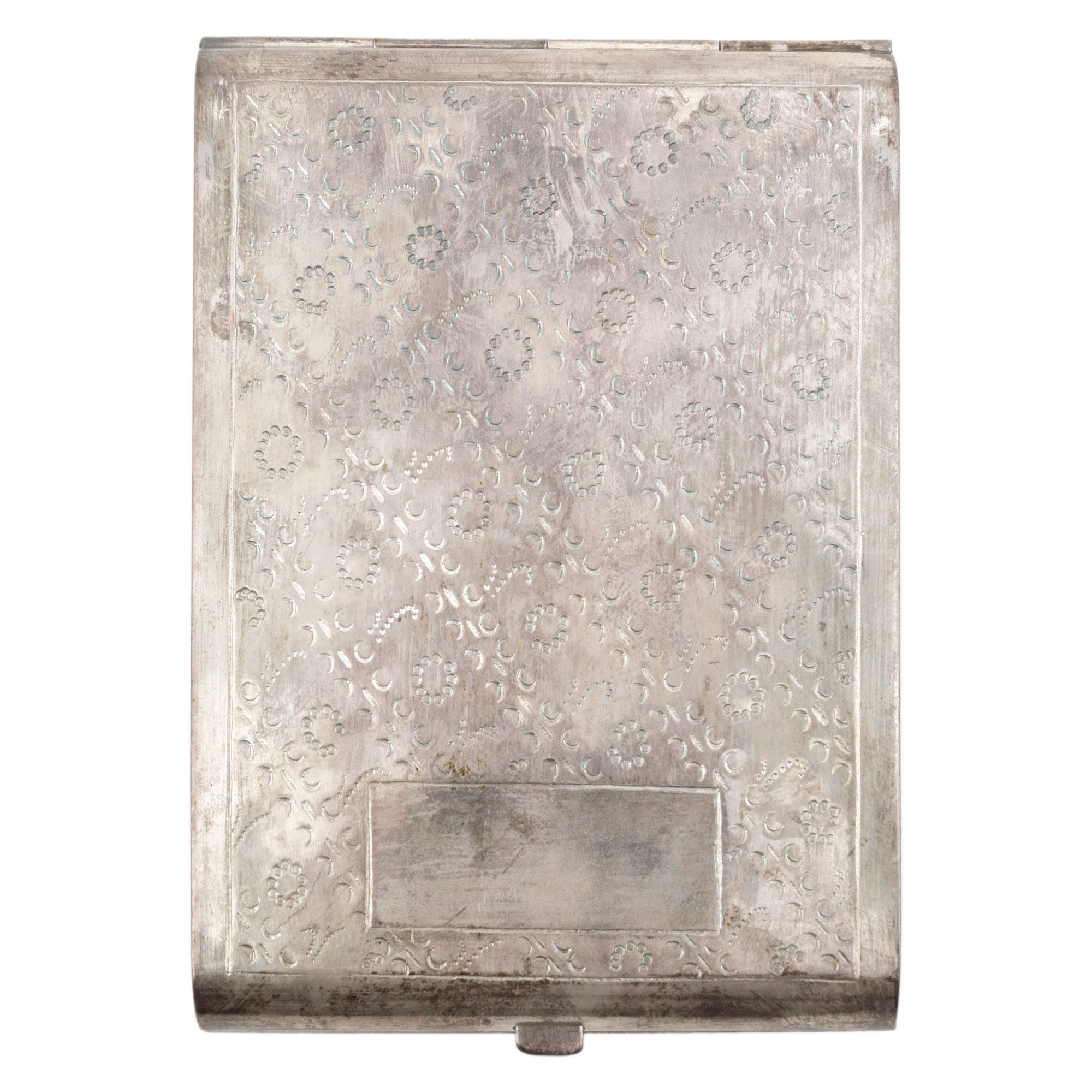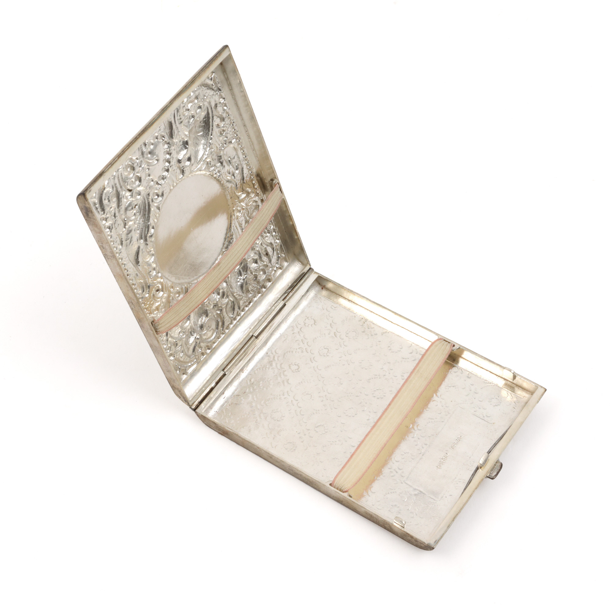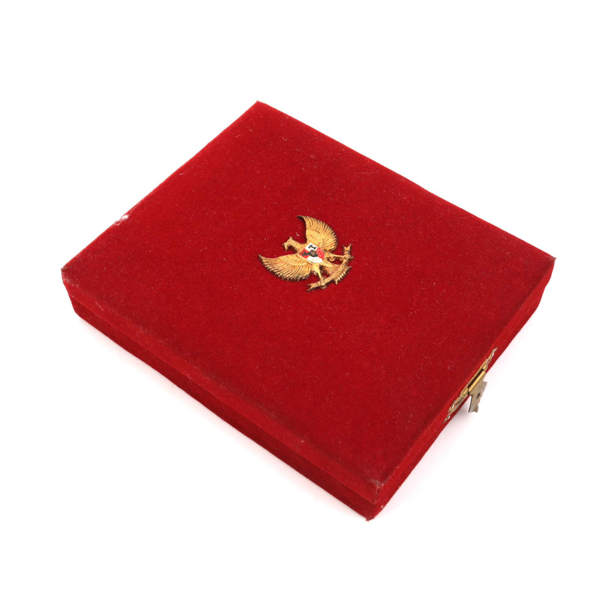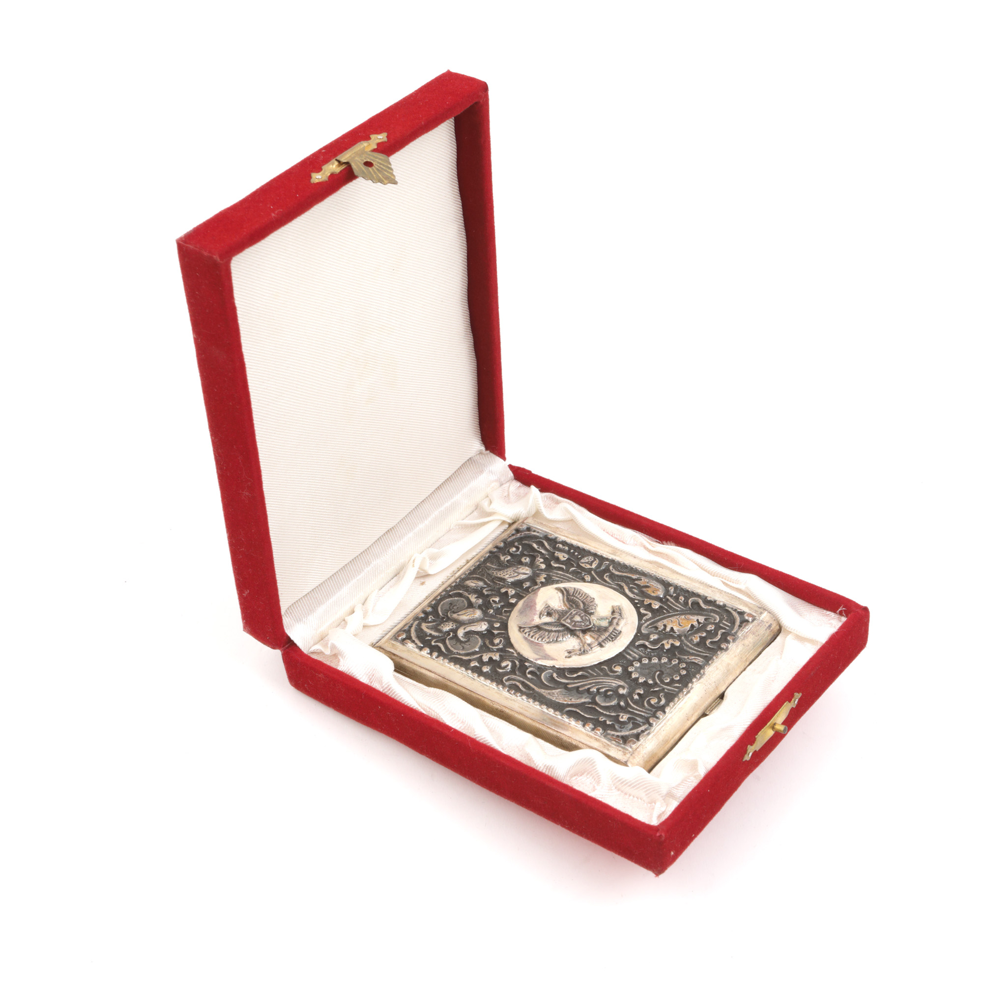 97. Tabacheră din argint, decorată cu vulturul Indoneziei, cadou de protocol din partea președintelui Republicii Indonezia, Suharto, în cadrul vizitei de stat din noiembrie 1982, în cutia originală [cca. 1970]