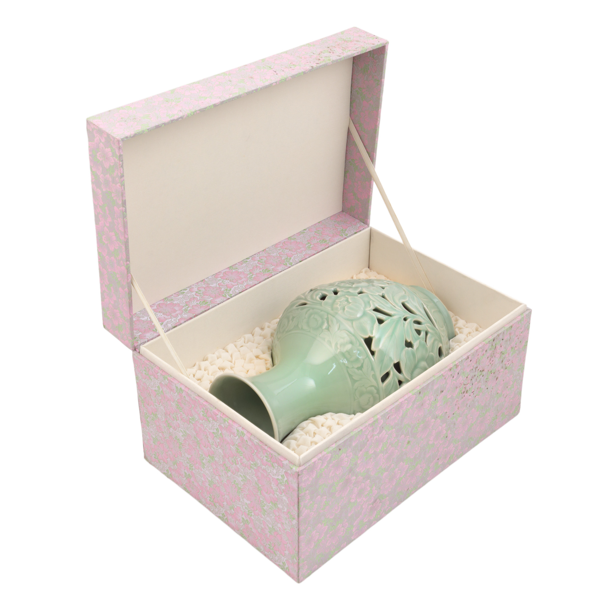 98. Vază Celadon din ceramică glazurată, cadou de protocol din partea președintelui RPD Coreea de Nord, Kim Ir-sen, în cadrul vizitei de stat din aprilie 1982, în cutia originală [a doua jumătate a sec. XX]