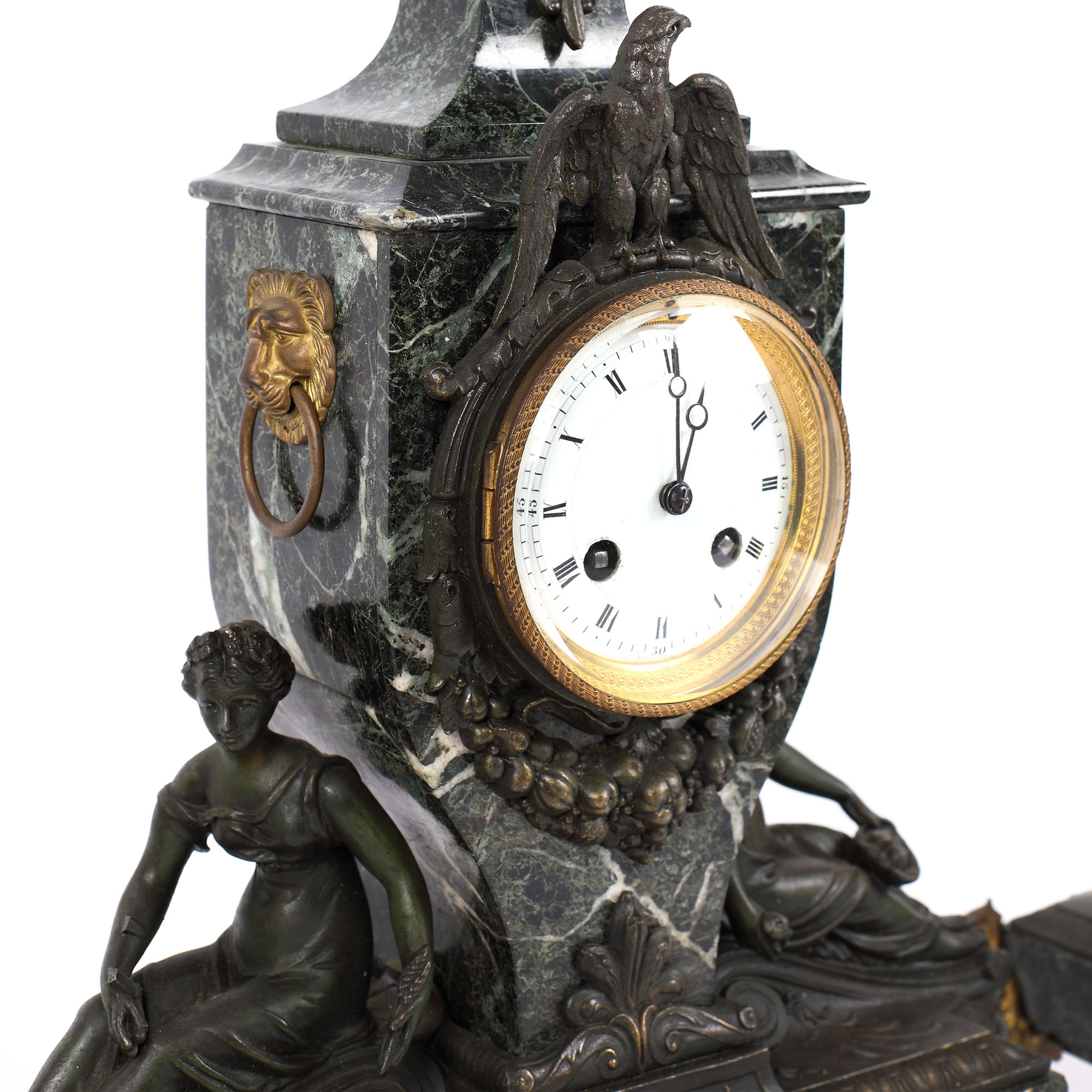 89. Ansamblu în manieră Napoleon III, pentru șemineu, format din ceas și pereche de urne decorative, din marmură vert de mer și bronz, cca. 1890